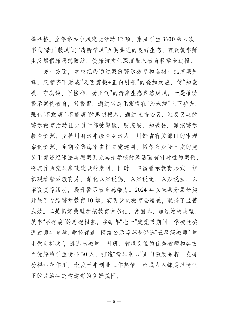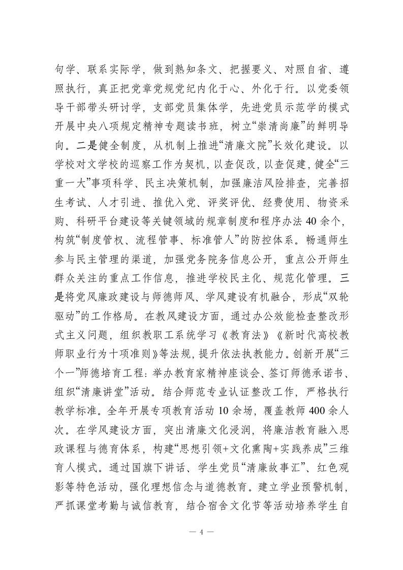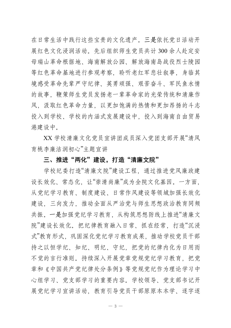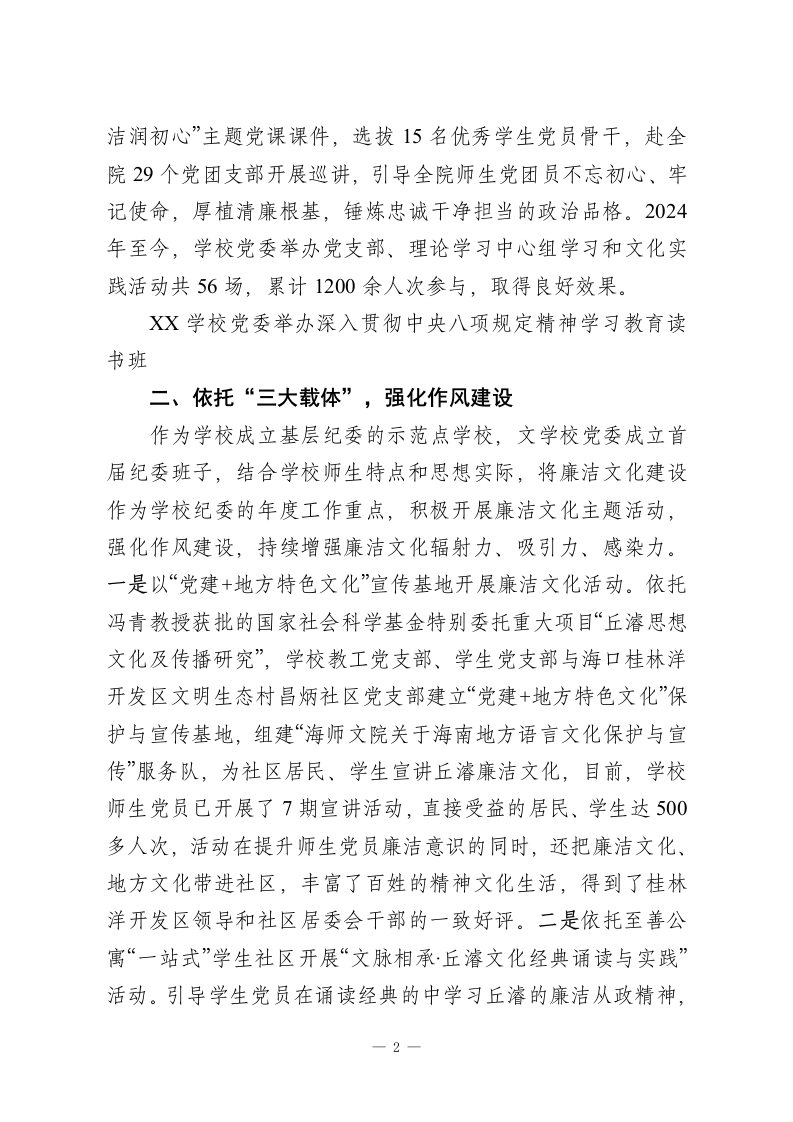 以廉洁文化铸魂树清风正气新篇XX学校深入学习贯彻党的二十大精神,将廉洁文化建设深度融入“三不腐”一体推进战略布局,着力深化理论教育筑牢思想根基、传承红色基因涵养政治品格、创新“党建+地方特色文化”建设载体激活传统底蕴、严格纪律约束扎紧制度藩篱、培树勤廉典范激扬时代新风,坚持聚焦“两个群体”、建设“三大载体”推进“两化”建设,以常抓不懈的韧劲和系统施治的举措,推动党员干部淬炼忠诚本色,砥砺初心使命,永葆清正廉洁政治本色。一、聚焦“两个群体”,深化理想信念教育学校始终将学习贯彻习近平新时代中国特色社会主义思想作为一项长期而重要的政治任务,致力于深入理解、准确把握并切实执行,指导党员干部坚定理想信念、补充精神养分、稳定思想航向。一是聚焦“关键少数”。建立健全学校党委理论学习中心组扩大会议的学习制度,坚持落实“第一议题”制度,将其纳入各支部党建督查考核内容,督促各支部及时跟进学习习近平总书记重要讲话和指示批示精神,发挥好领导干部示范带头作用。办好“清廉讲堂”活动,以理论上清醒、思想上坚定保证行动上一致。二是聚焦“最大多数”。深化主题教育成果,持续开展师生政治意识教育、对党忠诚教育、中央八项规定精神学习,督促5个党支部通过“三会一课”等形式进行研讨学习,24个团支部开展交流学习。以8位海南历史清官廉吏精神为切入点,通过“历史镜鉴+党性锤炼”双线融合,设计“清风育桃李·廉1
