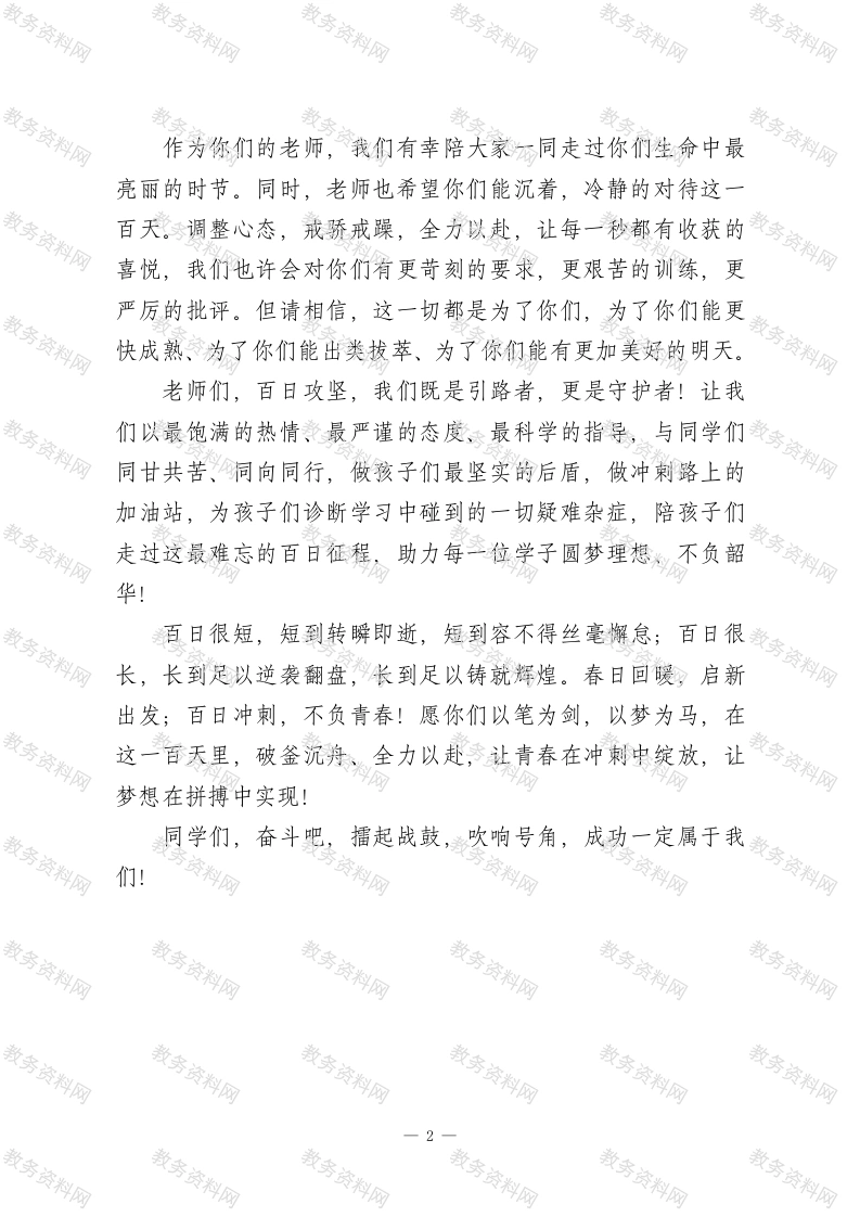 在XX一中2026届高三学子百日誓师大会上的动员讲话尊敬的各位领导、老师们,亲爱的同学们:大家上午好!当和煦的晨光已洒满校园,我们以青春为约,以奋斗为名,赴一场百日之盟一2026届高三百日誓师大会,此刻正式启航!同学们,100天,是时钟滴答的坚守,是笔尖流转的执着,更是我们从“逐梦”走向“圆梦”的最后一公里,是十二年寒窗,最滚烫、最耀眼的冲刺征程!这一百天,我们不是孤军奋战的追光者,而是并肩前行的同行人;这一百天,不是枯燥重复的刷题时光,而是破茧成蝶、改写命运的黄金赛道。回望过往,一千多个日夜,你们以星光为伴、以笔墨为刃,书桌前的灯火从未熄灭,试卷上的批注日益厚重一这份坚守,值得所有掌声;这份执着,终将不负时光!在这仅剩的一百天里,你们又怎会轻言放弃呢?请相信自己:洒下的辛勤汗水,必将灌溉出参天大树;尝过的无穷苦涩,必将孕育出甘甜的果实,不悔曾经的付出,才能坚持当下。同学们,一百天,它是2400个小时,14万4千分钟,在这14万4千分钟里,我们完全可以创造奇迹。只要我们不忘初心,坚持最初的选择,不要怀疑,不要犹豫,更不要放弃。2026年的春与夏,注定将是你们人生中极不平凡的一段时光,在这段时光里,不怕痛,不喊累,默默蜕变,勇敢振翼,像一枚蚕茧羽化成蝶,色彩斑斓。一1