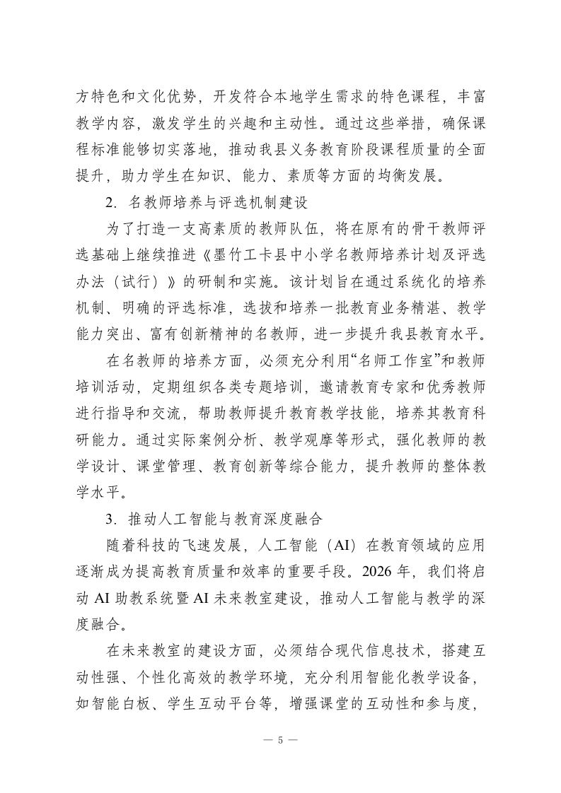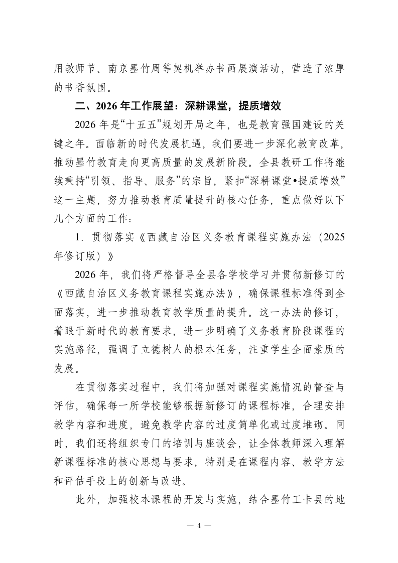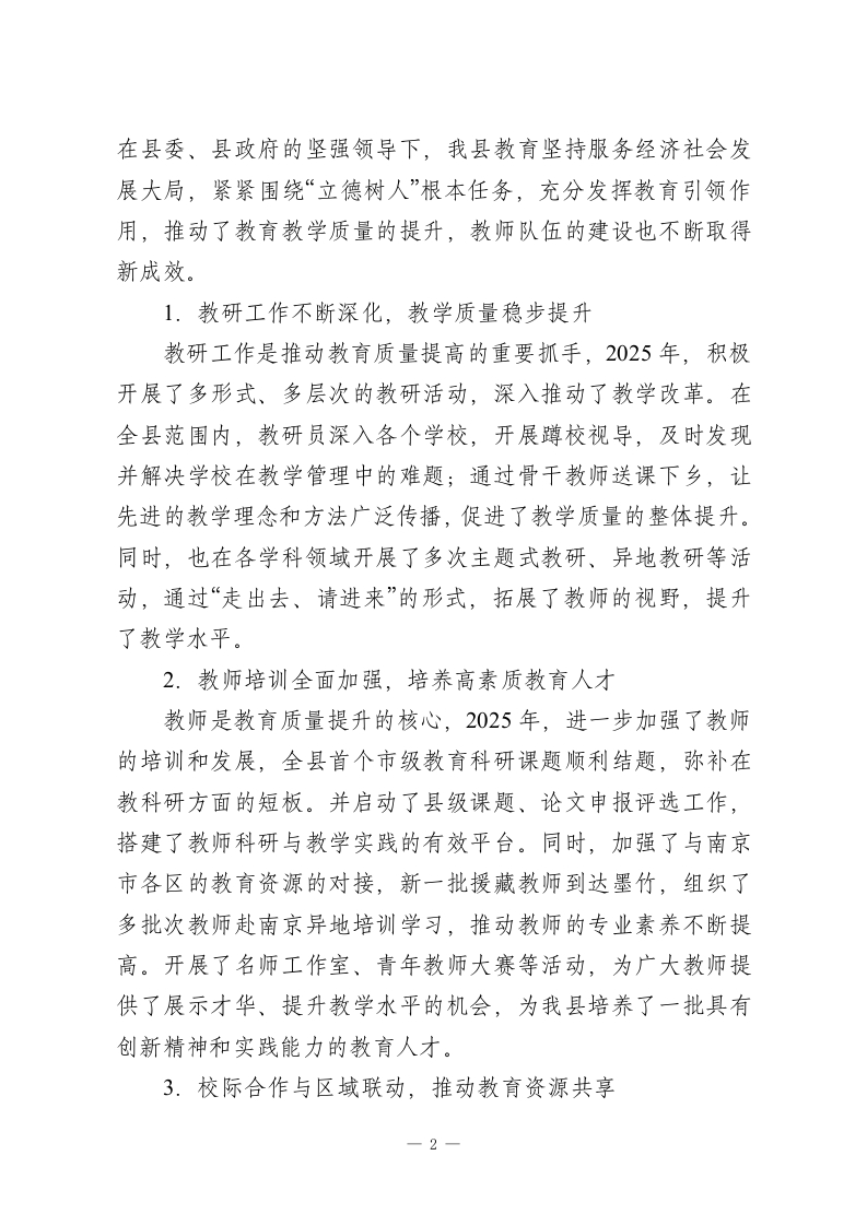 在全县教研工作会议上的讲话:推动墨竹教育高质量发展的新步伐各位校长、老师们:大家好!在这春回大地、万象更新的季节里,我们齐聚一堂,召开2026年全县教研工作会议。我们站在新的起点上,面对新的机遇与挑战,要肩负起推动墨竹教育事业高质量发展的责任。党中央和习近平总书记对教育的高度重视为我们指明了前进方向。习近平总书记在全国教育大会上明确指出:“教育是国之大计、党之大计。”这为我们进一步推动教育事业的发展提供了科学指导。总书记还强调,要落实立德树人根本任务,培养德才兼备的新时代接班人,教育不仅仅是知识的传授,更是全面培养学生综合素质、塑造其人格的重要途径。在过去的一年里,尽管取得了一定的成绩,但我们清醒地认识到,教育事业仍面临着许多新的挑战和任务。2026年,全县教研工作将继续秉持“深耕课堂•提质增效”的主题,进一步深化课堂教学改革,注重教学内容和方法的创新,提高教师的专业素养和教学水平。同时,不断强化教育内涵建设,推动教育公平与质量同步提升,以实际行动落实习近平总书记的教育方针。站在新的发展起点,我们要锐意进取,推动墨竹教育事业不断迈向新的高峰。一、2025年工作总结:稳步前行,成绩斐然过去的一年里,全县教育事业在各方面取得了显著进展。1