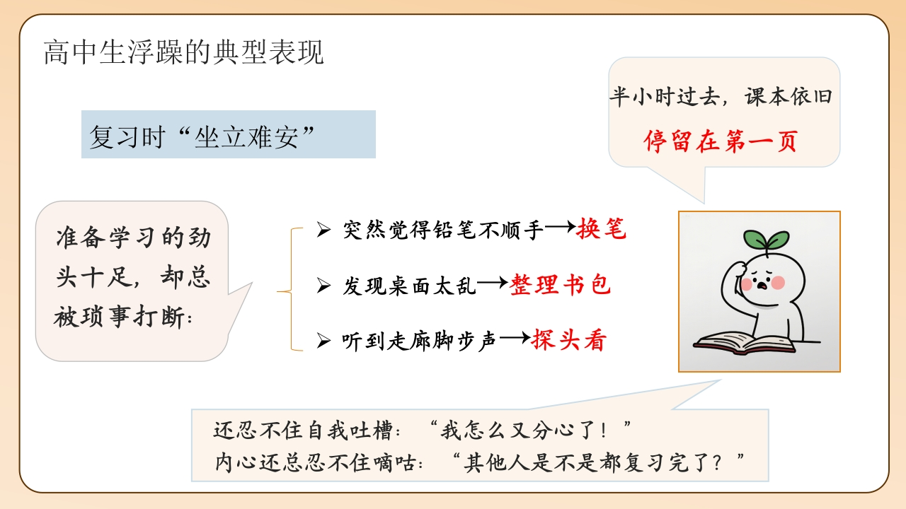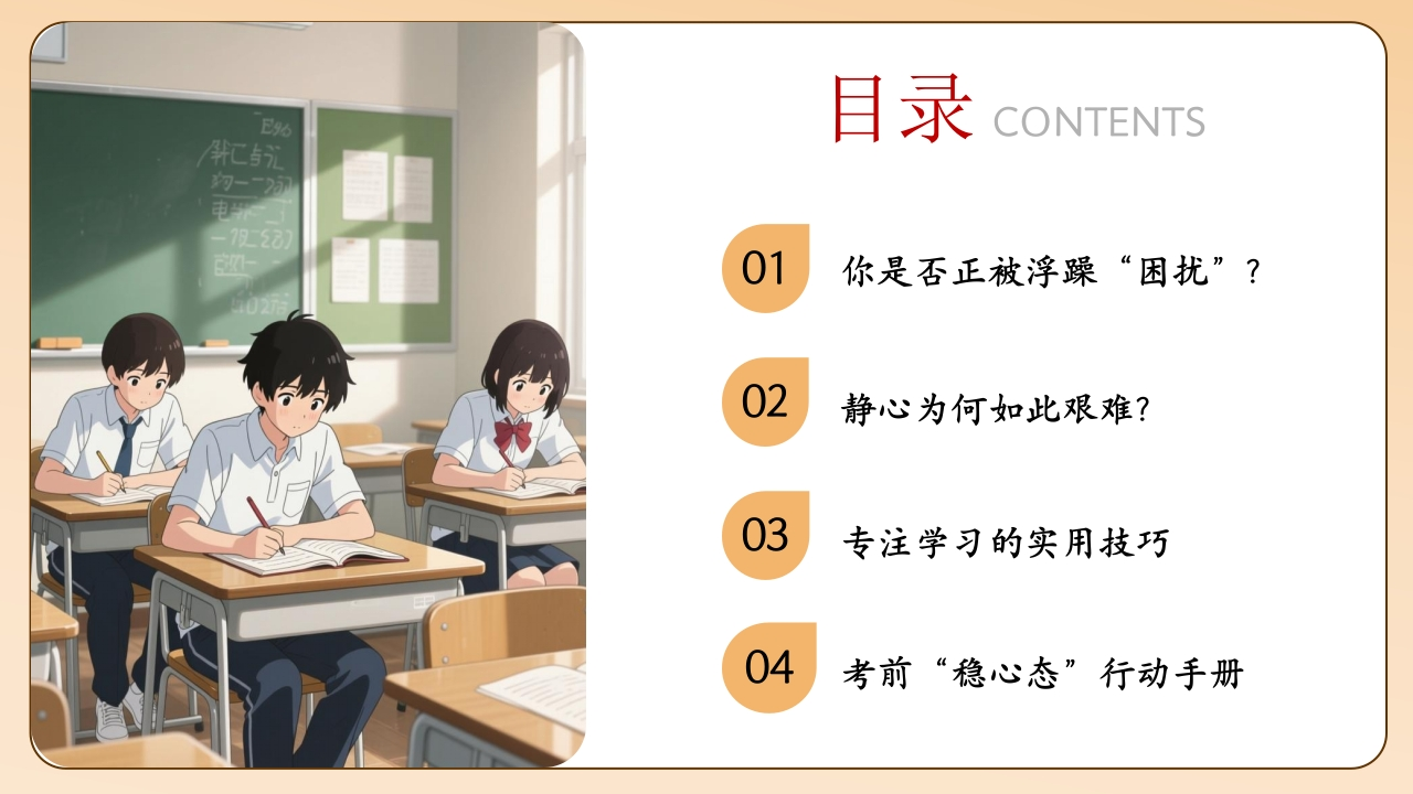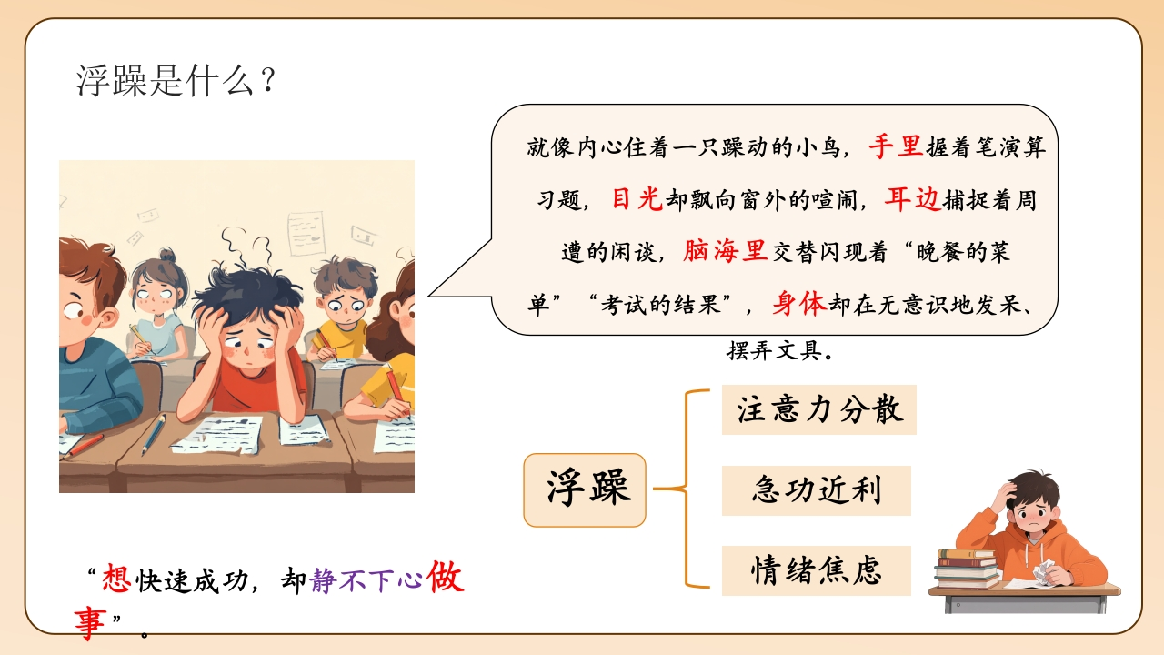 【高中】【考前复习】抗浮躁主题班会:从“心浮气躁”到“潜心向学”tangqi8816小时前发布关注私信63.94MB30页03212 第1页 / 共30页 第2页 / 共30页 第3页 / 共30页 第4页 / 共30页 第5页 / 共30页 试读已结束,还剩25页,您可下载完整版后进行离线阅读 【高中】【考前复习】抗浮躁主题班会:从“心浮气躁”到“潜心向学”此内容为付费资源,请付费后查看¥9.9¥19.9VIP会员免费立即购买您当前未登录!建议登陆后购买,可保存购买订单付费资源© 版权声明本站是一个信息分享及获取的平台,不确保部分用户上传资料的来源及知识产权归属,资料由老师投稿,公开渠道整理,网友上传,如果侵犯到您的权益,请联系客服删除THE ENDPPT课件 文本预览 当下的每一份专注,终将成就未来的从容绽放!从“心浮气躁到“潜心向学一高中生考前复习抗浮躁主题班会教师:X老师时间:202X年X月 查看更多 收起部分 喜欢就支持一下吧点赞12 分享QQ空间微博QQ好友海报分享复制链接收藏
