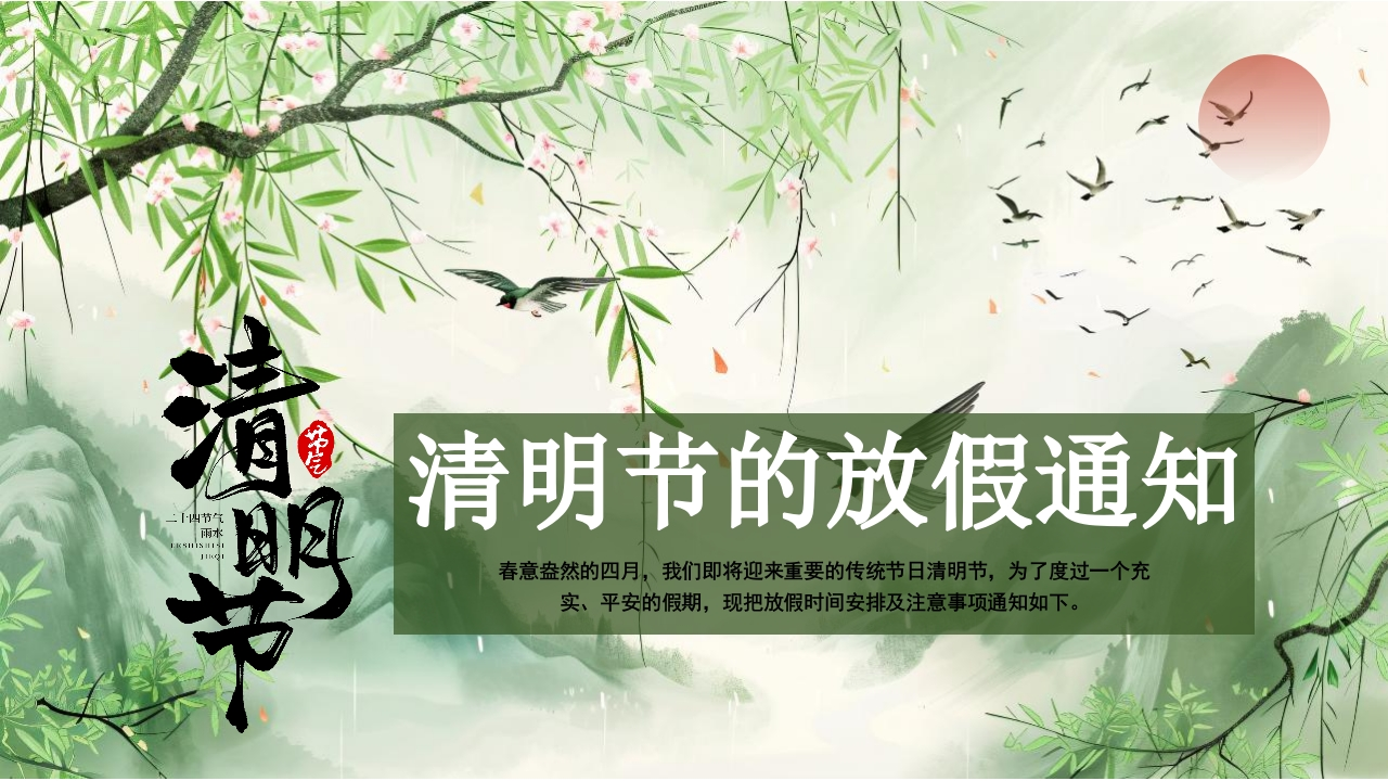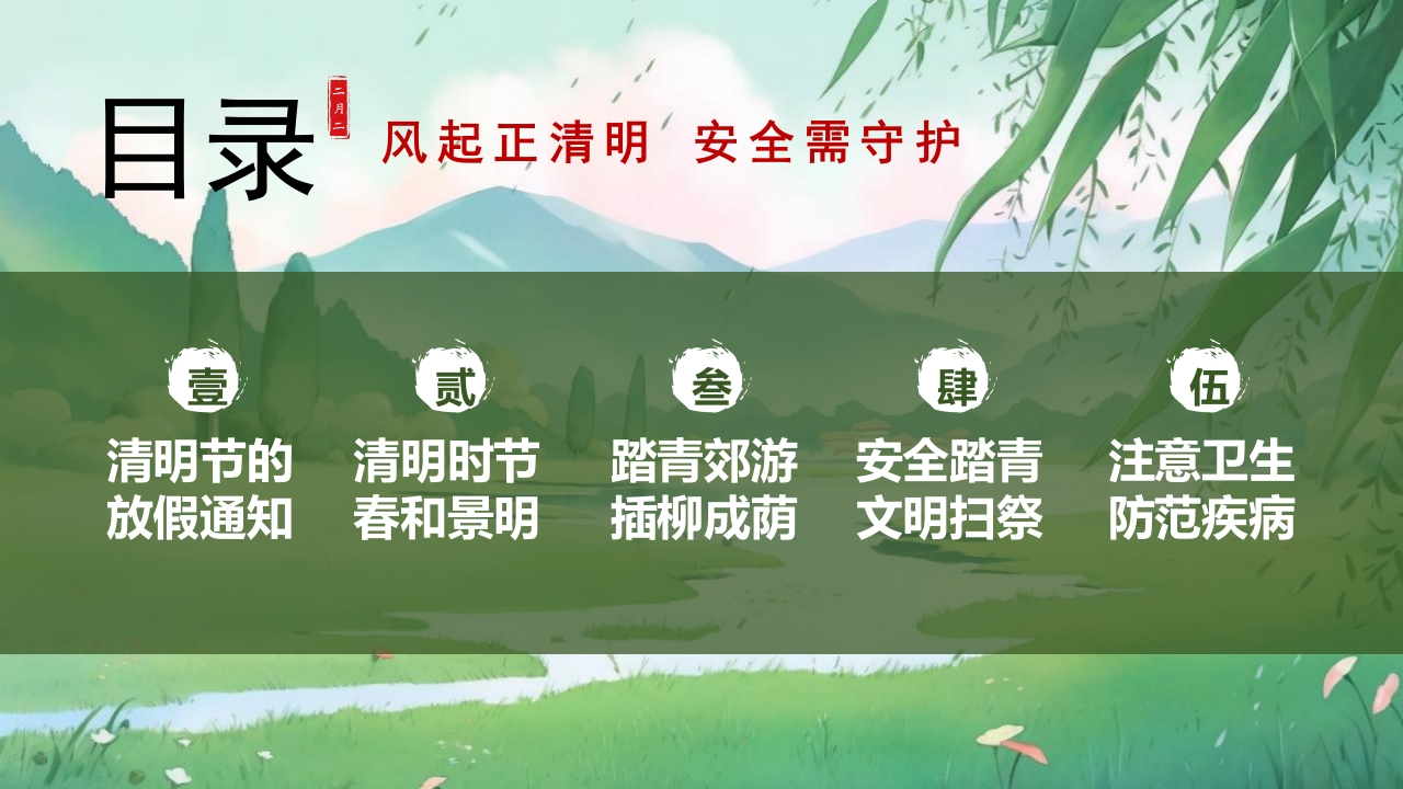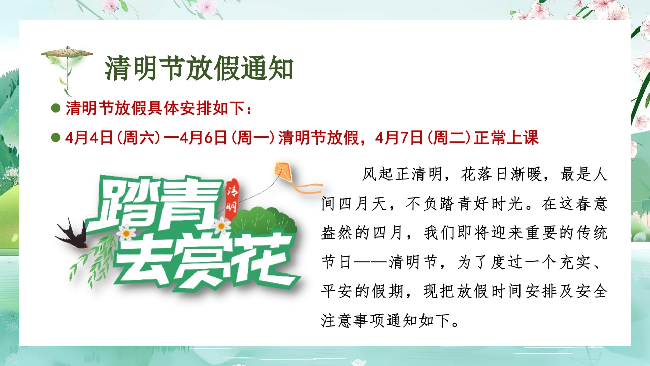 【通用】【清明节】【安全教育】主题班会:清明假期安全不缺席tangqi8816小时前发布关注私信2.45MB23页04814 第1页 / 共23页 第2页 / 共23页 第3页 / 共23页 第4页 / 共23页 第5页 / 共23页 试读已结束,还剩18页,您可下载完整版后进行离线阅读 【通用】【清明节】【安全教育】主题班会:清明假期安全不缺席此内容为付费资源,请付费后查看¥9.9¥19.9VIP会员免费立即购买您当前未登录!建议登陆后购买,可保存购买订单付费资源© 版权声明本站是一个信息分享及获取的平台,不确保部分用户上传资料的来源及知识产权归属,资料由老师投稿,公开渠道整理,网友上传,如果侵犯到您的权益,请联系客服删除THE ENDPPT课件 文本预览 清/明/节/放/假/安/排/通/知清明假期安全不缺席目EEE风/起/正/清/明安/全/需/守/护春意盎然的四月,我们即将迎来重要的传统节日清明节,为了度过一个充实、平安的假期,现把放假时间安排及注意事项通知如下。主讲:时间: 查看更多 收起部分 喜欢就支持一下吧点赞14 分享QQ空间微博QQ好友海报分享复制链接收藏