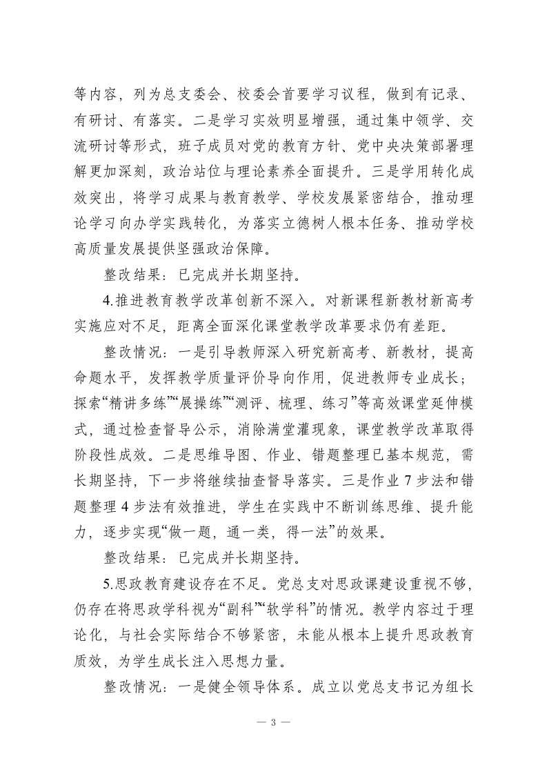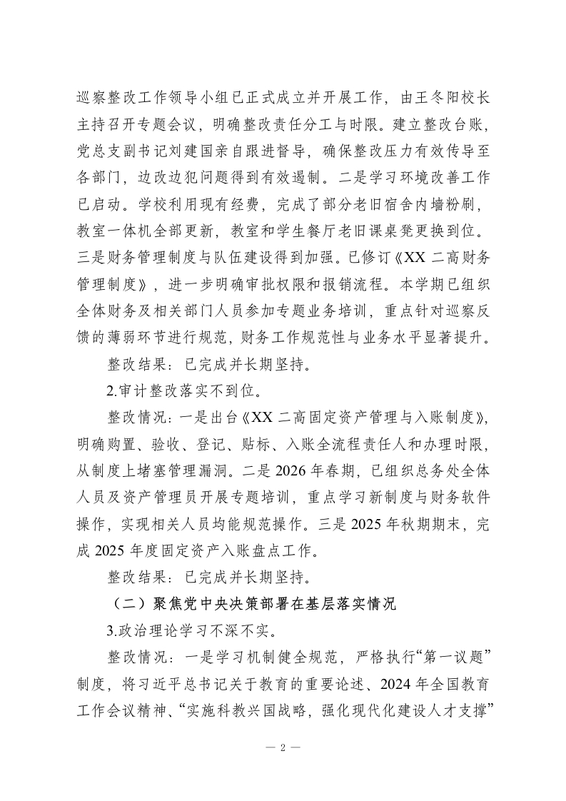 XX县第二高级中学总支部委员会关于县委巡察整改进展情况的报告根据县委统一部署,2025年X月XX日至2025年XX月XX日,县委第十巡察组对县二高党总支进行了为期两个月的巡察“回头看”,并于2025年XX月XX日向县二高党总支反馈了巡察意见。按照巡察工作有关要求,现将巡察整改进展情况报告如下。一、党总支及主要负责同志组织落实整改情况成立由校长任组长、班子成员任副组长的巡察整改工作领导小组,确保整改工作部署到位、责任到人、落实到位。自收到县委第十巡察组巡察反馈意见以来,学校党总支、校委会召开巡察整改专题会议5次,专题民主生活会1次,专题研究和部署整改落实工作,坚决做到紧盯问题、步步为营、务求实效。党总支研究出台了《中共XX县第二高级中学总支部委员会关于县委第十巡察组巡察“回头看”反馈意见的整改落实方案》,制定了整改工作台账,认真对照反馈的4个方面问题,细化整改措施,逐一明确责任领导、责任部门、整改措施和整改时限,确保各整改事项有序推进、落地落实。二、集中整改进展情况(一)推动问题整改落实情况1.巡察整改落实不到位。党总支对上轮巡察反馈问题整改主体责任压力传导不够,存在边改边犯情况。整改情况:一是主体责任得到压实,整改机制初步形成。1