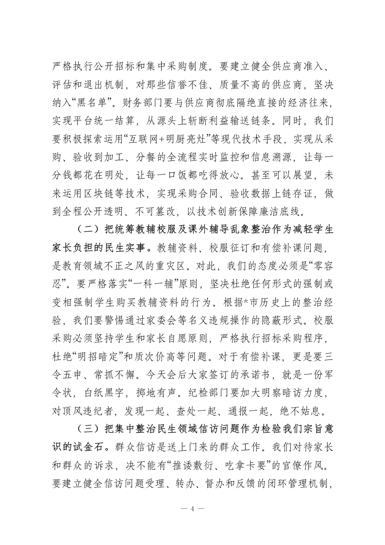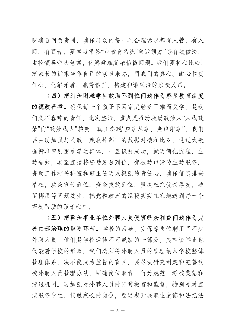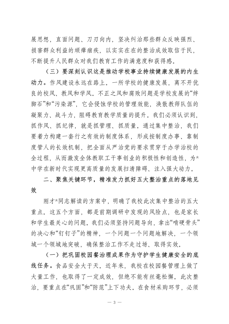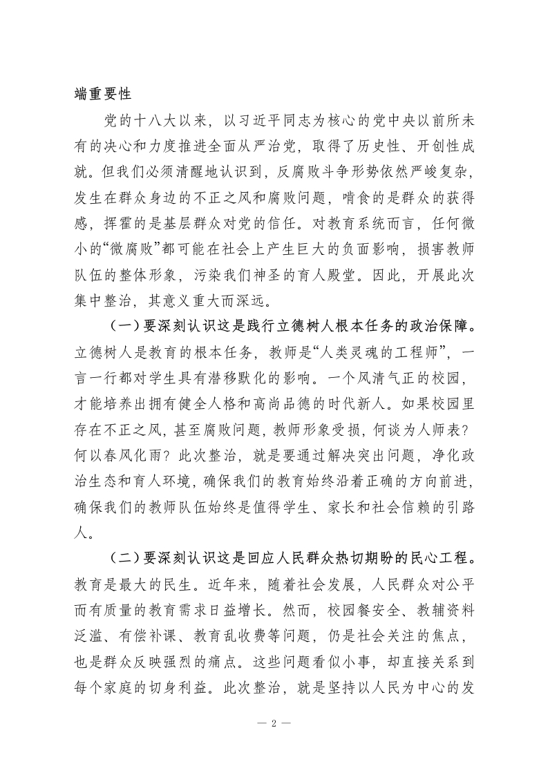 在2026年全校群众身边不正之风和腐败问题集中整治攻坚战行动推进会上的讲话同志们:今天,我们在这里隆重召开*中学群众身边不正之风和腐败问题集中整治攻坚战行动推进会,主要任务是深入学习贯彻上级关于全面从严治党向纵深发展、向基层延伸的决策部署,对我校集中整治工作进行再动员、再部署、再落实。刚才,*已经对《2026年*中学群众身边不正之风和腐败问题集中整治攻坚战行动工作方案》进行了全面而细致地解读,方案内容翔实、目标明确、措施具体,希望大家深刻领会,认真抓好贯彻执行。百年大计,教育为本;教育大计,教师为本。我们所处的岗位,一头连着万千家庭的期盼,一头连着国家民族的未来,责任无比重大,使命无上光荣。营造一个风清气正的育人环境,不仅是办好人民满意的教育的内在要求,更是我们每一位教育工作者必须坚守的职业底线和政治操守。此次集中整治,是上级党委部署的一项重要政治任务,也是回应社会关切、解决师生家长急难愁盼问题、推动我校高质量发展的必然要求。这既是一场深刻的自我革命,也是对我们全体教职工党性修得、师德修养和责任担当的集中检验。全校上下必须统一思想、提高站位,以高度的政治自觉、思想自觉和行动自觉,投身到这场正风肃纪的攻坚战中来。下面,结合学校工作实际,我再讲三点意见。一、提高政治站位,深刻认识开展集中整治攻坚行动的极—1