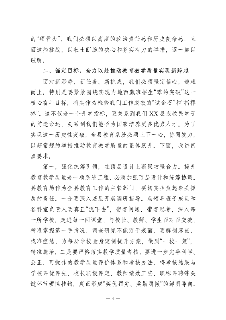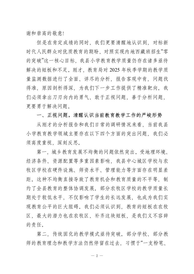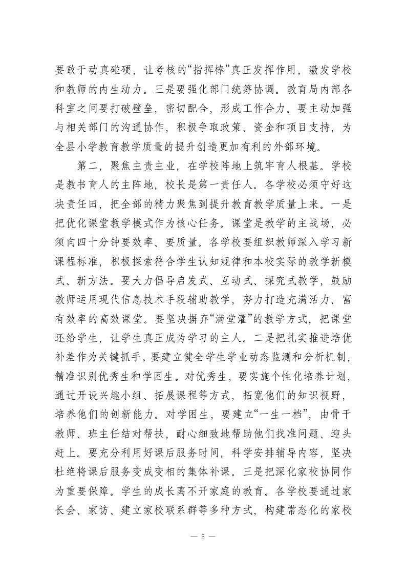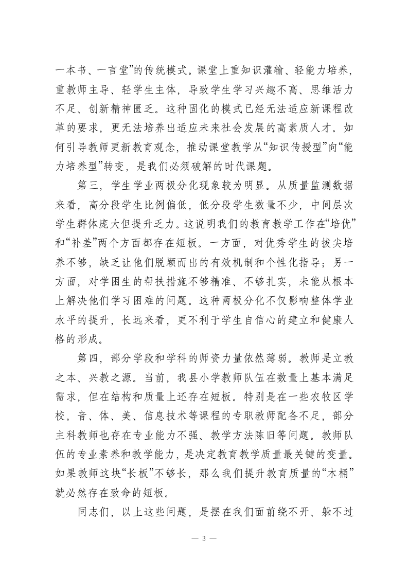 在全县提升小学教育教学质量专题会上的讲话同志们:今天,我们在这里召开全县提升小学教育教学质量专题会议,主要任务是深入贯彻落实2026年全国、全区教育工作会议精神,全面复盘2025年秋季学期我县小学教育教学的各项工作,系统分析当前面临的瓶颈与挑战,并对下一阶段的重点任务进行全面部署。今天的会议,既是一次回顾总结的“复盘会”,更是一次直面问题、迎难而上的“动员会”和“部署会”。参加今天会议的有县教育局的领导班子成员和各科室负责人,以及来自全县各小学的校长、教学副校长、教研室负责人、学科组长和骨干教师代表。大家都是我们XX县基础教育战线的核心力量和中坚骨干。我们齐聚一堂,目的就是统一思想、凝聚共识、明确方向、压实责任,共同吹响推动XX县小学教育教学高质量发展的冲锋号。教育是国之大计、党之大计,关系着千家万户的幸福,承载着XX县发展的未来。县委、县政府始终将教育摆在优先发展的战略位置,特别是小学教育,作为国民教育体系的基石,其质量高低直接决定了我们培养时代新人的起点和底色。近年来,在全体教育工作者的共同努力下,我县小学教育事业取得了长足进步,办学条件持续改善,教师队伍不断壮大,教育教学秩序整体平稳。这些成绩的取得,凝聚了在座各位以及全县广大教师的心血与汗水,我代表县政府,向大家表示衷心的感1