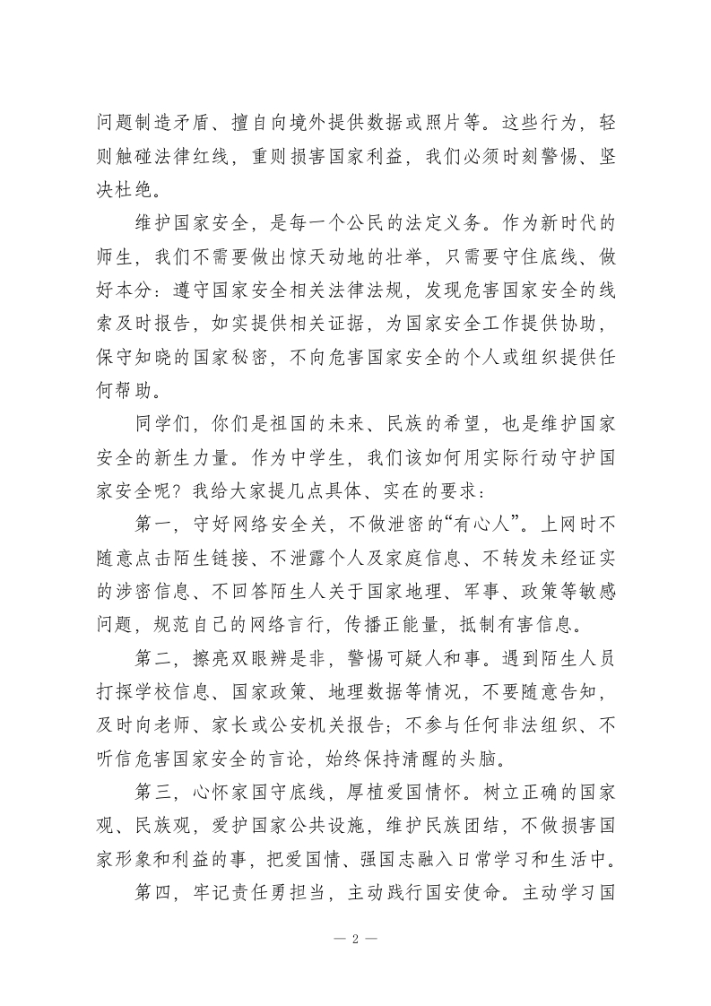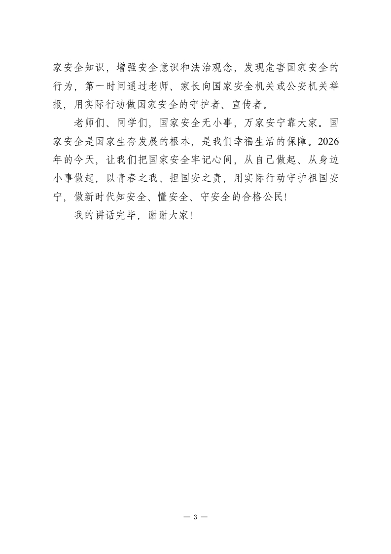 4月15全民国家安全教育日国旗下校长讲话:国安护万家,青春勇担当老师们、同学们:大家早上好!今天是2026年4月15日,我们迎来了第11个全民国家安全教育日。提到“国家安全”,很多同学会觉得这是宏大、遥远的话题,是国家层面的大事,和我们的校园生活、日常学习没什么关系。但我想告诉大家:国家安全从来都不是抽象的概念,它藏在我们的网络言行里、藏在信息保护中、藏在校园安全的每一处细节里,与每一位师生、每一个家庭都息息相关。2015年7月1日,《中华人民共和国国家安全法》正式颁布,将每年4月15日设立为全民国家安全教育日,目的就是让国家安全意识深入人心,让每一位公民都明白:守护国家安全,就是守护我们自己的幸福生活。国家安全,简单来说,就是国家的政权、主权、领土完整不受侵犯,人民的生活安稳幸福,社会、经济、文化、生态、网络等各领域都处于安全稳定的状态。小到我们的校园安全、网络信息安全,大到国家领土、军事、经济安全,都是国家安全的重要组成部分。它不是遥不可及的“大事件”,而是我们每天都能感受到的平安与安宁。在日常生活中,有些行为看似不起眼,却可能危害国家安全。比如:参加非法组织、泄露国家秘密、在网络上传播危害国家利益的言论、被境外人员诱导打探信息、利用宗教或民族1