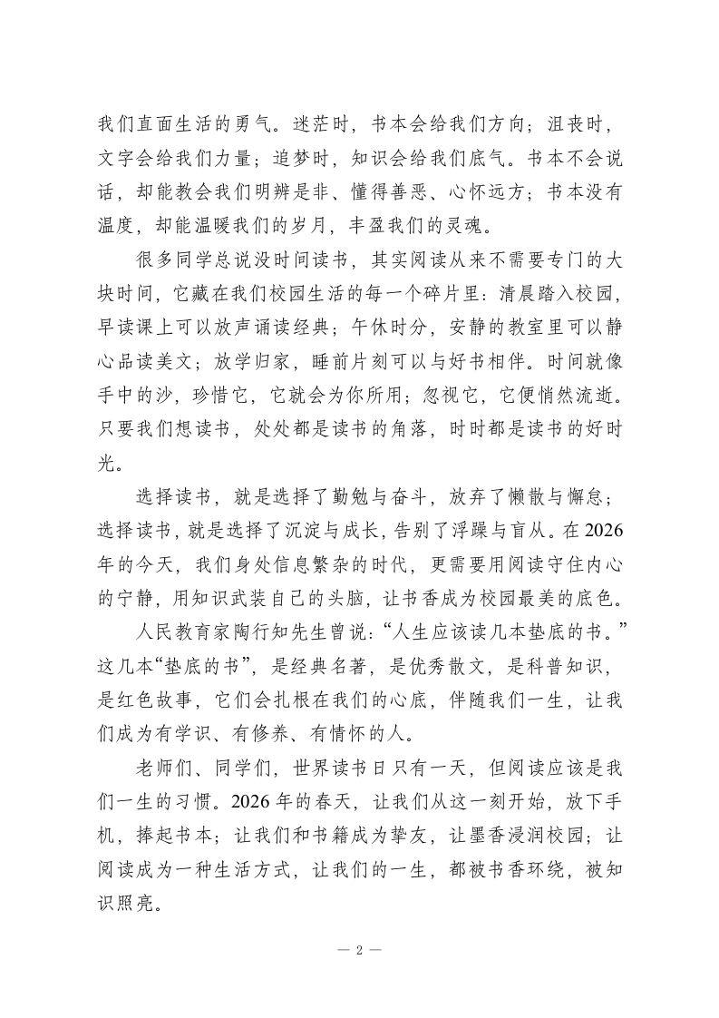 4月23世界读书日国旗下校长讲话:以书香润成长,以阅读赴远方各位老师、亲爱的同学们:大家早上好!春风拂面,墨香盈园,再过几天,我们将迎来2026年4月23日一第28个世界读书日。这是属于全世界爱书人的节日,也是联合国教科文组织为了推动全民阅读、打造书香社会设立的重要日子。它号召我们每个人把读书当作生活的常态,让文字滋养心灵,让书香陪伴成长。今天,我想和大家聊聊阅读这件温暖又有力量的事。读书,是成长路上最划算的修行,也是点亮人生最持久的光。古往今来,凡是有所成就、胸怀格局的人,无一不是热爱读书、坚持阅读的人。周恩来总理年少时立下“为中华之崛起而读书”的志向,用一生践行初心;鲁迅先生为了坚持学习,寒冬里以辣椒驱寒,手不释卷、笔耕不辍;毛主席一生酷爱读书,无论身处何种境遇,都坚持阅读、批注、思考,把书本中的智慧化作前行的力量。他们的人生之所以厚重而精彩,正是因为在最好的年华里,以书为友、以学为乐,在文字中开阔眼界、锤炼品格、增长才干。同学们,你们正处在汲取知识、塑造三观的黄金时期,更要抓住时光,多读书、读好书、善读书,为自己的人生打下坚实的根基。读书,能抚平内心的浮躁,能拓宽人生的边界,更能赋子一1