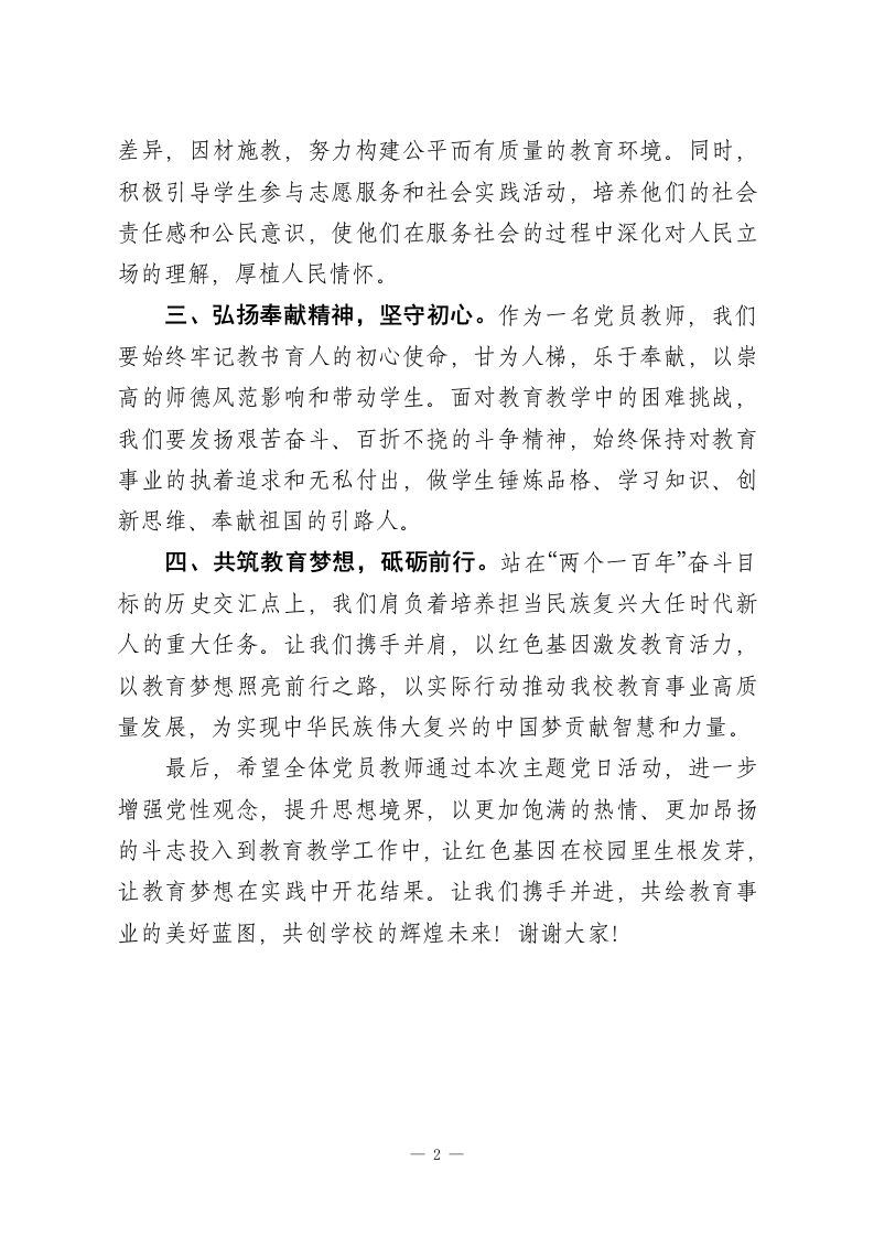 4月份主题党日发言尊敬的校领导,亲爱的党员教师们:大家好!在这春意盎然、生机勃发的四月,我们欢聚一堂,共同参与本月的主题党日活动。我谨代表党组织,对大家在日常教育教学工作中展现出的敬业精神和先锋模范作用表示由衷的敬意。今天,我们的主题是“弘扬红色基因,共筑教育梦想”,旨在引导全体党员教师深入理解并传承红色精神,将其融入到教育实践之中,为培养新时代社会主义建设者和接班人贡献力量。首先,我们要深刻领悟红色基因的内涵与价值。红色基因,是中国共产党领导人民在长期奋斗中形成的革命精神和优良传统,是我们党的精神标识和文化血脉。它蕴含着坚定的理想信念、深厚的人民情怀、无私的奉献精神和顽强的斗争意志。作为党员教师,我们肩负着传承红色基因的历史使命,要将这些宝贵的精神财富融入到立德树人的全过程,使之成为滋养学生心灵、塑造人格品质的源头活水。一、坚定理想信念,铸魂育人。我们要以党史学习教育为契机,深挖红色资源,讲好党的故事、革命的故事、英雄的故事,让孩子们在历史脉络中感受信仰的力量,明白今日幸福生活的来之不易,激发他们对党和国家的热爱之情,树立远大理想,立志成为有理想、有本领、有担当的时代新人。二、厚植人民情怀,服务社会。我们要以实际行动践行全心全意为人民服务的宗旨,关注每一位学生的成长需求,尊重1