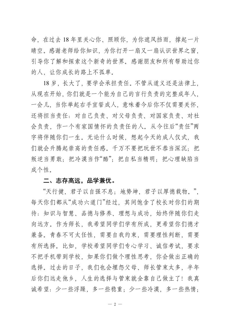 18岁成人礼,校长精彩讲话在18岁的路口,让我们整装出发,在最美的年龄为最纯的梦想做最大的努力,朝着心中的目标稳步向前老师们、同学们、家长们、十八岁的公民们:今天我们在这里举行隆重的18岁成人仪式。首先,我代表学校向跨入成人行列的各位同学表示热烈的祝贺,祝贺你们长大成人,可以独立自主地屹立在天地间!同时,也祝贺你们的家长“家有儿女初长成”,在此,我提议:掌声感谢含辛茹苦的父母,感谢一路相伴的师长,是他们在你们的成长道路上洒满汗水、逢山开路、遇水搭桥!18岁意味着什么?意味着各位少男少女迈入了成人,从少年成长为青年。它象征着各位经历了18年人生奔跑之后的一个崭新的起点。人生有两个重要的界点,1岁左右时我们颤巍巍地迈开步伐,蹒跚学步,那是我们身体的站立;今天我们迎来了18岁的新起点,那是身心的站立、精神的站立!成人意味着什么?成人的深刻涵义是责任、担当!在这个特殊的日子,我想跟大家说三句话。第一句:18岁,要心怀感恩,肩负责任。第二句:18岁,要志存高远,品学兼优。第三句:18岁,要奋斗进取,不断超越。一、心怀感恩,肩负责任。同学们能有今天,离不开父母和师长。感谢父母给了你生