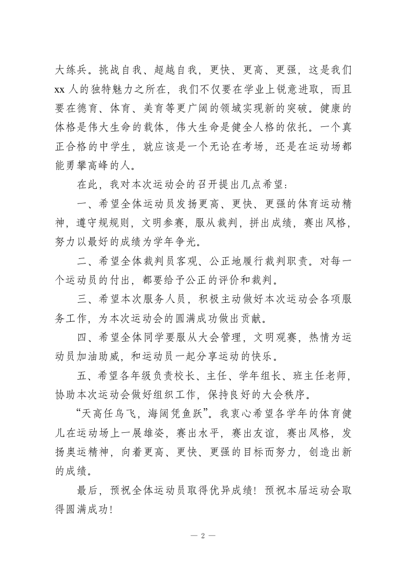 2026春季运动会,校长发言一个真正合格的中学生,就应该是一个无论在考场,还是在运动场都能勇攀高峰的人各位老师、同学们:大家早上好!在这阳光明媚、春意盎然的美好四月,我们Xx学校全体师生迎来了2026年春季田径运动会的胜利召开,这是我校在顺利通过省级标准化学校验收后的又一件大事!首先,我代表学校对本次运动会的召开表示热烈的祝贺!向筹备此次运动会的全体工作人员付出的辛勤努力,及全体师生积极参与表示衷心的感谢!老师们,同学们,伴随年轻的Xx学校走过了自己朝气蓬勃的二十年。建校以来,学校始终高度重视体育工作,在努力提高学生思想道德素质和文化知识水平的同时,坚持把“发展体育运动,增强师生体质”作为学校工作的重要组成部分。历年来,学校在体育教学和体育训练不断取得优异成绩,学生身体素质、意志品质不断增强,学校自06年以来,现以蝉联xx学区运动会五连冠殊誉,而在近几年中考中,我校体育教学成绩更是大显身手。我们确实有理由为x体育事业的不凡成就感到自豪和骄傲!本次运动会召开,将是我校历年来规模最大的一次体育盛会,是展示x学子青春风采的最新舞台,也是对我校体育竞技水平的又一次大检阅,更是我校全面实施素质教育的又一次