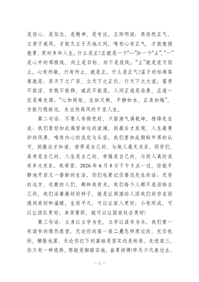 2026高考誓师大会校长讲话快乐每一天,进步每一天,夺取高考的胜利尊敬的各位老师,亲爱的同学们:大家好!看着这振奋人心的壮观场面,听着这响彻云霄的铮铮誓言!我热血沸腾、激动万分!我为你们骄傲!今天,征战高考的接力棒正式交给了我们2026届高三的师生们。首先,我代表校党委、校行政向孜孜以求、奋力拼搏的全体高三同学送上最美好的祝愿!向为你们茁壮成长而辛勤操劳、倾注心血的父母和老师们致以最崇高的敬意!今年,xx一中2023届全体师生戮力同心、迎难而上,高考再结硕果,实现了“低进高出、低进特出、低进优出”的预期目标。今朝花开胜往昔,料得明年花更红。赓续奋斗是对一中精神的最好传承。今天的誓师大会已经擂响了出征高考的战鼓,吹响了进军高三的号角。这意味着我们肩负更多的责任和使命,意味着我们要付出更多的辛劳和汗水,也意味着我们可能会遇到更多的困难和挫折。在这里,我要送给同学们七句箴言,希望它能成为你们高考征途中的智慧锦囊。第一句:一点浩然气,千里快哉风。我们要“行仰浩气、学驰天下”,用苏轼的话说就是“一点浩然气,千里快哉风”。高考不是终点,只是序篇;不是分流器,更是炼钢炉。高考是对我们的正气、骨气、底气、力气来一次全方位的检验:十二年的淬炼,宝剑该出鞘的时刻,狭路相逢勇者胜,决的不是胜负,1