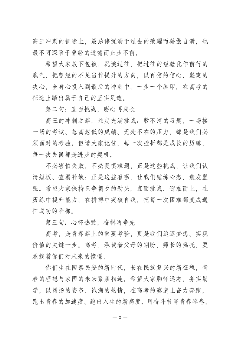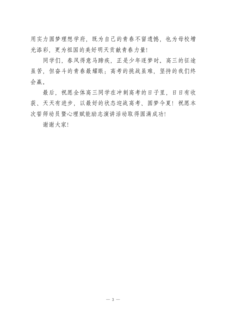 2026届高三誓师动员暨高考心理赋能励志演讲校长致辞:用奋斗书写青春答卷,用实力圆梦理想学府,既为自己的青春不留遗憾,也为母校增光添彩敬爱的老师们、亲爱的同学们:大家好!春风送暖,万物勃发,今天,我们全体高三师生齐聚一堂,隆重举行2026届高三誓师动员暨高考心理赋能励志演讲活动。首先,我代表学校,向莅临本次活动、为大家赋能鼓劲的励志讲师,表示热烈的欢迎和衷心的感谢!也向始终坚守岗位、潜心育人的高三全体教师,致以最诚挚的敬意!此刻站在这里,看着同学们眼神坚定、朝气蓬勃,浑身透着青春的锐气与拼搏的劲头,我倍感欣慰与自豪。步入高三下学期,我们早已告别了悠闲与松懈,在课堂上深耕细作,在题海中奋力跋涉,在一次次模考中打磨心态,用奋斗的身影勾勒出青春最美的模样。每一份坚持、每一次努力,都在为即将到来的高考积蓄力量。在这个冲刺高考的关键节点,我想送给全体高三同学三句话,与大家共勉,愿大家带着这份力量,轻装上阵、全力以赴:第一句:沉淀过往,轻装再启程过往的时光里,我们有过取得佳绩的喜悦,也有过遭遇挫折的迷茫;有过胸有成竹的笃定,也有过焦虑彷徨的时刻。但
