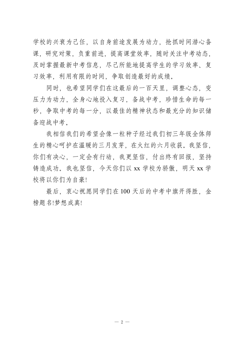 2026届中考百日誓师大会,校长讲话相信你们已然踌躇满志,信心百倍尊敬的各位老师、亲爱的同学们:大家下午好!在春光明媚的今天,我们隆重聚会,举行2026届中考百日誓师大会。在此,我谨代表学校向辛勤耕耘、不计得失的初三老师们表示诚挚的感谢,向勇于拼搏、全力奋战的全体初三学生致以美好的祝愿。老师们、同学们,你们辛苦了!借此机会送给同学们几句话以共勉,那就是:只要启程,就会达到理想的目的地,只要拼搏,就会获得辉煌的成功,只有播种,才能收获,只有奋斗,才能品味幸福的人生。同学们,你们三年的汗水,千日的付出,终将结成六月的硕果,我们期盼六月的校园笑脸绽放,凯歌飞扬。面对中考,相信你们已然踌躇满志,信心百倍。你们身上承载着父母、亲朋好友的殷切期待,承载着全校师生的热切希望。你们有全校师生最倾心的支持,有最优秀教师的兢兢业业、无私奉献;有活泼聪慧的你们的勤奋学习、执着进取。在这冲刺2026年中考倒计时100天的关键时刻,我希望你们:少一些幻想,多一些理智;少一些浮躁,多一些行动,以饱满的热情,坚定的信念,迎难而上。我们的目标是:一年好过一年,一届胜过一届,用你们的精彩表现传递xx学校的不息薪火,用你们的中考成绩续写xx学校初中新的辉煌!衷心地希望初三全体教师以一切为了学生中考为根本,以1