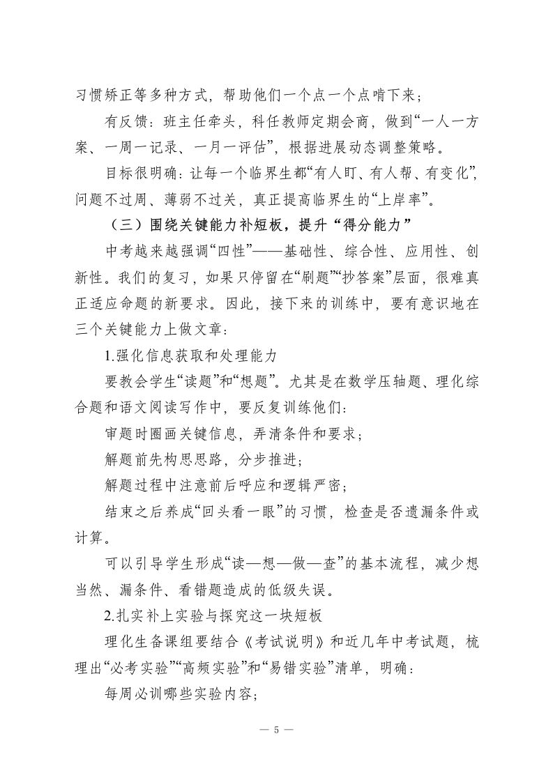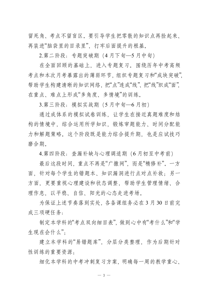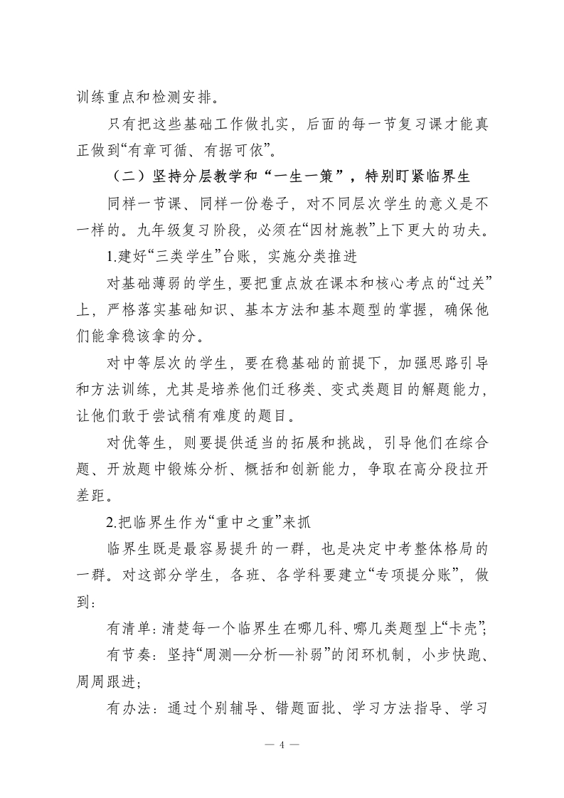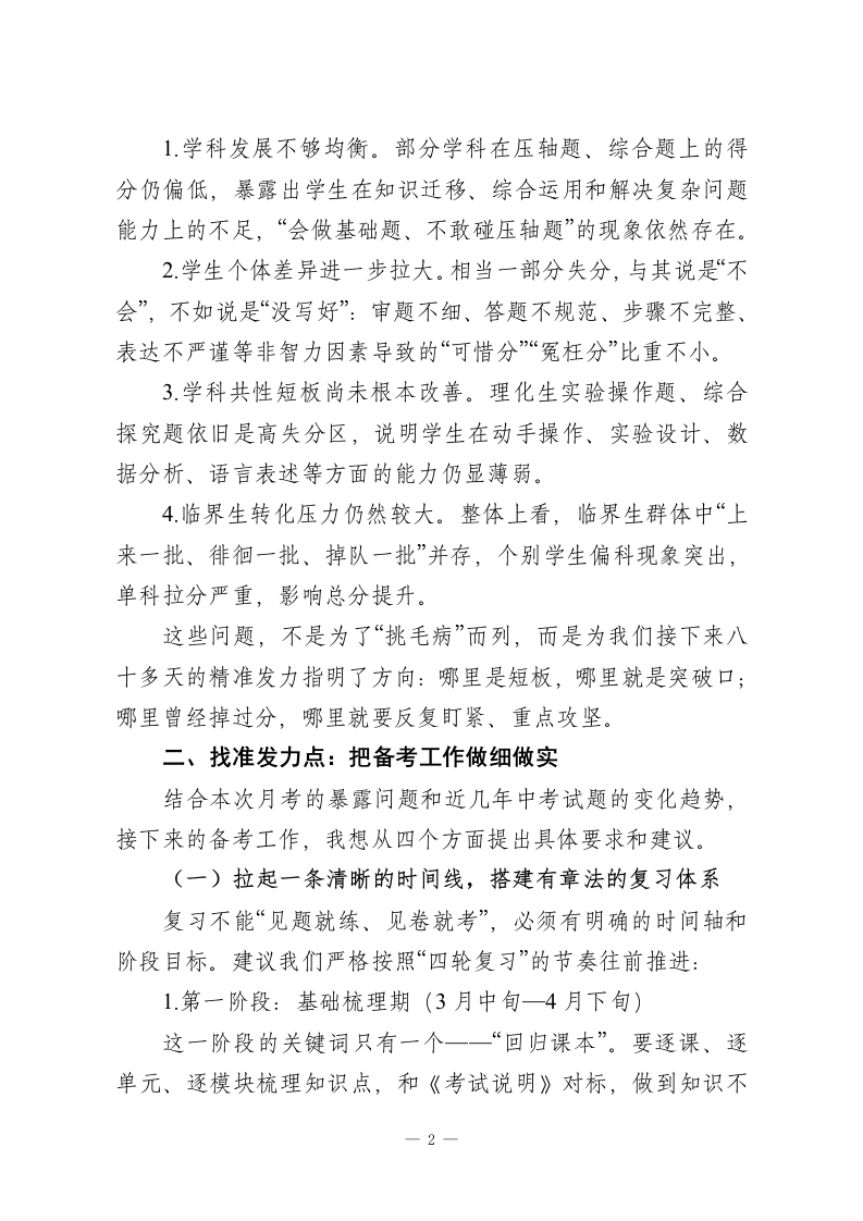 2026九年级第二学期第一次月考分析会上的校长讲话各位老师:下午好!春光正好,万物竞发。此刻我们相聚在一起,召开九年级下学期第一次月考质量分析会,说到底,是想借这面“镜子”,把前一阶段的教学工作认真梳理一遍,也借这个节点,为接下来八十多天的中考冲刺再定一次盘、再鼓一次劲。今年中考已进入倒计时阶段,这次月考是冲刺阶段的第一次全面检测,既是体检,也是号角,既要看成绩,更要找问题、明方向。在这里,我首先代表学校、代表年级组,向一直奋战在九年级一线的各位老师致以真诚的感谢和由衷的敬意!一、以事实说话:还原这次月考的真实面貌从整体数据和各学科成绩分布来看,这次月考既让我们看到可喜的变化,也暴露出必须正视的短板。一方面,成绩的积极变化是实实在在的。多数班级的总体情况较上学期期未有不同程度的提升,部分学科的平均分、及格率、优秀率都有明显上扬,基础题得分率整体走高,说明前期大家在“抓基础、打底子”上的功夫没有白费。一些原本处在临界位置的学生,在老师们有针对性的帮扶下,某几科取得了可见的突破,成绩曲线开始向上拐头,呈现出良好的发展势头。另一方面,这份试卷也毫不留情地把问题摆到了我们面前,主要体现在四个方面:一1