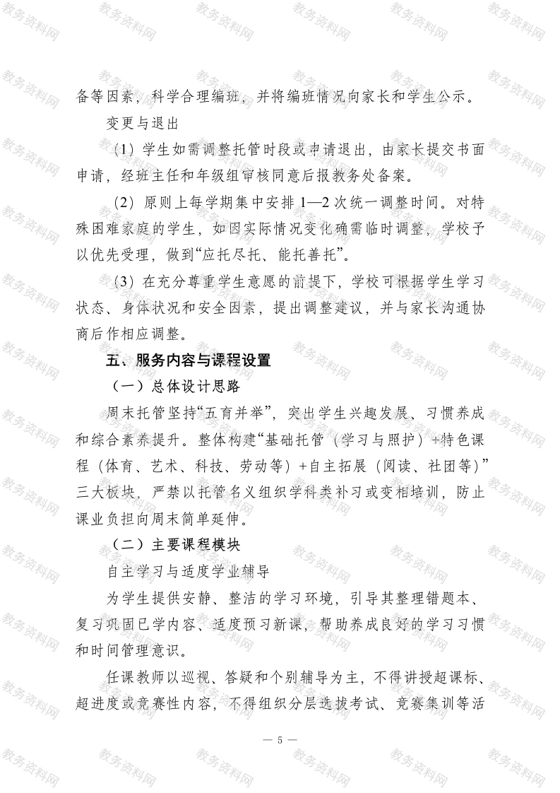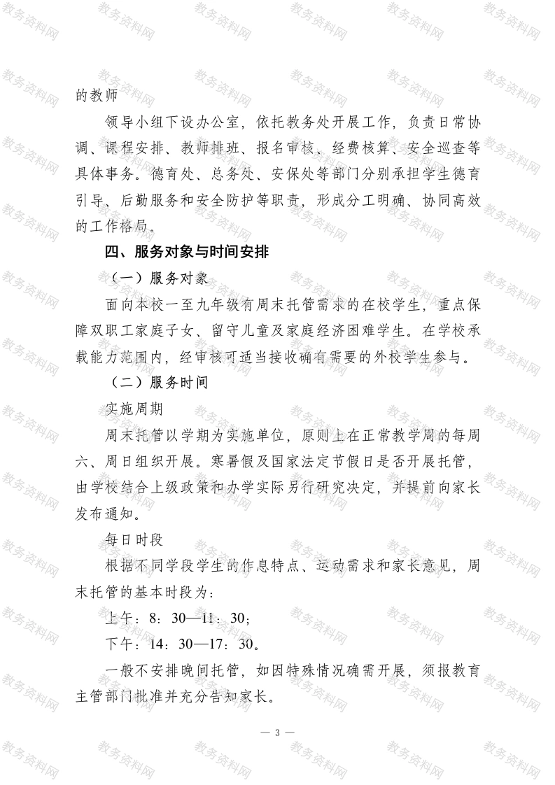 2026年春季学期周末托管服务实施方案为深入贯彻落实国家“双减”工作部署,充分释放学校在学生成长中的主渠道作用,缓解本校学生家长在周未面临的“无人看护”“缺乏辅导”等现实困难,进一步减轻学生校外培训负担和家庭经济压力,促进学生全面发展、健康成长,依据教育部办公厅《关于做好中小学生课后服务工作的指导意见》(教基一厅[2017]2号)、《省义务教育学校课后服务管理实施办法》(教监管字[2025]6号)、《县义务教育学校课后服务管理实施办法(试行)》(教办字[2024]31号)等文件精神,结合我校九年一贯制办学特点和家长、学生的实际需求,在前期课后服务实践的基础上,特制定本方案。一、指导思想以习近平新时代中国特色社会主义思想为指导,全面贯彻党的教育方针,落实立德树人根本任务,坚持德智体美劳“五育并举”。把周末托管服务作为学校教育教学工作的有益延伸,创新服务模式与课程体系,严格执行“双减”要求,在不增加学生课业负担的前提下,满足学生多样化、个性化发展需要,促进学生身心健康、全面发展,努力办好人民满意的义务教育。二、基本原则(一)自愿参与,尊重选择充分尊重学生和家长的知情权、选择权,由学生及其监护人根据家庭实际自愿决定是否参加。学校通过多种途径公开服务项目、时间安排和收费标准,不得以任何形式强制或变相强1