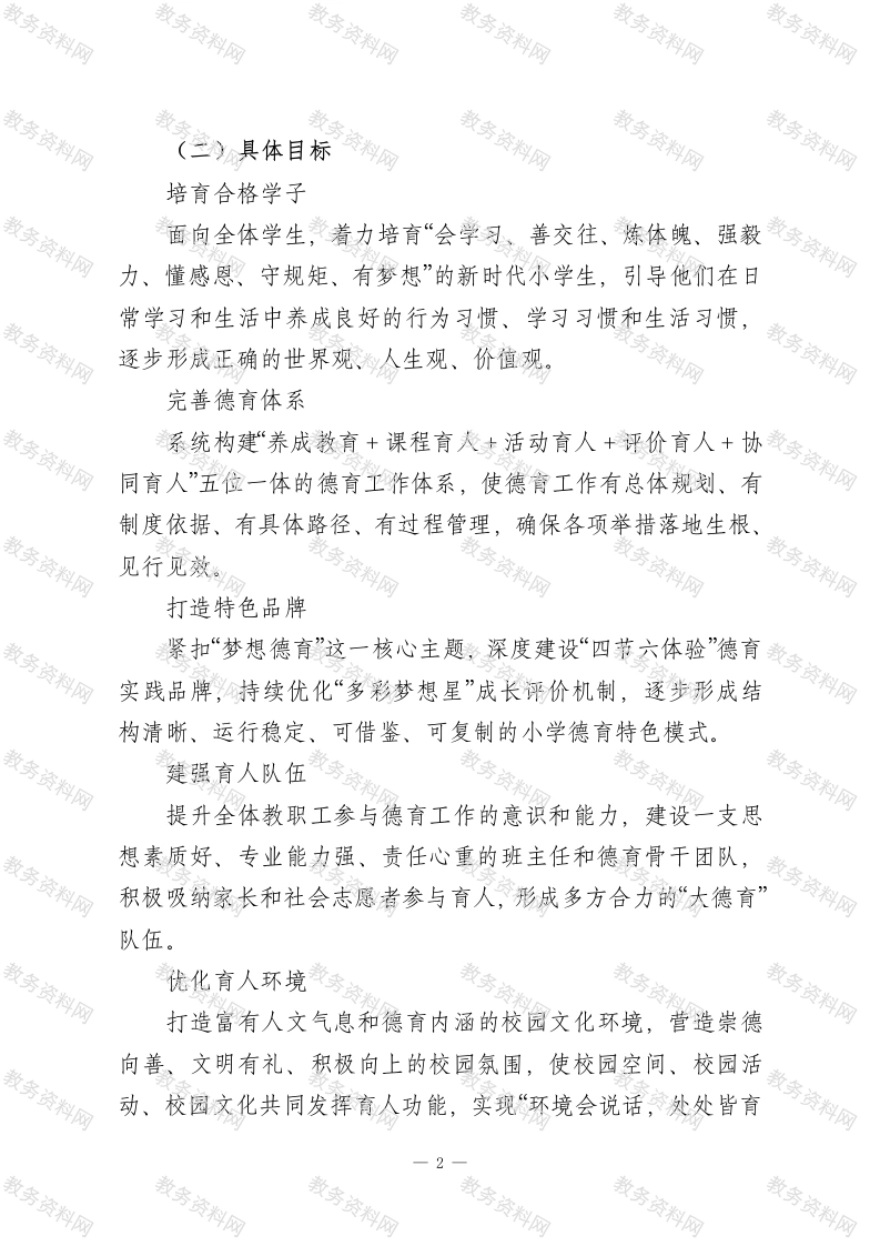 2026年德育特色学校创建方案一、指导思想坚持以立德树人为根本任务,牢牢把握育人正确方向,全面提升学校德育工作的质量与内涵。以新时代教育方针为引领,认真贯彻《中小学德育工作指南》《新时代公民道德建设实施纲要》等文件精神,紧扣区域教育高质量发展总体部署,立足学校实际和小学生身心发展规律,牢牢坚守“许孩子一个有梦的童年”的办学愿景。在此基础上,坚持把德育放在首位,统筹推进德智体美劳全面发展,整合校内外各类育人资源,健全德育工作体系,创新德育工作路径,集中力量打造“梦想德育”特色品牌,使德育走出“说在嘴上、写在纸上”的局面,真正融入校园日常生活,浸润学生心灵,促进每一位学生在温暖有梦的环境中健康成长,为学校教育教学高质量、稳步发展提供坚实支撑。二、创建目标(一)总体目标以立德树人为统领,以习惯养成为支点,以课程教学和实践活动为主要载体,以科学评价和正向激励为抓手,以家校社协同共育为支撑,构建全方位、多层次、立体化的小学德育工作格局。通过主题鲜明、内容丰富、成效显著的系列实践,打造具有高度认可度的德育特色品牌,显著提升师生的道德素养与文明素养,全面提高学生综合素质,成功创建区级德育特色学校,让德育成为学校最亮眼的办学名片。1