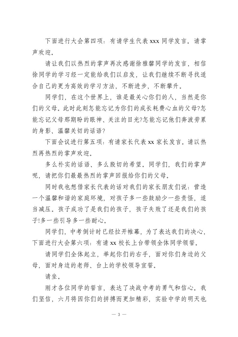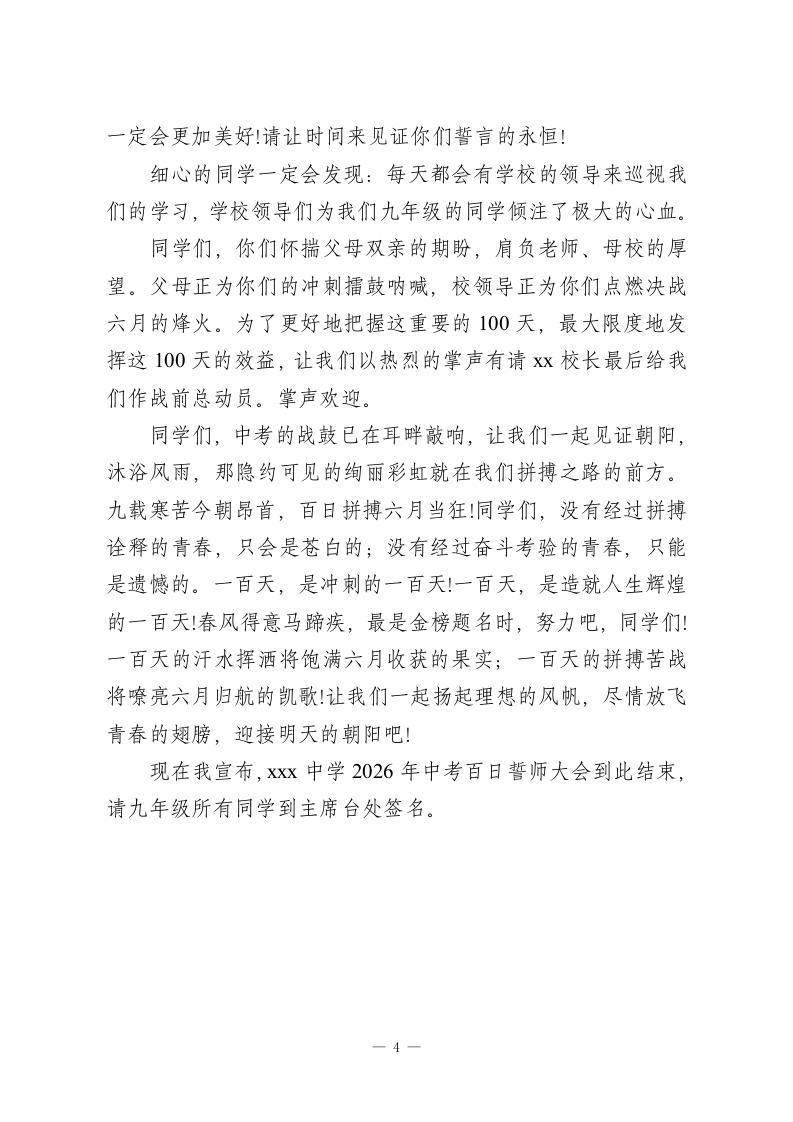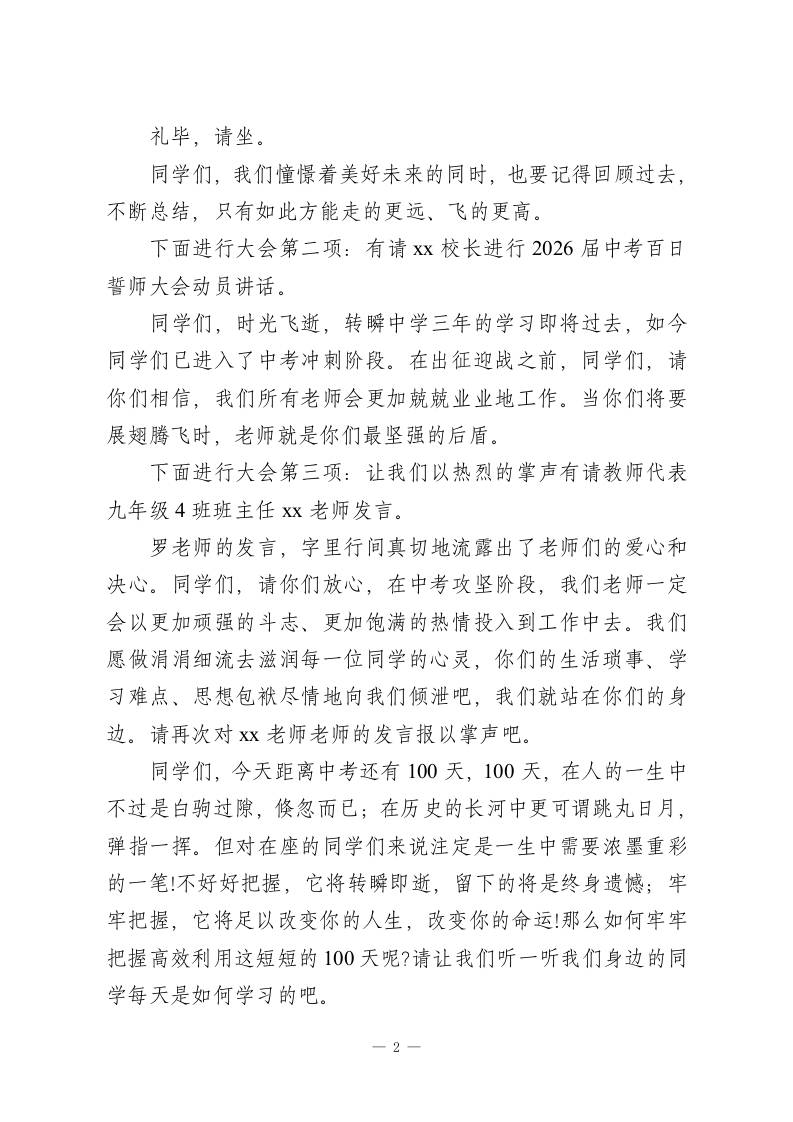 2026年励志中考百日誓师大会主持词尊敬的各位领导,亲爱的老师们、同学们:大家上午好」又是一载春回大地,万象更新。春天是一个总令人充满希望的季节,这季节,总让人产生某种期待和盼望。今春,我们期待着今年花胜去年红,我们盼望着今年的六月硕果复累累。为了实现这份期盼,今天我们在这里隆重举行xxx中学2026届中考百日誓师大会。这次大会是圆同学们青春梦想的动员令,是扬同学们人生志气的进军号,是表达我们2026届全体师生必胜豪情的奏鸣曲!首先,请允许我介绍莅临大会的学校领导,他们分别是:xxx中学校长、党支部书记xxXxx中学副校长XxXxx中学副校长XxXxx中学党支部副书记、办公室主任XxXxx中学工会主席XxXxx中学政教处主任XxXxx中学总务处主任XxXxx中学总务处副主任Xxxxx中学教务处主任XxXxx中学教务处副主任Xx下面大会正式开始!大会第一项:全体起立,奏唱国歌。一1