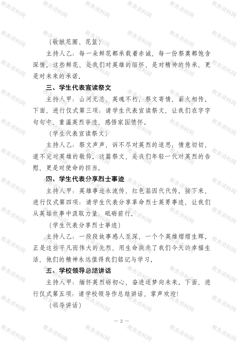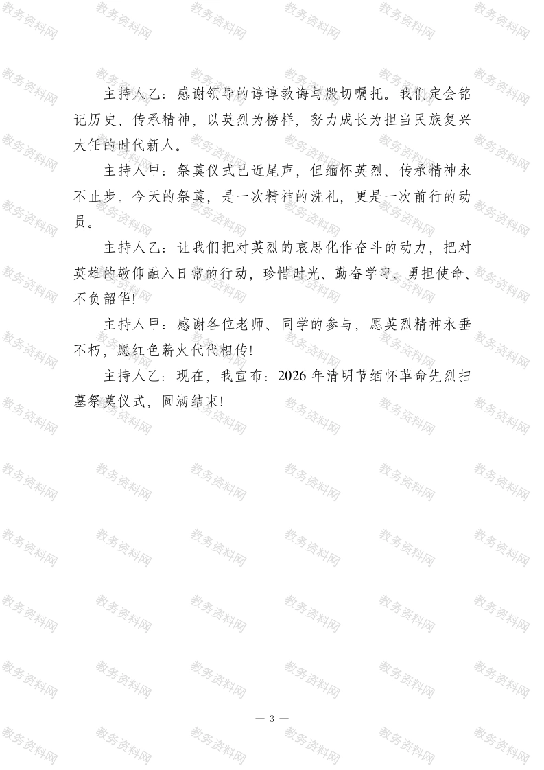2026年清明节缅怀革命先烈扫墓祭奠仪式主持词主持人甲:翠柏凝春,哀思悠悠;清明时节,英魂永记。2026年的清明,我们怀着无比崇敬的心情,来到这里缅怀革命先烈,追忆峥嵘岁月,传承红色精神。主持人乙:天地英雄气,千秋尚凛然。无数革命先烈为了民族独立、国家富强、人民幸福,抛头颅、洒热血,用生命铸就了不朽的精神丰碑。今天,我们以祭奠之名,向英烈致敬,以青春之名,承先辈遗志!合:现在,我宣布,2026年清明节缅怀革命先烈扫墓祭奠仪式,正式开始!一、全体肃立,默哀致敬主持人甲:首先,进行仪式第一项:全体肃立,向革命先烈默哀。让我们在静默中缅怀英烈功绩,在沉思中铭记英雄精神,寄托我们最深切的哀思与敬意。(默哀1分钟)主持人乙:默哀毕。这短暂的沉默,是对英烈的缅怀,是对历史的敬畏,更是我们新时代少年不忘初心、砥砺前行的誓言。二、向烈士敬献花圈、花篮主持人甲:鲜花寄哀思,丹心慰英魂。接下来,进行仪式第二项:向革命烈士敬献花圈、花篮。让我们用朵朵鲜花,诉说对英烈的思念;用束束敬意,告慰不朽的忠魂。-1