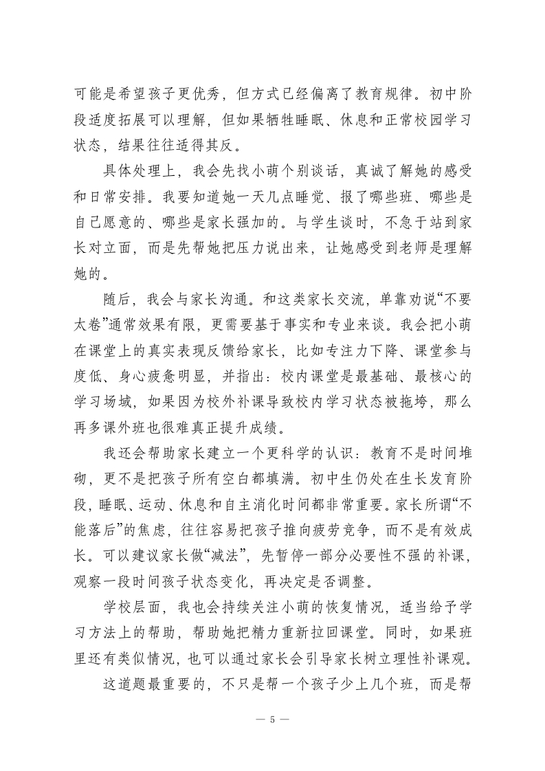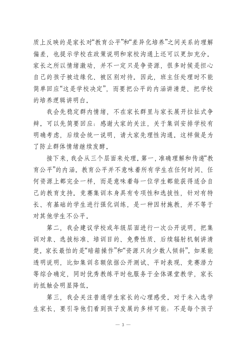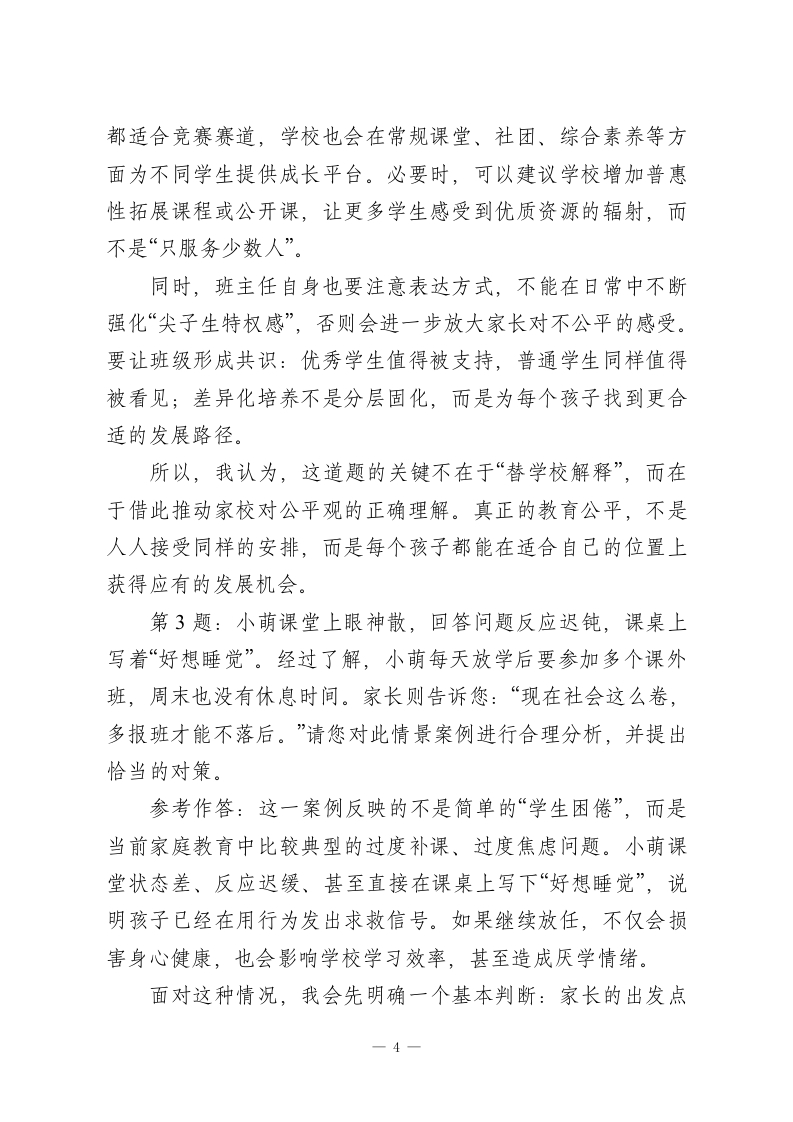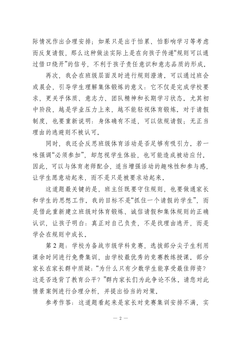 班主任基本功大赛情景答辩23题(中学组)第1题:近期,小江家长多次以“头晕乏力膝盖酸痛”等理由帮孩子向您请假,不参加集体锻炼。但您发现,小江课余时间玩得不亦乐乎,不像身体虚弱。其他学生见状,也纷纷效仿让家长请假,班级体育锻炼出勤率下滑严重。请您对此情景案例进行合理分析,并提出恰当的对策。参考作答:面对这一情景,我认为问题的表面是“小江频繁请假不参加锻炼”,实质上反映的是三个层面的矛盾:一是学生规则意识和诚信意识出现松动,二是部分家长对体育锻炼的价值认识不足,三是班级管理中的示范效应已经出现,个别现象正在演变为群体现象。如果不及时处理,不仅会影响体育锻炼出勤率,还会削弱班级规则的公信力。对此,我不会简单把小江和家长贴上“故意撒谎”的标签,而是会坚持“先核实,再引导;先个别处理,再班级纠偏”的思路。首先,我会单独和小江谈话,了解他不愿参加集体锻炼的真实原因。初中生很多时候并不是单纯偷懒,背后可能有怕吃苦、怕出汗、怕被同学比较、身体某些不适、甚至对体育项目缺乏自信等原因。只有把真实想法谈出来,后续教育才有针对性。其次,我会与家长沟通,语气上保持尊重,但态度上要明确。我会告诉家长,学校理解家长对孩子身体状况的担忧,但如果确有身体问题,建议提供正规医院诊断,学校也会根据实1