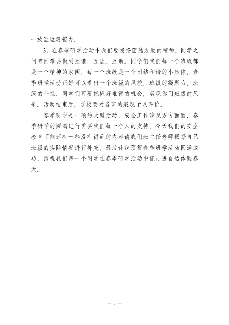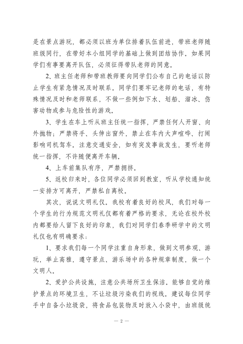 春季研学活动,校长讲话无论在校外校内都要给人留下良好的印象老师们同学们:大家早上好!走进春天,我们感受着明媚的阳光,和煦的春风,青青的嫩芽,大自然处处洋溢着春的气息,春的芬芳。就在这样一个温暖而充满了生机的季节里,我校决定今天带领同学们到xx春季研学。我们将一起走出校园拥抱自然,去感受春风的温柔怀抱,去倾听万物生长的声音,让那满眼的新绿、嫩绿、鲜绿、翠绿温柔我们的视线,把我们的欢声笑语传遍四方。相信这是一个大家早就企盼的活动,今天全校师生五百多人就要开始自己为期一天的春季研学之旅。到时,x将到处跳跃着我们活泼的身影、荡漾出我们欢快的笑声。今天,我利用出发前的几分钟时间就春季研学期间的一些可能存在的安全问题和对大家的纪律要求做一个简单的讲述,目的就是为了我们春季研学活动的顺利开展。这次活动我们对每一个参加春季研学的学生提出总要求是八个字“守纪、安全、文明、愉快”。一次活动的高质量开展首先需要的就是严明的纪律保证,更何况我们的队伍如此庞大,下面我先来说说守纪、安全。守纪和安全是两个关系非常密切的词,安全事故的发生往往与不能遵纪守法有关。1、活动中同学们一切行动必须统一听从老师的安排。必须遵守游玩时间,在规定时间内返回指定地点。无论是路途中还1