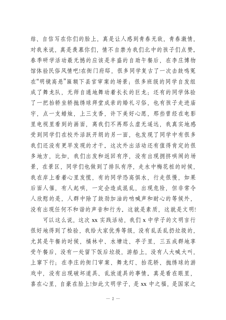 春季研学活动结束,校长在国旗下讲话今后,我们还有很多的校外实践活动,希望每一位同学都能像这次一样,开心快乐,安全文明老师们、同学们:近几年来,因为组织春秋游活动程序更加规范,手续更加复杂,组织方和协作方承担的责任和风险更大,很多学校,也包括我们学校对组织研学活动有一些观望,但这样一项亲近自然,凝聚人心,融洽关系的社会实践活动一直以来深受家长的欢迎和同学们的期待,尤其是春季研学,春暖花来,万物复苏,象征着希望与活力的春天,我们怎能因为组织活动的麻烦而轻易放弃呢。于是我们按照上级主管部门有关组织社会实践活动要求,严格活动前的每一个程序,先后经历了集体决定、家长参与、实地考察、预案制定、线路设计、协办单位的竞标,收费的核准、交通车的审核、上级审批、安全责任书的签订等一系列复杂而稳妥的手续,这次终于让沉寂两年的春季研学活动成行了。这次春季研学活动的地点,我们选择的是Xx风景区。看得出来,这次春季研学同学们玩得都很开心。在仿古游船上,同学们沐浴阳光,感受春风吹过,水波荡漾的宁静之美;在橘子岛上,同学们荡秋千、过风险桥、走梅花桩、打沙滩排球、唱卡拉ok、玩各式勇敢者的游戏,满满的活力、勇敢、快乐、团