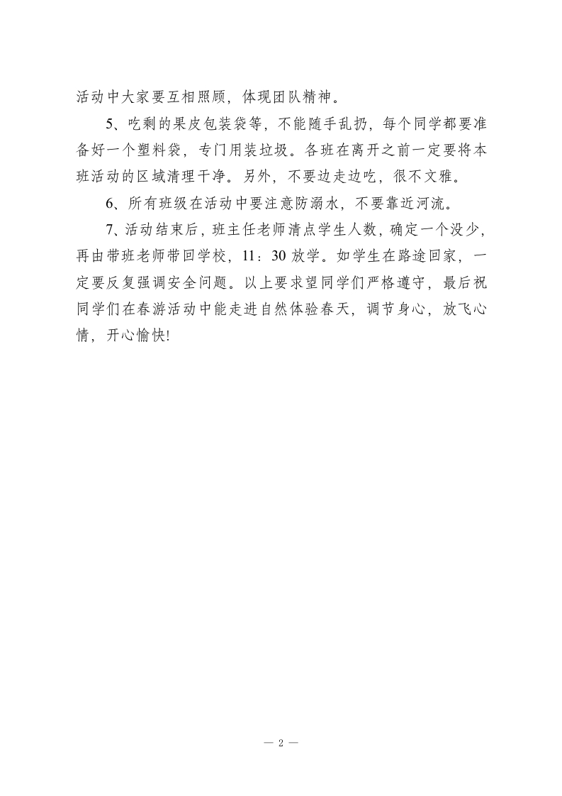 春游踏青,校长讲话参加春游活动,可以开拓我们的视野,陶冶我们的情操,提高我们参加社会实践活动的能力同学们:又到了阳春四月,正是走进大自然的好时节。今天我们将举行同学们最期盼的集体活动一一春游踏青。相信大家此刻的心情一定兴奋不已。的确,参加春游活动,可以开拓我们的视野,陶冶我们的情操,提高我们参加社会实践活动的能力等等,是一件有意义、令人向往的事情。但同时必须牢记:安全第一。我们要高高兴兴出门,平平安安回来。为了安全、愉快地组织好本次春游活动,在出发前,我在这里再强调几点要注意的问题:1、今天我们的春游活动是分年级组织的,所有班级必须听从年级组负责人的安排统一开展活动,不得单独行动。2、来回的路途一定要排好路队,三位跟班老师一个在前、一个在中、一个在后,所有同学要听从老师的指挥,不要掉队,低年级乘车的班级,要听从年级组管理人员的安排,文明有序的上下车,任何同学都不能将头和手伸出窗外,不准在车内拥挤,随意走动,注意乘车安全。3、这是集体活动,游玩时,任何人不能擅自离开队伍,离开集体。4、要讲究文明,说文明的话,做文明的事,注意自身形象。
