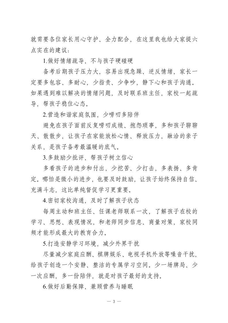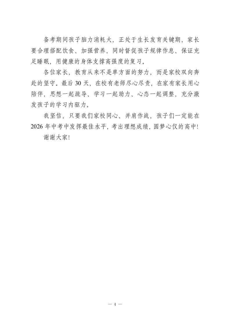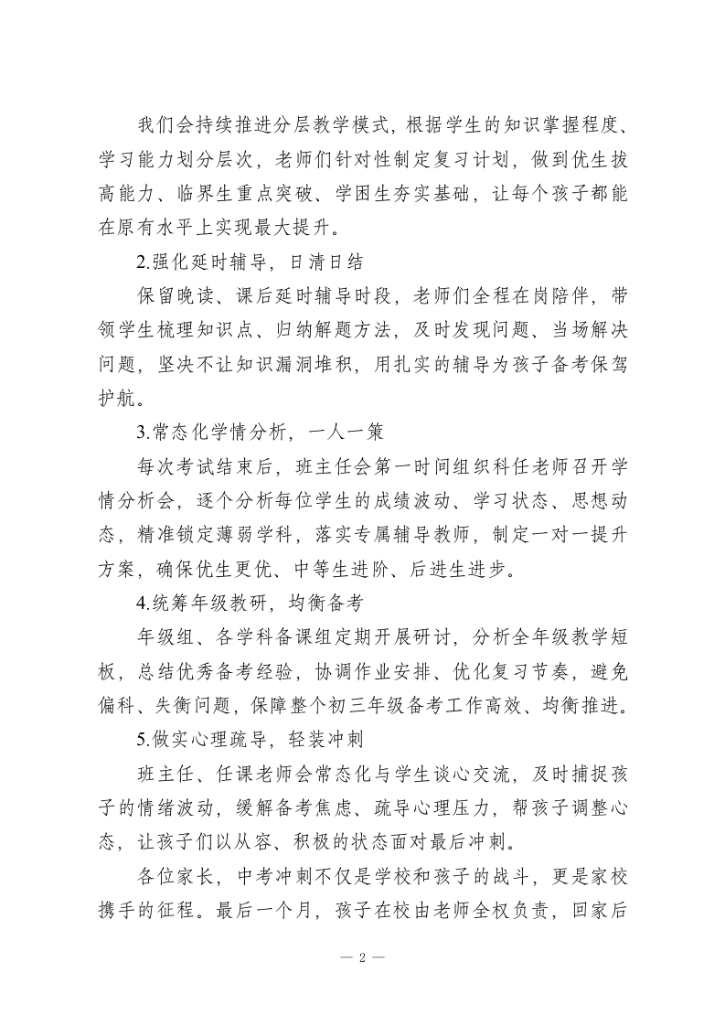 九年级初三二模分析家长会校长致辞:教育从来不是单方面的努力,而是家校双向奔赴的坚守尊敬的各位家长、老师们,亲爱的同学们:大家上午好!春风催奋进,中考战鼓鸣。2026年中考仅剩一个月左右的关键时间,今天我们齐聚召开九年级二模考试分析家长会,既是向各位家长汇报孩子的备考情况,也是为了凝聚家校合力,陪孩子们走好最后冲刺的每一步。首先,我代表学校,向在二模考试中取得进步、突破自我的同学们,表示热烈的祝贺!向日夜坚守在备考一线、悉心教导学生的全体初三教师,道一声辛苦了!更向一直以来全力支持、配合学校工作的各位家长,致以最衷心的感谢!家长会是家校沟通的桥梁,更是助力孩子成长的纽带。二模考试是中考前的重要“练兵”,既检验了孩子们前阶段的复习成效,也帮我们找准了备考短板。从整体成绩来看,本届初三学生发展态势良好,对比前期考试进步明显,这离不开老师们的辛勤付出,更离不开家长们的默默支持,也让我们对今年的中考充满信心。中考冲刺的最后一个月,学校会全力以赴、全程护航,为孩子们做好这五项核心工作:1.坚持分层施教,精准辅导一1