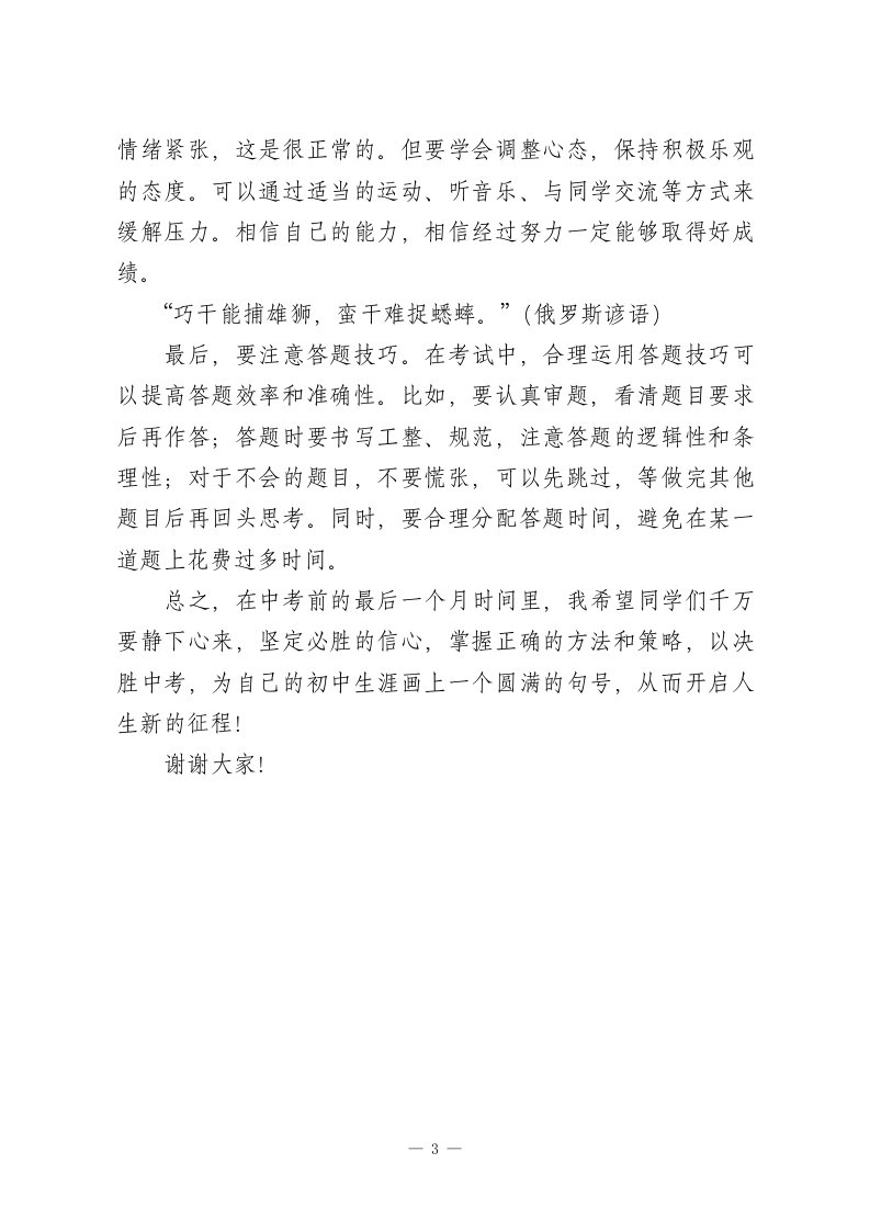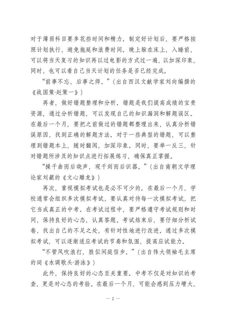 九年级二诊(二模)考试总结大会校长讲话尊敬的各位老师、亲爱的同学们:大家好!中考越来越近,对于即将踏上考场的同学们来说,最后一个月至关重要。我希望同学们在这非常关键的冲刺阶段,全力以赴投入复习中去。我想,就是要提高50多分也并非遥不可及。因此,今天,我的发言主题是《中考提分秘籍最后一个月,提高50多分不是梦》,讲6句话,谈一下我的意见和建议。“根深之树不风折,泉深之水不涸竭。”(朝鲜谚语)首先,回归基础是关键。中考大部分题目都是对基础知识的考查,因此,在最后一个月,要将重点放在基础知识的巩固上。把课本上的知识点、定理、公式等重新梳理一遍,确保没有遗漏和模糊之处。对于平时容易出错的基础题型,要反复练习,加深印象,做到烂熟于心。通过强化基础,能够在考试中减少低级错误,稳定得分。“凡事预则立,不预则废。”(出自孔子的嫡孙、春秋时期教育家、思想家子思的《礼记中庸》)其次,制定合理的复习计划。时间紧迫,合理安排每天的复习任务尤为重要。可以将一天的时间划分成若干个时间段,分别安排不同科目的复习。比如,早上可以背诵语文、英语等需要记忆的内容,下午集中精力做数理化的练习题,晚上则进行总结和归纳。同时,要根据自己的实际情况,合理分配时间,1
