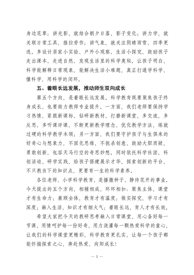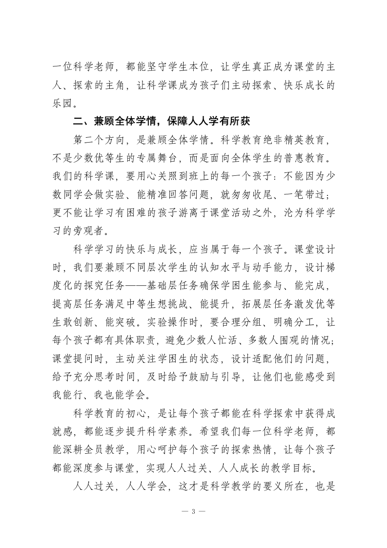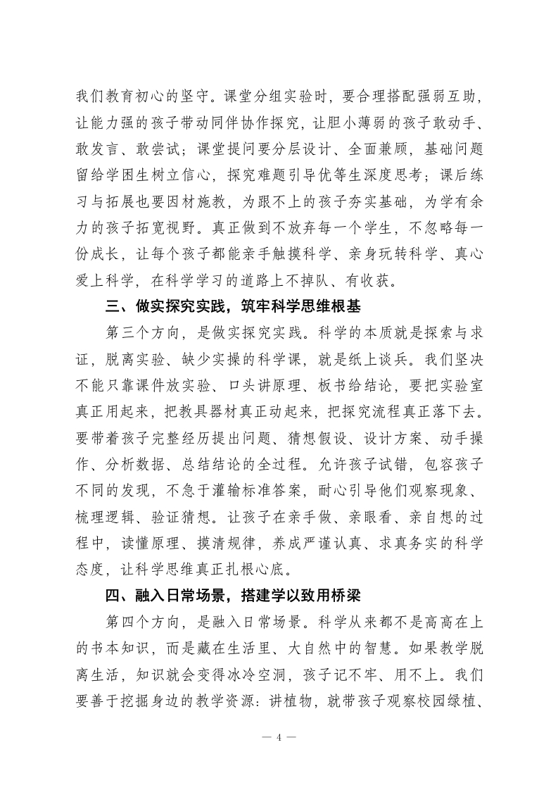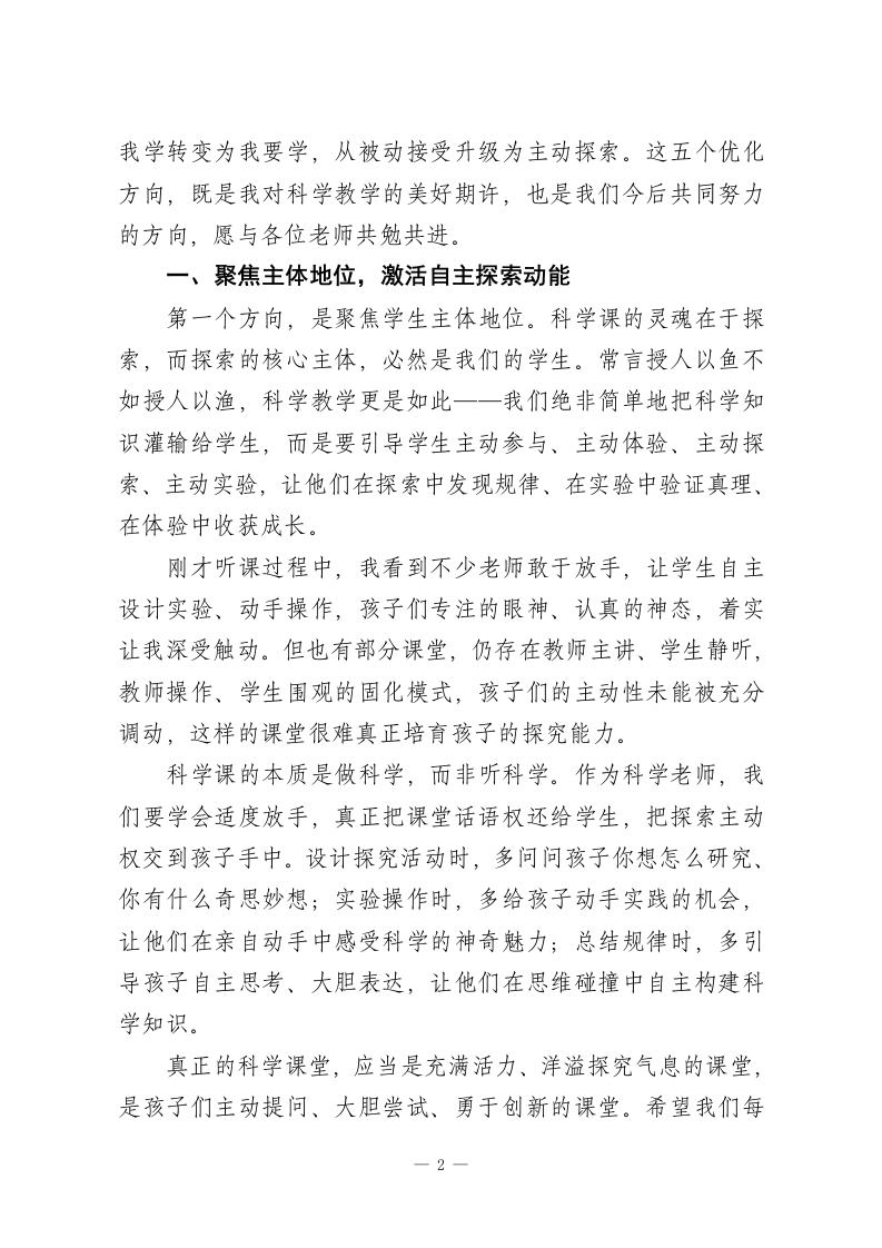 小学科学教研活动后,校长讲话:抓实科学教学,用心做好素养培育各位科学组的老师们:大家下午好!今天全程参与咱们科学组的教研活动,认真聆听了几位老师的精彩授课,内心满是触动与欣慰。一直以来我常和大家分享:小学科学是叩开孩子认知世界、探索未知大门的第一把钥匙,是落实五育并举、培育核心素养的重要阵地,更是为孩子一生科学素养筑牢根基的关键学科。刚才的几堂课,既不乏亮眼创意与精彩设计,也存在一些值得我们共同研讨、携手精进的细节。老师们的精心备课、用心引导,孩子们的积极参与、大胆探索,都让我真切看到了咱们科学教学的蓬勃活力与无限希望。科学教育的核心要义,绝非让孩子机械记忆零散的科学知识,而是着力培养他们的科学思维、探究能力与创新意识,引导他们学会用科学的眼光审视世界、用科学的方法解决问题。结合今天的听课感受,以及我对小学科学教学的些许思考,我想和大家分享五个教学优化方向,愿与各位一同交流、一同践行,携手把咱们的科学课上得更生动、更扎实、更有温度、更有深度,真正让每个孩子都能在科学学习中收获成长、绽放光芒。古人云:知之者不如好之者,好之者不如乐之者。小学科学教学,最关键的就是点燃孩子内心的探索热情,让他们从要1