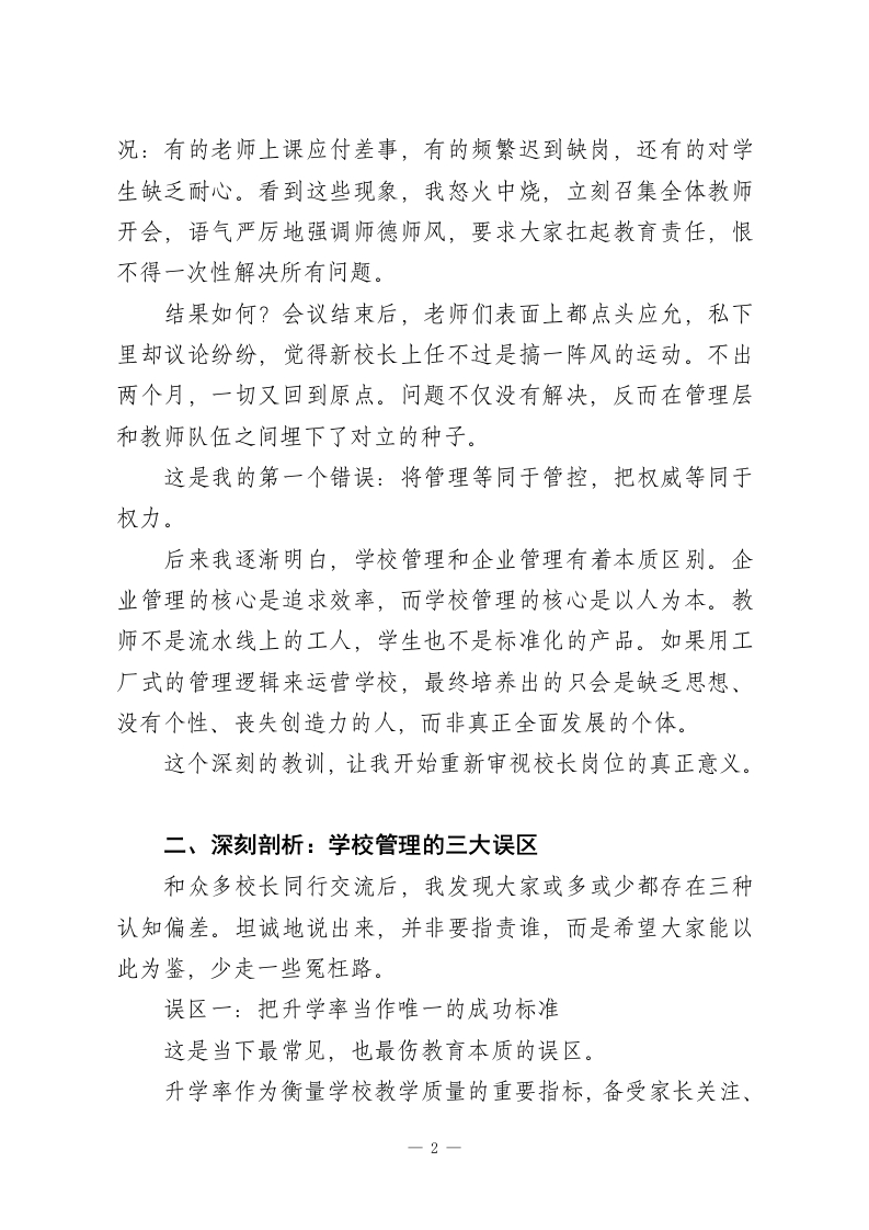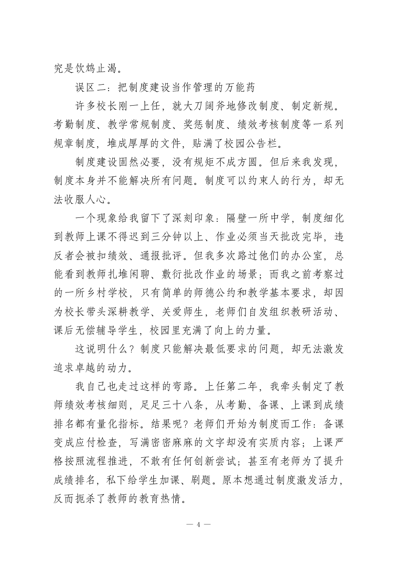 校长岗位反思:深度剖析!学校管理的三大误区!重构四维领导力!打造五位一体教育生态!说起校长这个岗位,很多人第一反应是管人和协调关系。但这只是浮于表面的认知,并没有触及校长工作最核心、最根本的内涵。从事校长工作这些年,我始终在琢磨一个问题:一所优质学校到底需要什么样的校长?铁腕管控型与温和引导型的管理者,谁更能引领学校走得远?纠结于细枝未节的管理者与怀揣教育理想的实践者,哪种角色更有价值?这个问题我思考了很久,期间也走了不少弯路。今天,我想毫无保留地分享这些年的所思所悟,与所有在教育管理岗位上深耕的同行交流。这不是一份成功经验总结,而是一名学校管理者在实践中不断碰壁、反思、自我革新的心路历程。一、走进校长室的第一天,我就错了刚踏入校长办公室时,我意气风发,满心都是干事的劲头。把办公桌收拾得一丝不苟,还特意将一摞管理类书籍放在显眼处,暗自下定决心要做一名有思想、有魄力、能担当的好校长。但现实很快给了我沉重一击。上任第一个月,我发现学校里有些教师存在敷衍履职的情