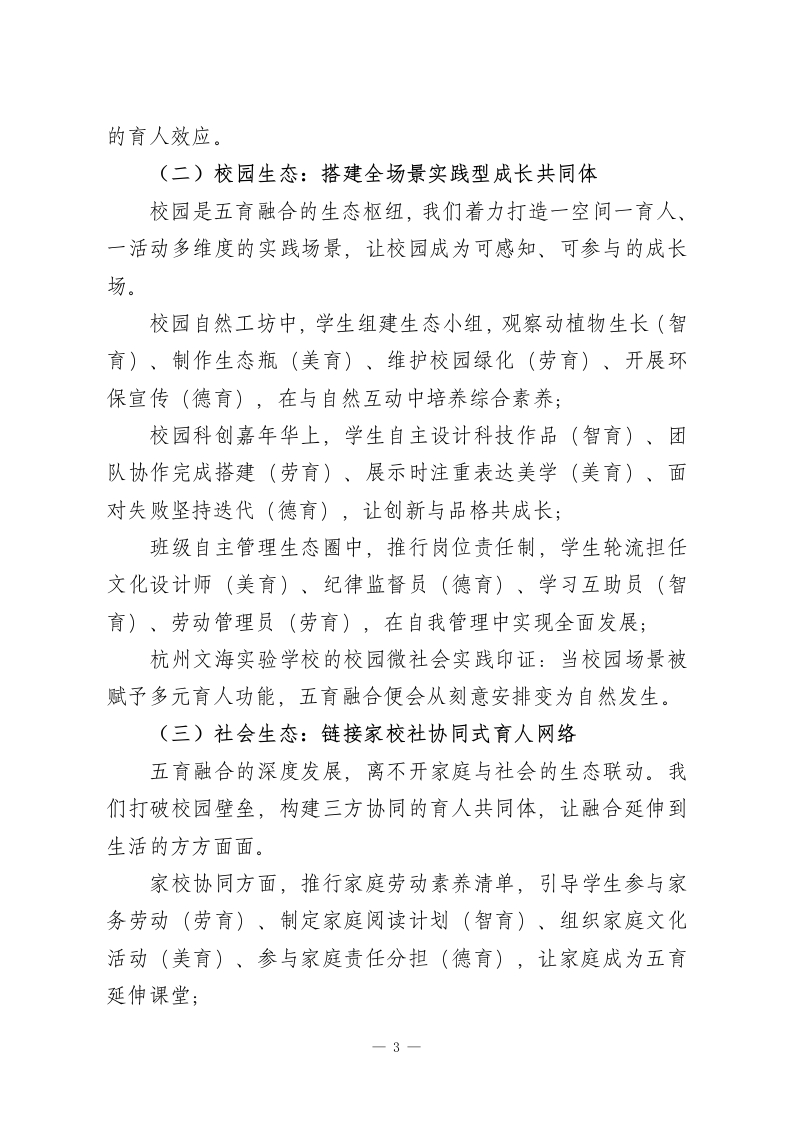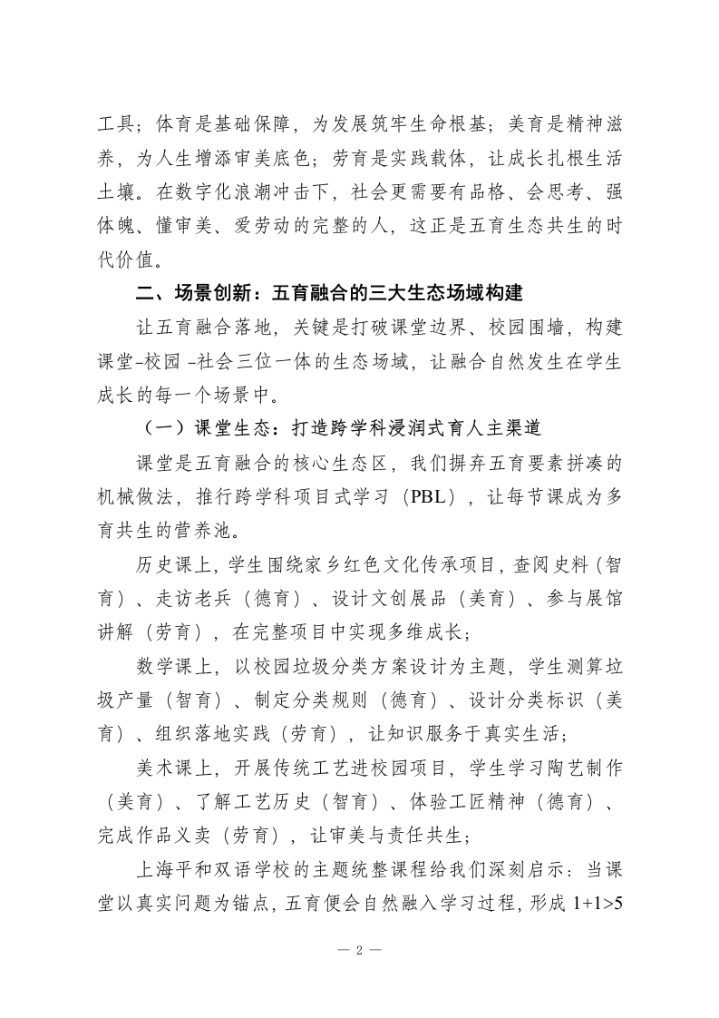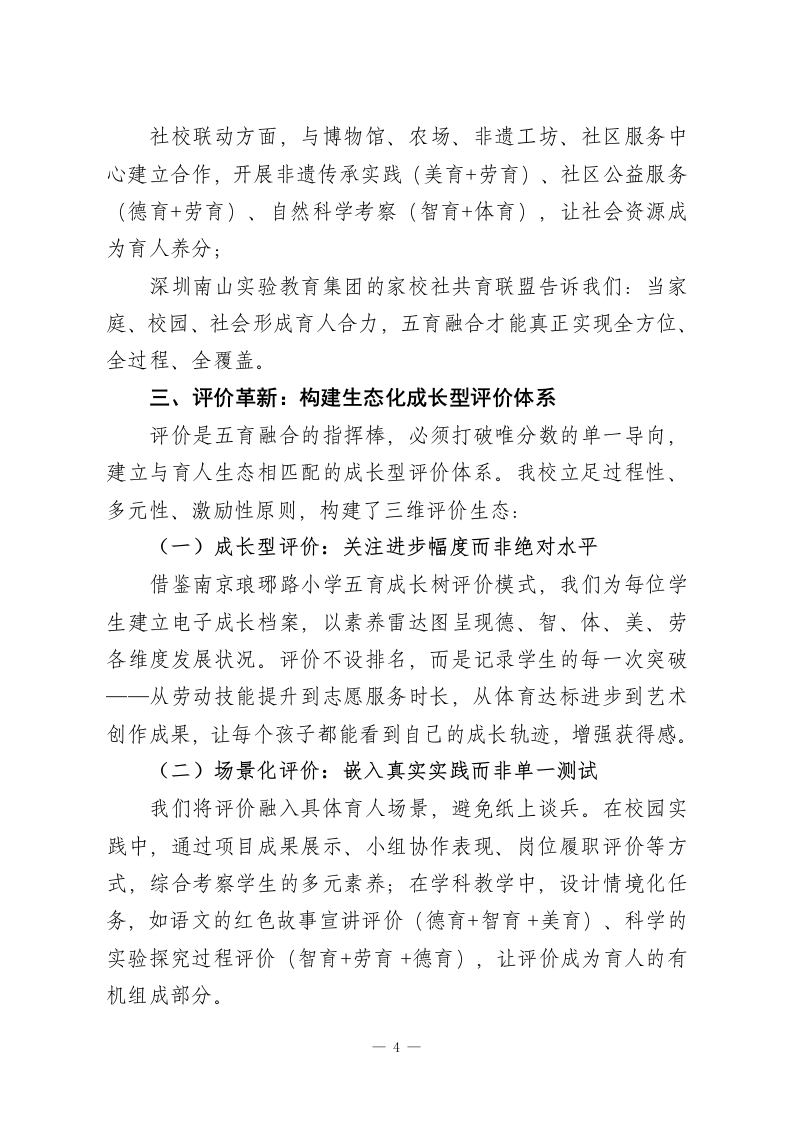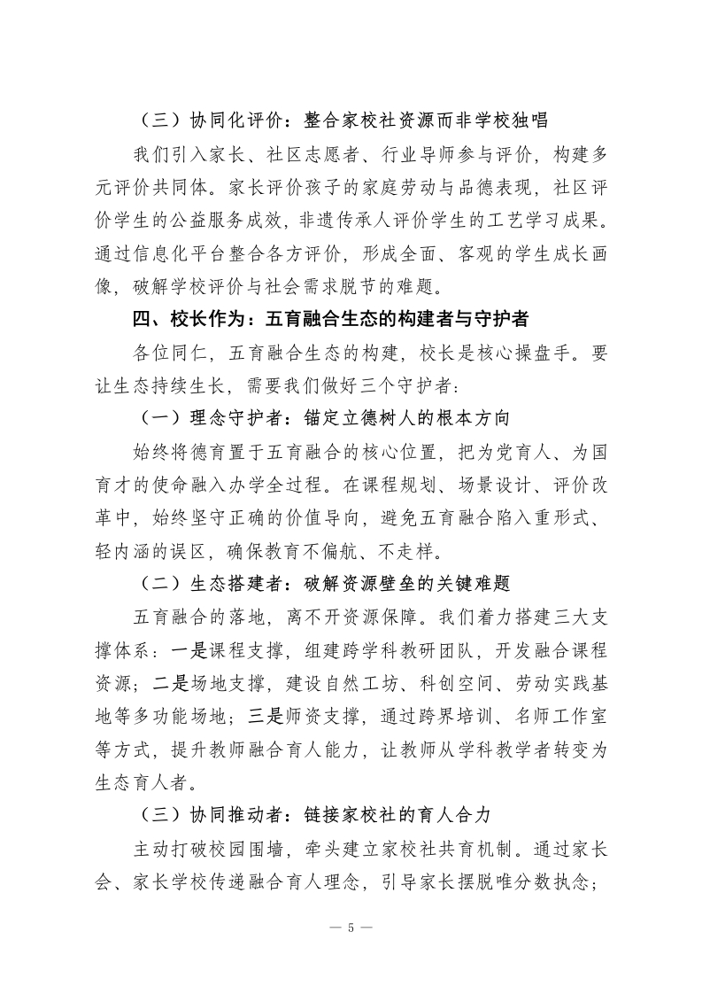 校长论坛上发言:五育融合践于行,全面育人润于心尊敬的各位教育同仁:大家好!在双减落地、教育回归本真的新时代,五育融合已不再是选择性探索,而是关乎人才培养质量的必答题。如果说五育并举是搭建了育人的四梁八柱,那么五育融合就是要构建相互滋养、动态生长的育人生态。今天,我将结合我校在生态化育人中的实践,从理念重构、场景创新、评价革新、校长作为四个维度,与各位交流心得。一、理念重构:从要素叠加到生态共生的认知跃迁习近平总书记强调培养德智体美劳全面发展的社会主义建设者和接班人,这一论述的深层内涵,是要求教育摆脱分科割裂、形式叠加的困境。回望教育发展,从陶行知先生生活即教育的实践探索,到新时代核心素养框架的提出,五育融合的本质,是让教育回归人的完整成长规律。当前,我们仍面临诸多现实挑战:德育与生活脱节,成为贴标签式的口号灌输;智育陷入刷题内卷,忽视思维与实践能力培养;体育美育停留在课时达标,缺乏素养进阶设计;劳育沦为偶尔体验,未形成常态化机制。这些问题的根源,在于我们将五育视为独立的育人模块,而非相互渗透的生态系统。新时代的五育融合,核心是建立共生逻辑:德育是方向引领,为五育注入价值灵魂;智育是核心支撑,为成长提供认知1