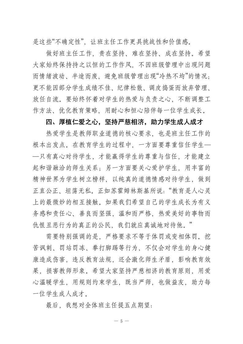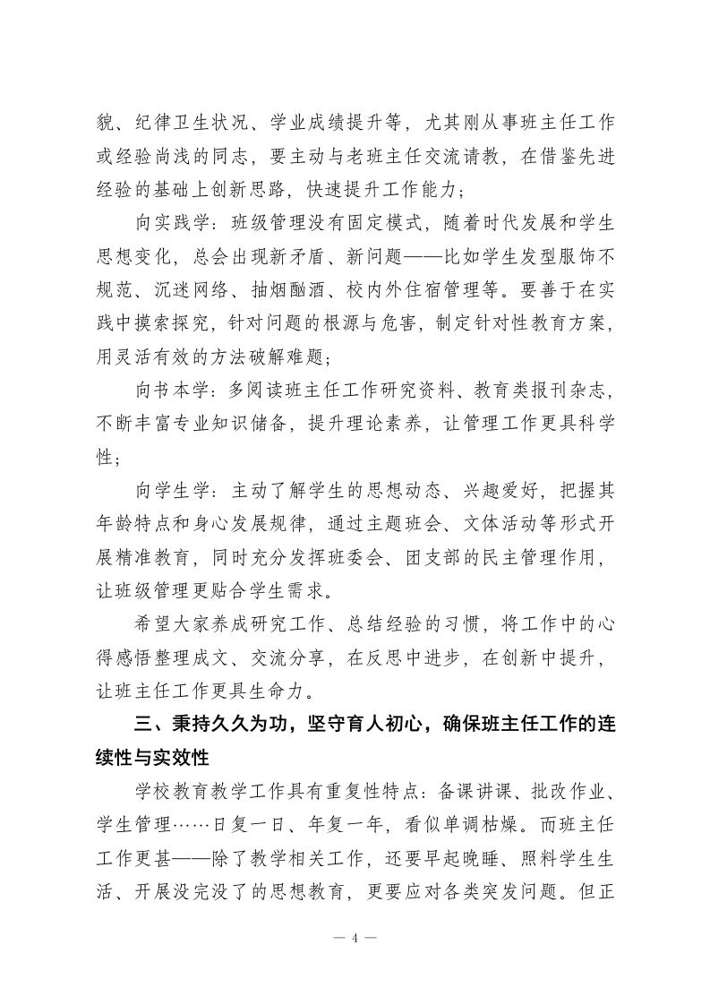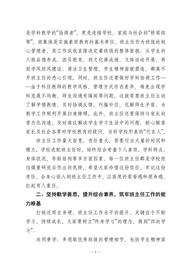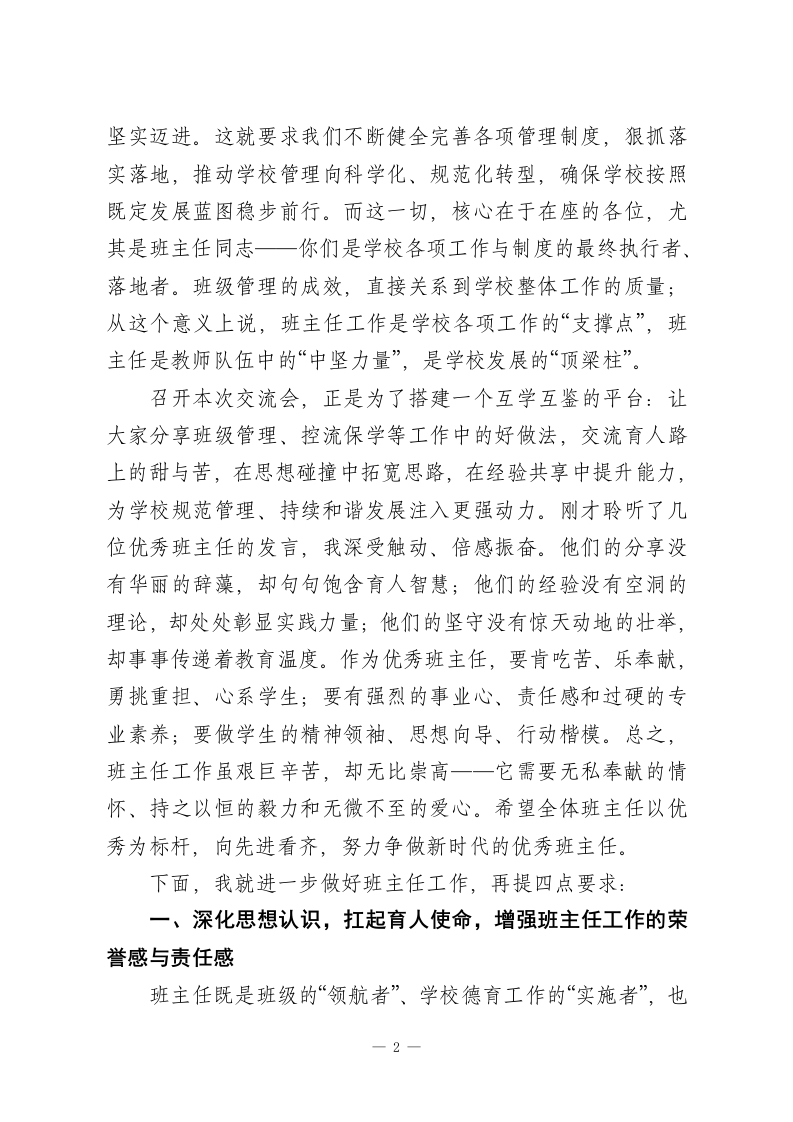 校长在班主任工作经验交流会上的讲话:深耕班级管理,赋能育人成长老师们,同志们:今天,能够与各位班主任老师、同志们齐聚一堂,共话班级管理之道、交流育人经验,我深感荣幸与欣慰。本次班主任工作经验交流会,既是一次思想的碰撞,更是一次力量的凝聚,开得及时、务实且富有成效!刚才,十二位班主任结合自身实践,分享了班级管理中的宝贵经验与深刻感悟,内容详实、干货满满。因时间所限,还有许多经验丰富的班主任未能现场交流,会后政教处将系统整理收集到的各类经验材料,汇编成册印发给大家,为全校班主任搭建常态化学习交流的平台,推动我校班主任工作再上新台阶。众所周知,班主任是学校育人工作的核心骨干,是连接学校、家庭、社会的关键纽带,更是学生成长路上的引路人、陪伴者与守护者。一所学校的办学质量,离不开一支政治过硬、业务精湛、充满爱心与责任的班主任队伍;一支强而有力的班主任队伍,正是学校行稳致远的坚实根基。我校全体班主任始终秉持务实担当的工作作风,以校为家、以生为本,识大体、顾大局,不计个人得失、默默无私奉献,用一言一行诠释着教育者的初心与使命,展现出高尚的思想境界与职业操守。在此,我代表学校,向各位班主任的辛勤付出与无私奉献,致以最诚挚的感谢和最崇高的敬意!当前,我校正稳步推进管理改革,朝着精细化管理的目标1