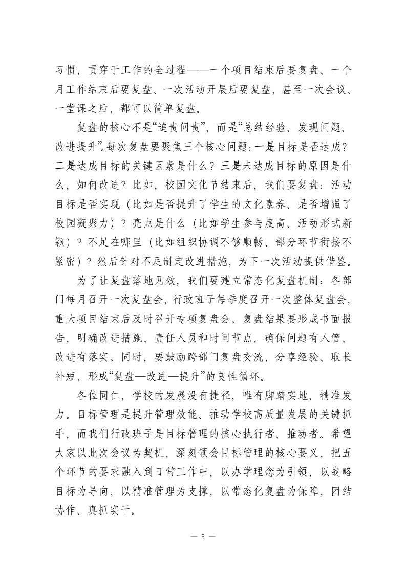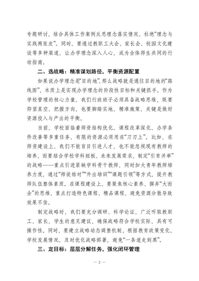 校长在行政班子工作会上发言:以目标管理为抓手,筑牢学校高质量发展根基各位同仁:今天我们召开行政班子工作会,核心是聚焦学校管理的本质一一目标管理,明确接下来的工作方向、细化实施路径。作为学校发展的“领头雁”,我们行政班子的管理效能直接关系到办学质量、师生成长和学校长远发展。结合学校当前发展阶段,我将围绕目标管理的五个核心环节,与大家深入交流,也明确后续工作的具体要求。一、盘理念:锚定办学初心,筑牢发展根基办学理念是学校发展的“定盘星”,是我们对每一位学生、家长和教职工的庄严承诺,更是全体师生共同遵循的行为准则,其重要性堪比“学校宪法”。但理念绝不是挂在墙上的标语,更不能停留在口头宣传,需要我们持续深入思考、反复践行校准。行政班子成员要带头钻研办学理念的核心内涵一一我们究竟要培养什么样的人?要为学生的终身发展奠定哪些基础?要为教师的职业成长搭建怎样的平台?这些问题需要我们结合教育政策导向、区域教育现状和学校自身特色,不断研讨、凝聚共识。比如,我们提出“全面发展、个性成长”的理念,就不能只停留在口号上,而要思考如何通过课程设置、教学改革、活动开展,让每个学生都能找到自己的闪光点,让每个教师都能在教书育人中实现价值。未来,我们要建立理念研讨常态化机制,每季度组织一次1