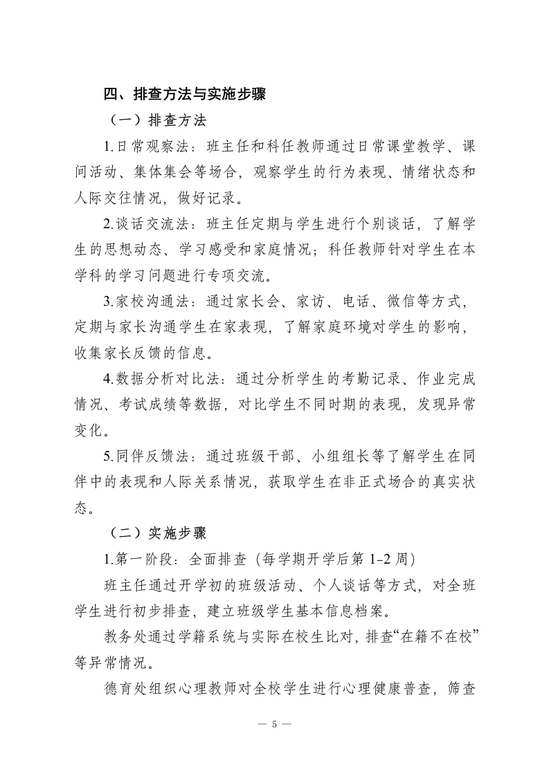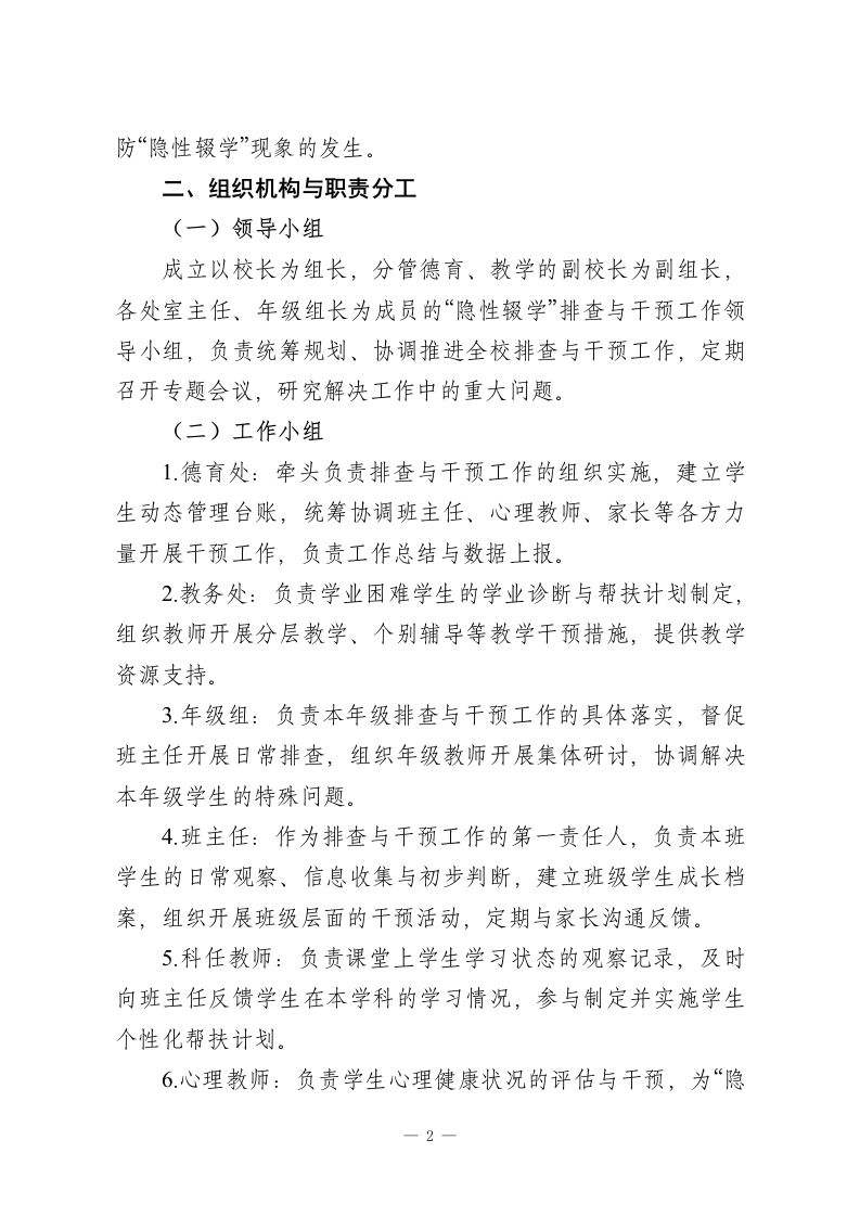 学校“隐性辍学”排查与干预工作方案(2026年)为全面贯彻落实国家和地方关于义务教育控辍保学工作的决策部署,有效防范和化解“隐性輟学”风险,保障每一位学生平等接受义务教育的权利,促进学生全面健康发展,结合本校实际,特制定本工作方案。一、指导思想与工作目标(一)指导思想以习近平新时代中国特色社会主义思想为指导,全面贯彻党的教育方针,落实立德树人根本任务,坚持“预防为主、防治结合、精准识别、分类施策、协同育人”的原则,构建全员参与、全程覆盖、全方位保障的“隐性辍学”防控体系,筑牢教育公平底线,为学生健康成长保驾护航。(二)工作目标1.建立科学精准的“隐性辍学”识别指标体系,实现对全校学生学习状态的动态监测,确保隐性辍学风险早发现、早预警、早干预。2.构建“学校-家庭-社会”三位一体的协同育人网络,形成“排查-预警-干预-跟踪-巩固”的全流程闭环管理机制。3.对排查出的“隐性辍学”风险学生实施精准帮扶,使95%以上的学生能够重新回归正常学习状态,有效降低实际辍学率,确保义务教育巩固率达到100%。4.营造积极向上、关爱包容的校园文化氛围,从根本上预一1