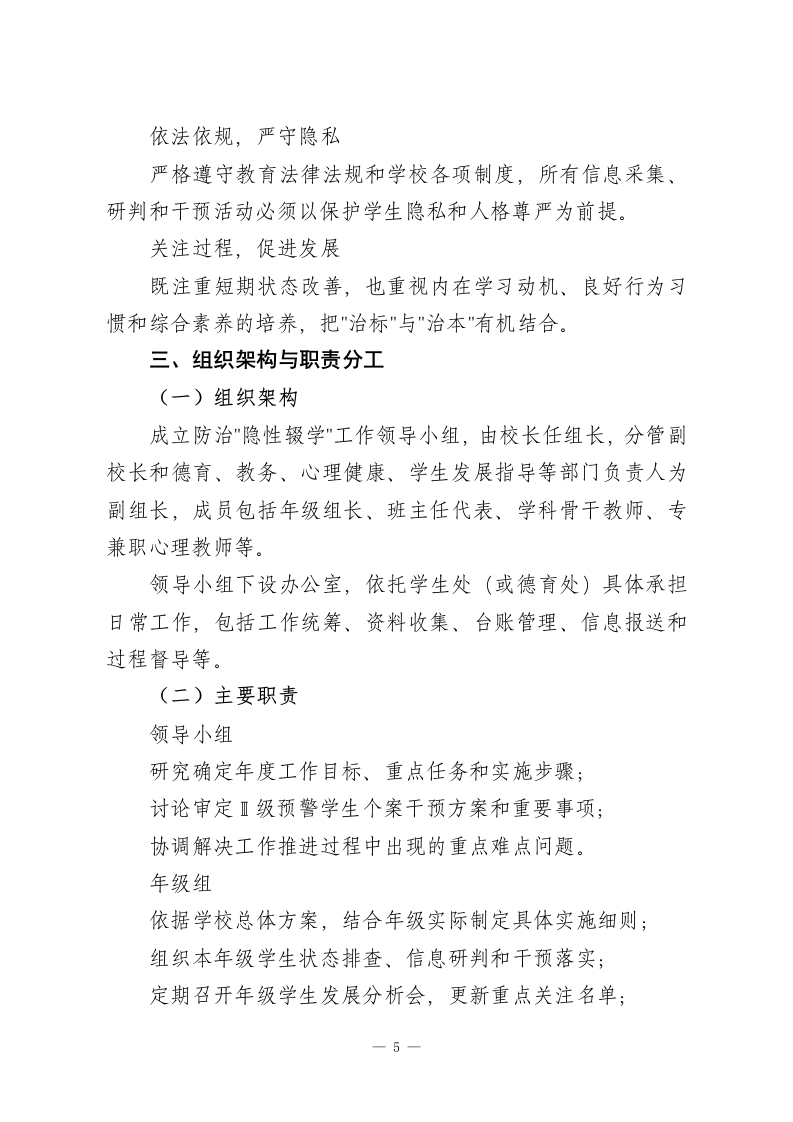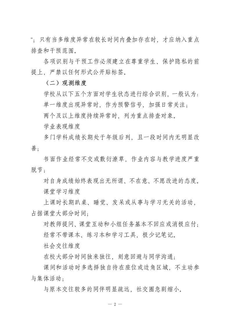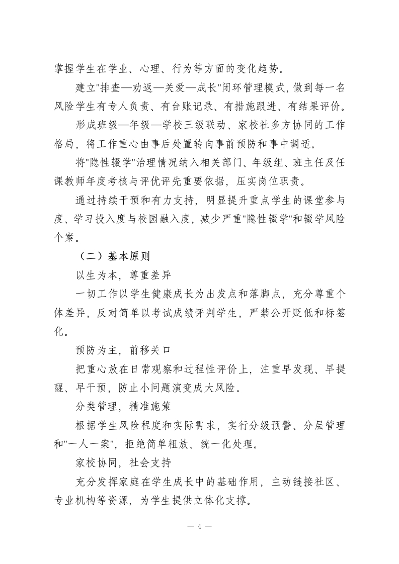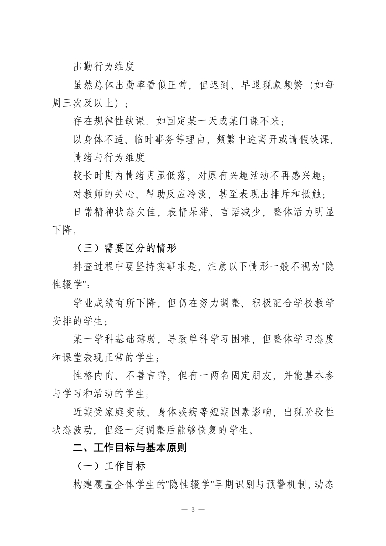 学校“隐性辍学”排查与干预工作方案为全面落实《教育部办公厅关于开展基础教育规范管理巩固年行动的通知》(教基厅函〔2026]5号)精神,切实推进课堂教学提质增效和学生身心健康发展,着力解决学生"人在校园、心不在学"等突出问题,本校在深入调研和充分论证的基础上,构建"排查一劝返一关爱一成长"四位一体工作闭环,特制定本实施细则。本细则所称"“隐性辍学"防治,重在通过制度建设和精准干预,帮助每一名学生真正融入课堂、参与学习、实现成长,确保受教育权得到实质性保障。一、概念界定与识别标准(一)基本内涵本细则所称“隐性辍学"学生,是指虽形式上保持在校在班、出勤基本正常,但在主观动机、学习行为和社会交往等方面已与正常学习状态发生明显脱节的学生群体。其常见表现包括:对学习缺乏基本兴趣和内在动力,长期不愿投入;学业基础严重断层,难以跟上教学进度,缺乏必要的补偿与支持;存在持续的情绪困扰或心理问题,影响其参与学习:受到家庭教育方式、监护状况等不利因素影响,对学校生活产生疏离感。“隐性辍学"的突出特征在于过程的持续性和问题的多维性。偶尔的成绩波动、短期的情绪低谷,不能简单认定为"隐性辍学一1