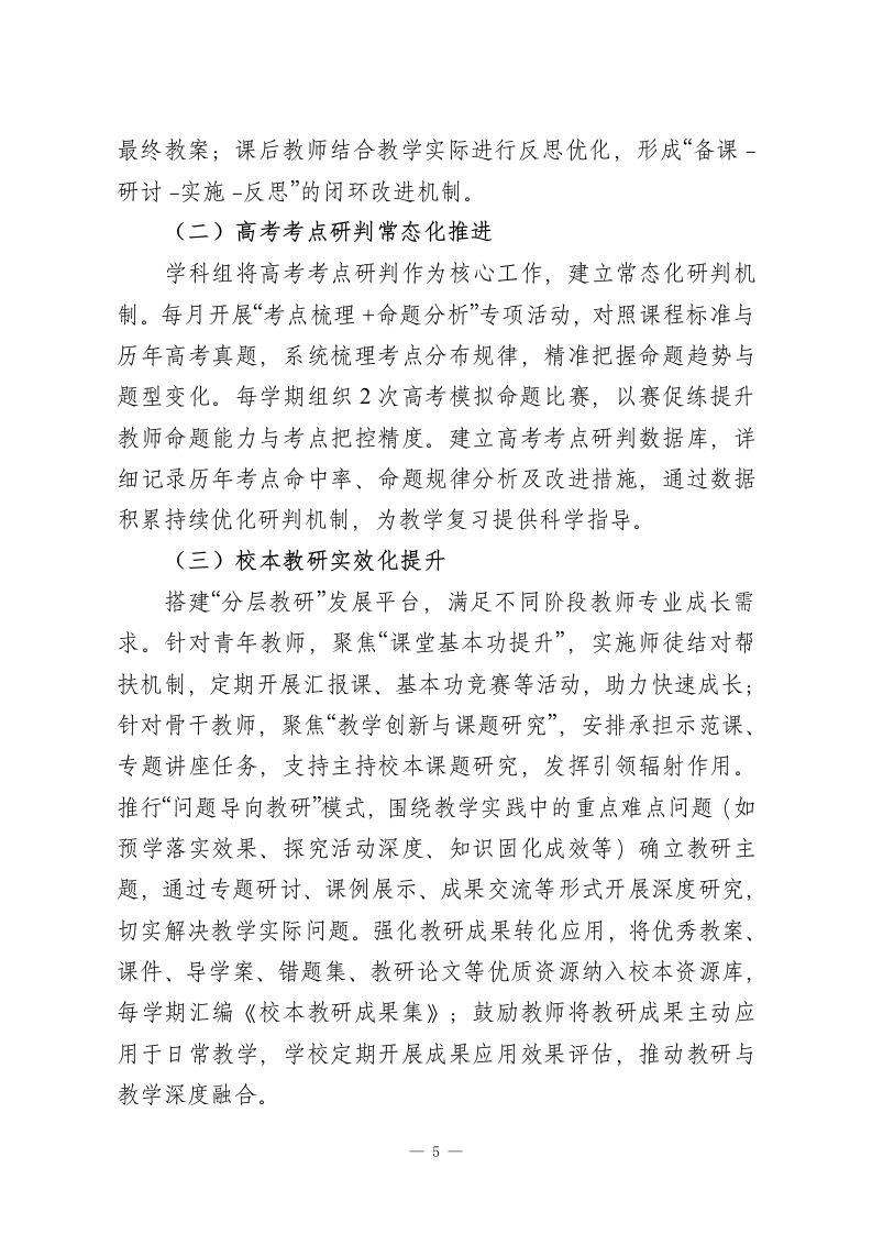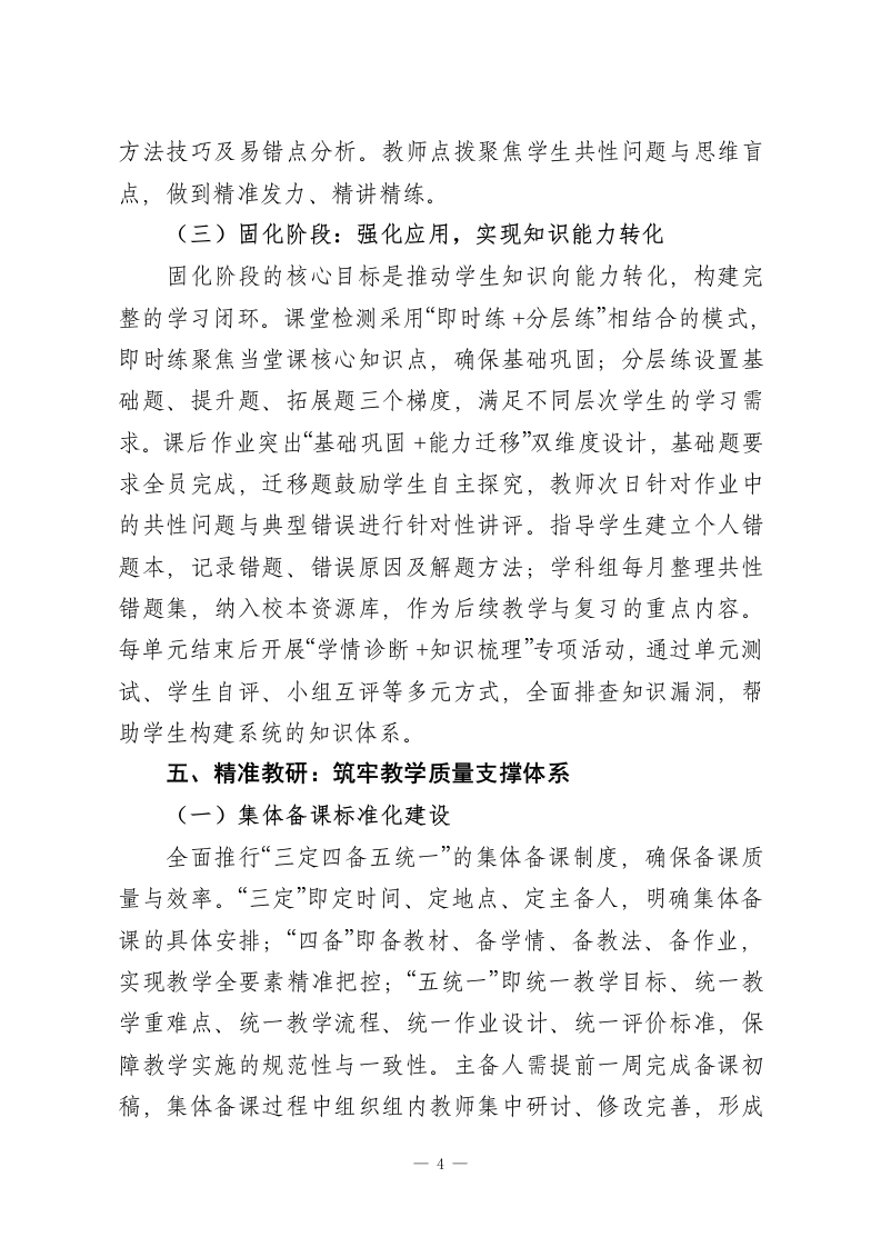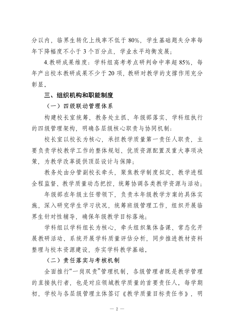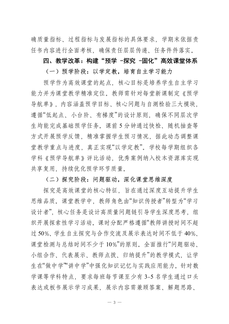 学校高质量教学管理“四位一体”全流程落地实施方案(修订版)一、指导思想以《深化新时代教育评价改革总体方案》《基础教育课程教学改革深化行动方案》精神为根本遵循,坚守立德树人根本任务,以“课堂提质、教研固本、管理增效、评价导向”为核心主线,紧扣“让学生人人有收获、使教师个个有成就”的工作愿景,构建科学规范、精准高效、持续改进的教学管理闭环体系,全面推动学校教育教学质量跨越式提升。二、工作目标(一)整体目标通过三年系统建设,形成以高效课堂为核心载体、精准教研为坚实支撑、量化考核为内生动力、学生能力提升为最终目标的教学管理机制,实现教学质量稳步攀升、教师专业素养持续精进、学生综合素质全面发展的良性发展格局。(二)具体指标1.课堂教学维度:优质课占比不低于85%,学生课堂参与度及主动学习比例较实施前提升30%以上,课堂教学效率显著提高;2.教师发展维度:教研活动全员参与率达100%,集体备课达标率实现100%,每年培育市级以上骨千教师不少于10人,教师专业成长通道畅通;3.学生发展维度:各年级各学科平行班平均分差值控制在5一1