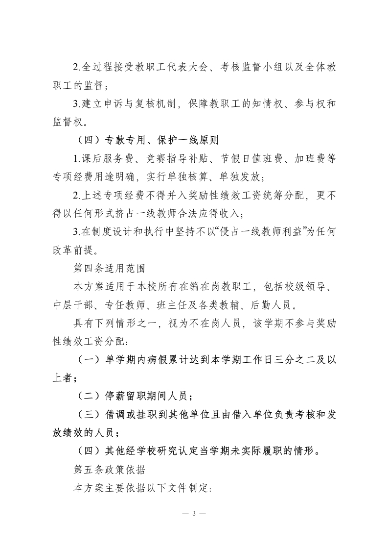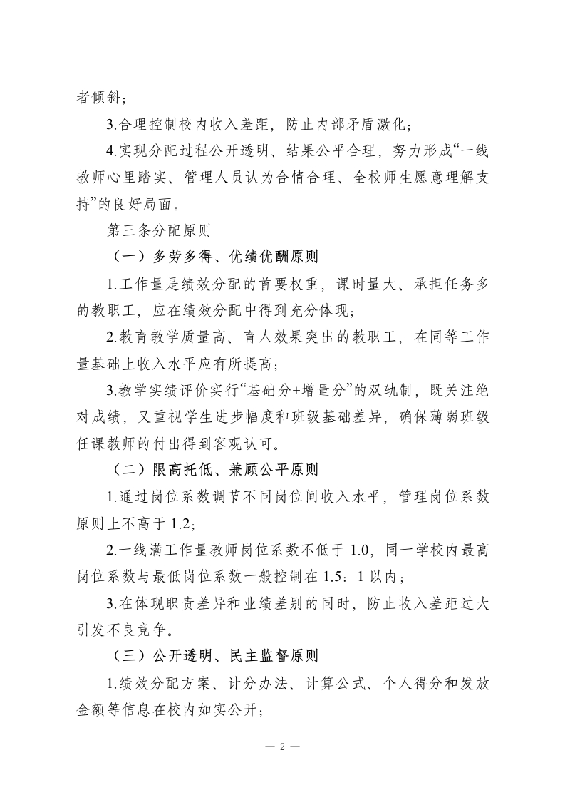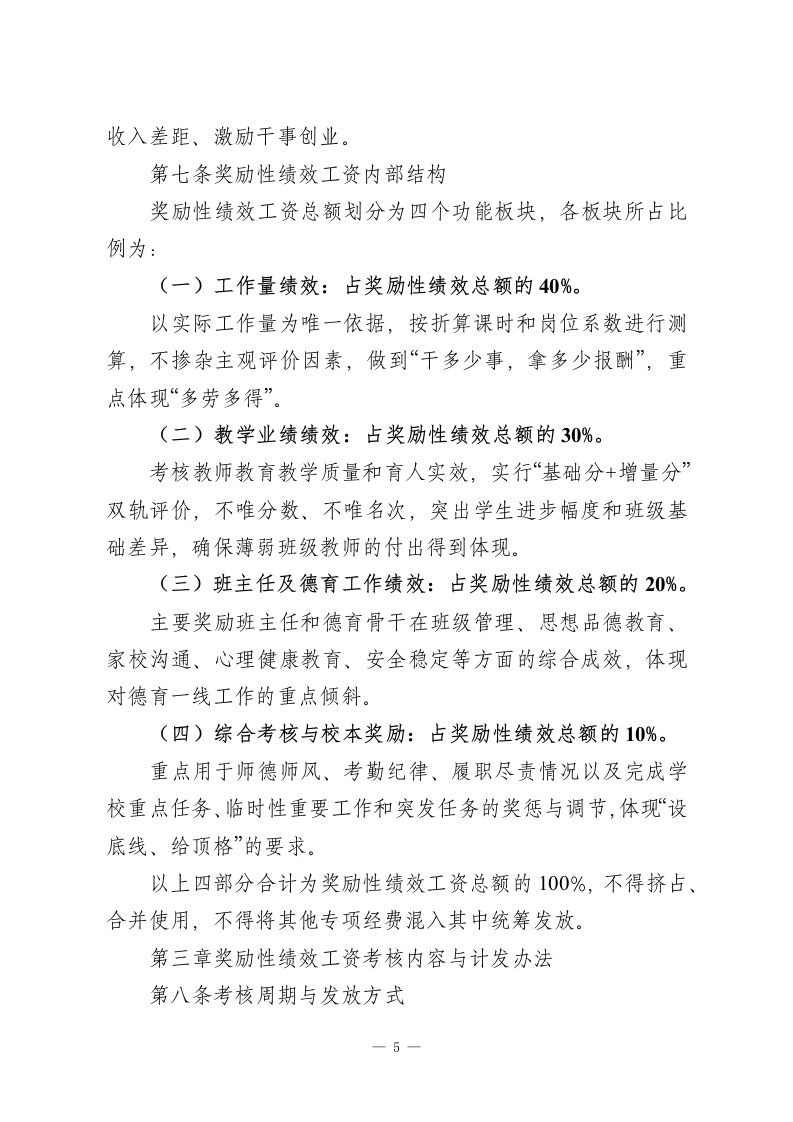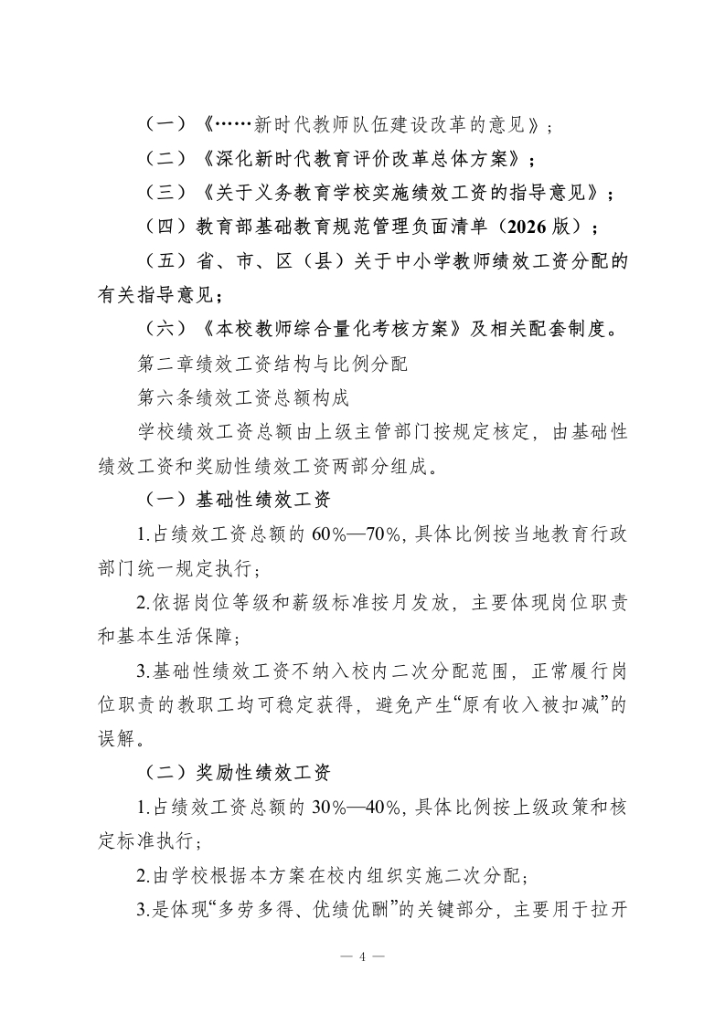 学校奖励性绩效工资分配方案(2026年修订版)第一章总则第一条制定目的与依据为全面贯彻落实《深化新时代教育评价改革总体方案》《关于深化中小学教师绩效工资制度改革的指导意见》等文件精神,进一步健全以“岗位职责、实际工作量和工作实绩”为核心的收入分配机制,突出向班主任、教学一线和教育教学成效突出的教师倾斜,增强分配制度的公平性、激励性和可持续性,特制定本实施方案。本方案经学校教职工代表大会审议通过后施行,并根据国家和省市区新出台的政策规定以及学校实际运行情况适时修订完善。第二条指导思想与基本目标(一)指导思想坚持以习近平新时代中国特色社会主义思想为指导,紧扣新时代教师队伍建设改革要求,把绩效工资分配与教育质量提升、学生全面发展和教师专业成长紧密结合,充分发挥绩效工资的导向、激励和保障功能。(二)基本目标1.建立以工作量为基础、业绩为导向、兼顾岗位差异的绩效工资分配机制;2.体现向班主任和教学一线倾斜、向成绩突出和担当奉献一1