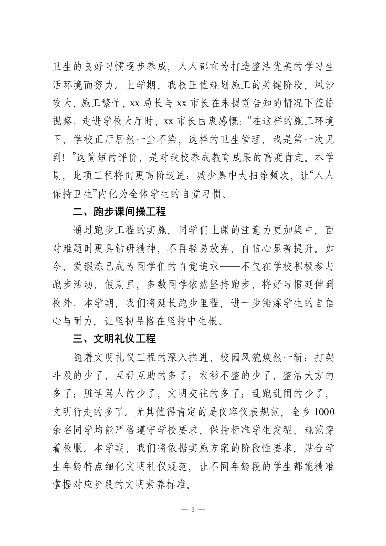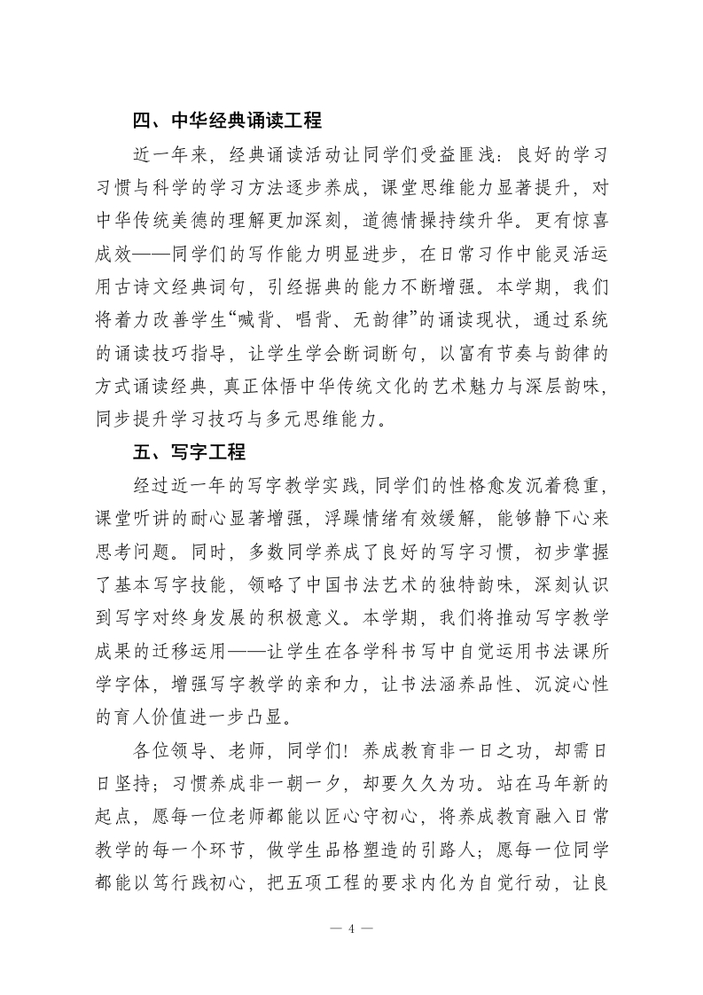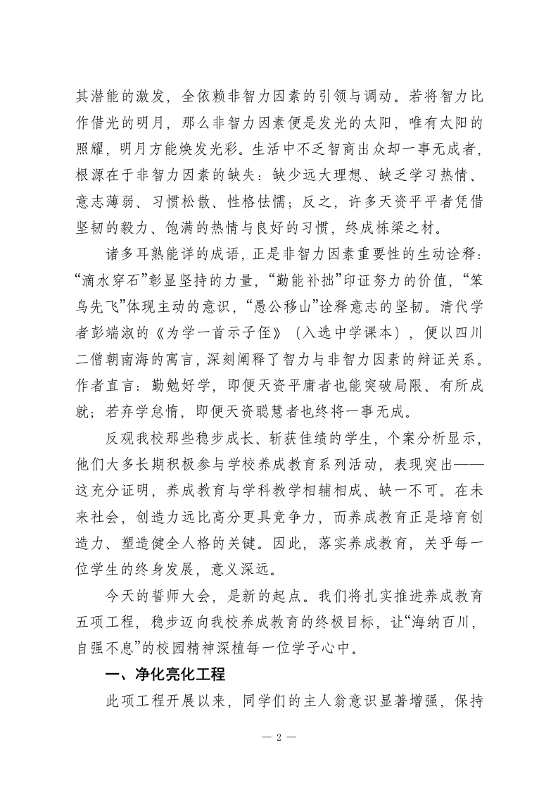 学校进一步深化养成教育誓师大会,校长讲话:扎实推进养成教育五项工程尊敬的各位领导、老师,亲爱的同学们:大家好!今天,我们隆重召开Xx学校养成教育深化推进誓师大会,旨在深入贯彻《市中小学生养成教育实施细则》,持续擦亮我校养成教育品牌,让良好习惯成为每一位学子的人生底色。多年来,我校深耕学案导学教学改革,学生学业成绩实现跨越式提升。但这份成绩的背后,绝非单一教学改革所能成就一一它离不开我们始终坚守的非智力因素培养。非智力因素涵盖成就动机、求知欲望、学习热情、责任感、义务感、荣誉感、自信心、自尊心、好胜心、坚持性、自制性、独立性等十二项核心心理品质,可概括为“三感三心“三性”。对学校而言,非智力因素培养正是养成教育的核心要义:锤炼学生的意志力与道德修养,培育直面困难的勇气与自信自立自强的心理素质。教育既要“解惑”传授知识,更要“授道”塑造人格,综合素质的提升远比单纯的智力发展更为重要。而非智力因素恰是智力增长的“催化剂”,能全方位促进学生潜能的激发与释放。从功能维度看,智力的核心是认知能力,解决“知不知、懂不懂”的问题;而非智力因素则承载着六大关键作用一动力、定向、引导、维持、调节、强化。当一个人确立远大目标,在浓厚兴趣、炽热情感与顽强意志的驱动下,便会锲而不舍、矢志不渝,这正是非智力因素的强大力量。智力本身并无主动性,—1