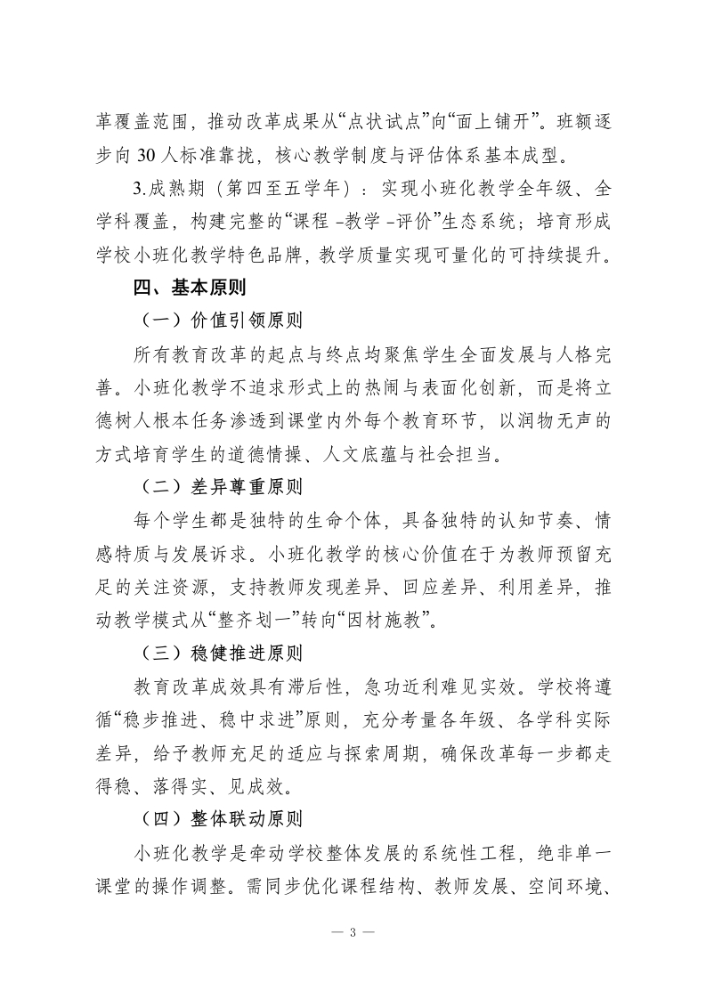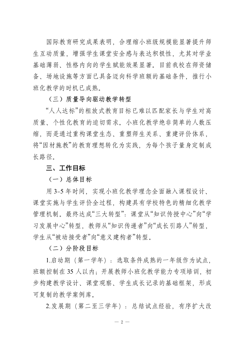 学校小班化教学实施方案(2026年修订版)当前我国基础教育已迈入从规模扩张向质量提升的转型关键期。伴随人口结构深度调整,学龄人口呈阶段性下降态势,传统“大班额”教学模式已完成其历史使命,教育精耕细作的时代契机已然来临。为抢抓战略机遇,推动课堂教学从粗放式覆盖向精准化育人转型,依据国家教育改革总体部署及学校发展实际,特修订本实施方案。一、指导思想以立德树人根本任务为引领,锚定学生核心素养培育目标,秉持“每个生命都应得到精心滋养”的教育理念,以学生成长质量作为改革的核心标尺。着力推动课堂从“知识传播场”转型为“思想碰撞场”,彻底改变大班教学中部分学生“隐形化”的现状,让优质教育的阳光照亮每个孩子的成长之路、温暖每张纯真笑脸,创办人民满意的高品质教育。二、改革背景与现实依据(一)人口结构调整带来结构性机遇近年我校新生入学人数持续优化,部分年级班额已低于历史平均水平。生源总量的阶段性下降虽短期内对资源配置带来一定挑战,但从长远视角看,为班级“瘦身提质”、推进教育精准化创造了前所未有的条件。主动把握此次机遇深化改革,既是对学校治理能力的检验,更是对学生成长与家长期盼的郑重回应。(二)国际经验提供有益借鉴1
