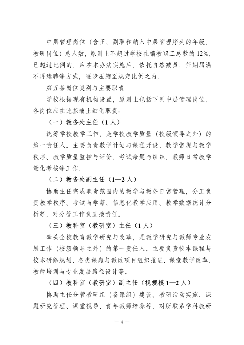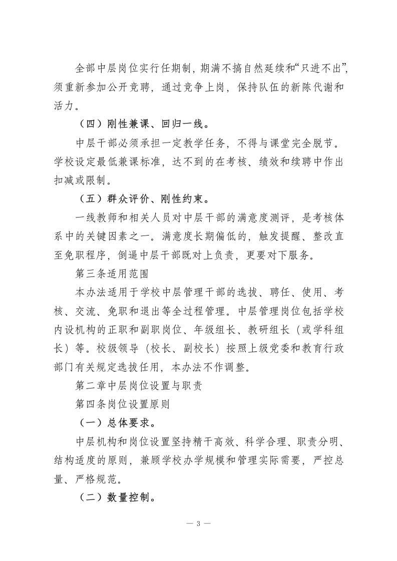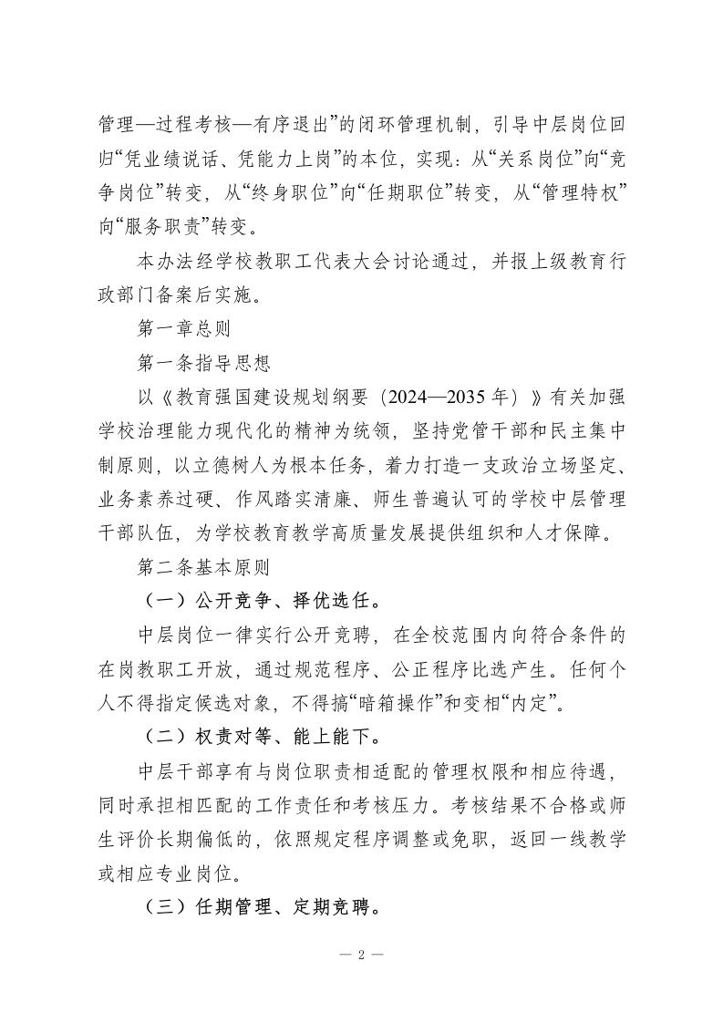 学校中层管理岗位选聘与考核管理方案(2026年修订版)方案说明中层管理队伍是学校治理结构中的“腰部”,承上启下、联结左右:校长的办学思路和学校发展规划,需要依靠中层细化落实;一线教师和学生的各种合理诉求,需要通过中层系统收集、梳理和反馈;各项制度的运行、工作的协调推进,也主要依赖中层干部。某种意义上,一所学校管理水平高低,与其中层干部队伍的能力素质和工作作风密切相关。在实际运行中,中层岗位也暴露出不少共性问题:一是选人用人透明度不高,往往依赖校长个人印象和偏好,公开竞聘不足,“关系近的上、真有本事的未必上”:二是岗位稳定性过强,“一上终身”,干好干坏差别不大,中层职位逐渐异化为“铁交椅”;三是部分中层基本不上课或象征性兼两节课,却享受明显高于满工作量一线教师的绩效,容易被质疑为“官本位绩效”:四是职责边界模糊,权责划分不清,既有互相推诿、踢皮球,也有越位包办、越权干预;五是考核流于形式,年度只填材料、走程序,缺失有效的退出通道;六是中层只习惯向上负责,对下服务意识不强,一线教师满意度偏低,但缺乏实质性约束。为系统破解上述难题,本办法拟建立涵盖“公开选聘一任期一1