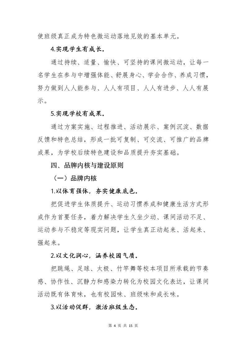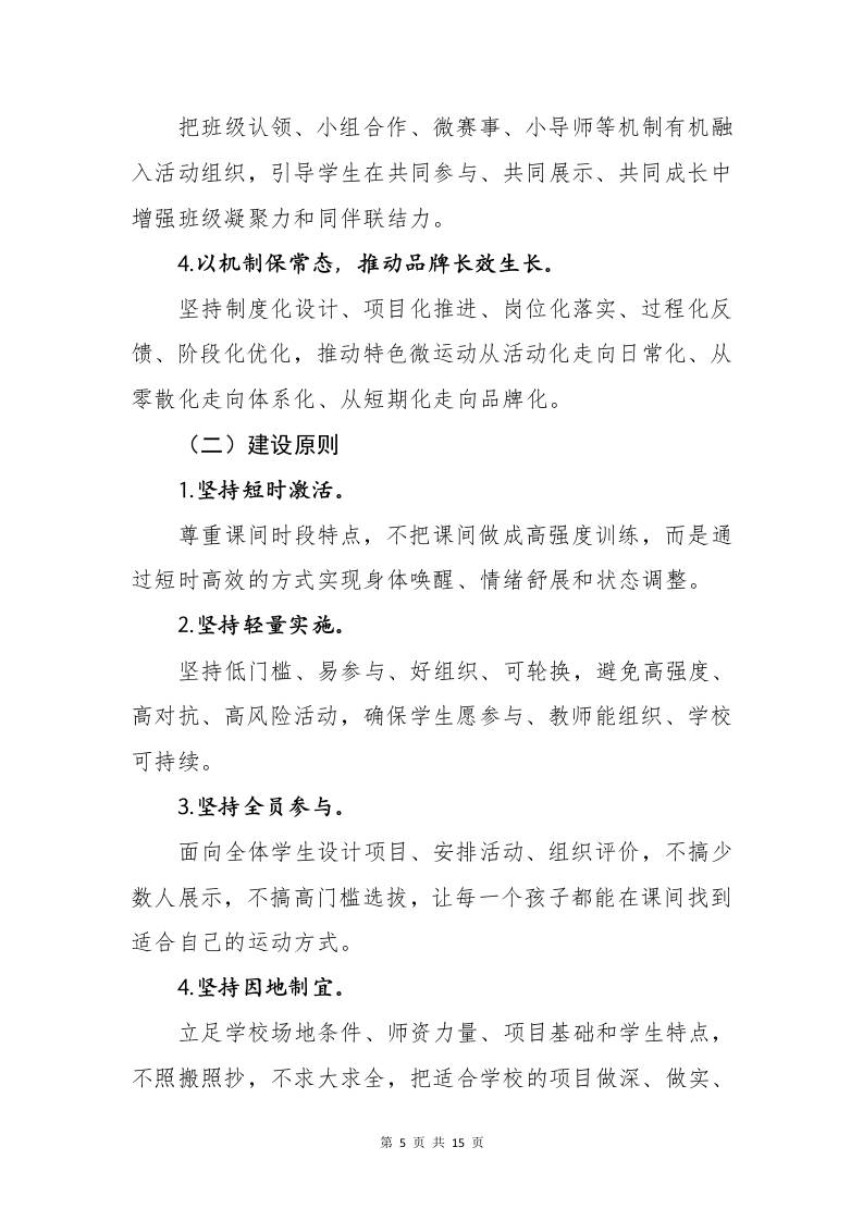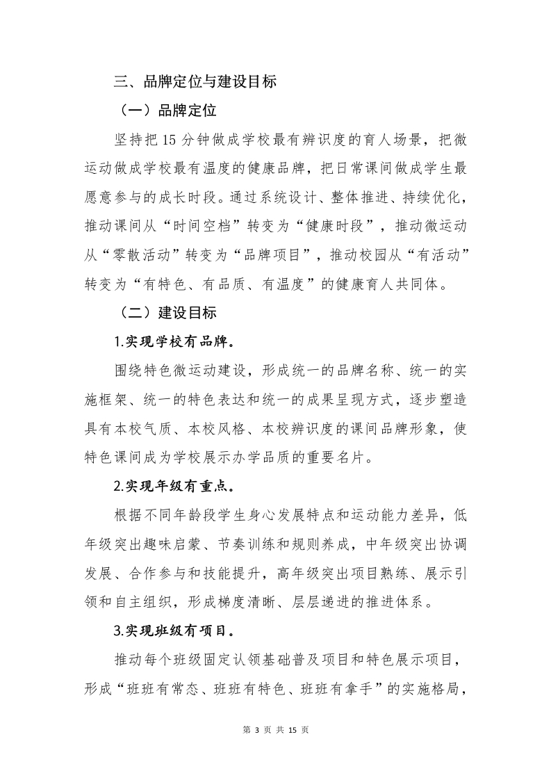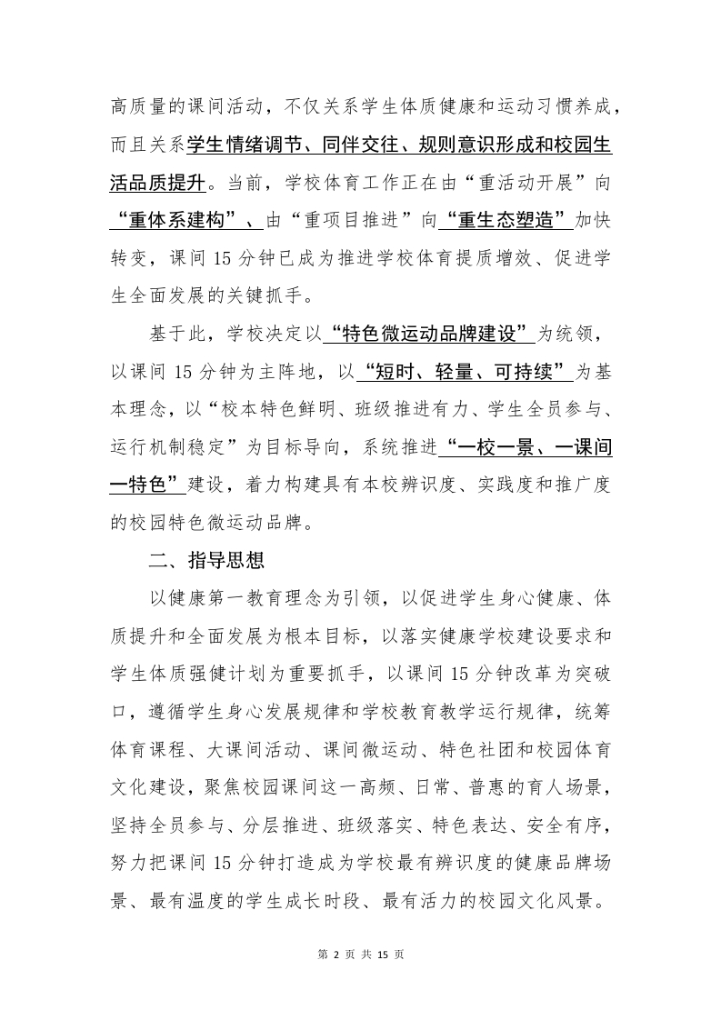 一校一景,一课间一特色一学校15分钟“微运动”品牌建设方案一校一景,一课间一特色学校15分钟“微运动”品牌建设方案0000010088680000为深入贯彻健康第一教育理念,全面落实关于加强新时代学校体育工作、推进健康学校建设、实施学生体质强健计划等有关要求,切实把课间15分钟打造成为学生舒展身心、增强体质、涵养习惯、展示风采的重要时段,把“每天综合体育活动时间不低于2小时”的要求落实到校园日常,把“人人有项目、班班有活动、校校有特色、周周有比赛”的导向转化为学校体育工作的生动实践,结合学校办学实际,特制定本方案。一、品牌建设背景课间是学校教育教学的重要组成部分,是学生一日校园生活中最具普惠性、最具生成性、最具日常性的育人场景。第1页共15页