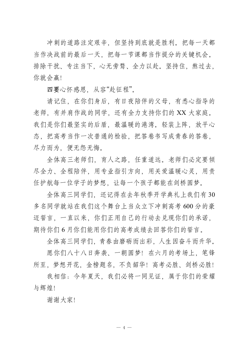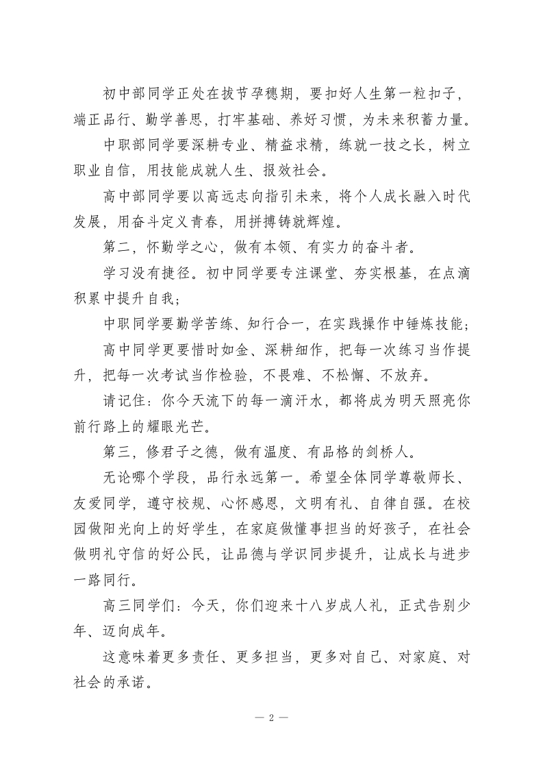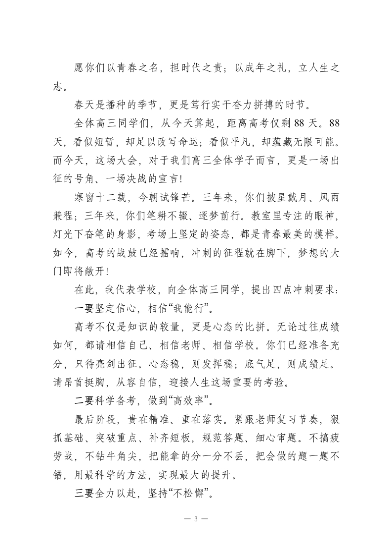 在2026年春季高三迎高考88天誓师动员大会、高三成人礼仪式上的讲话尊敬的各位家长、老师、亲爱的同学们:大家上午好!春风浩荡启新程,奋楫扬帆向未来。今天,我们XXXX校区全体师生欢聚一堂,隆重举行2026年春季高三迎高考88天誓师动员大会、高三成人礼仪式。首先,我谨代表学校,向一直以来信任支持、默默付出、全程陪伴的全体高三家长朋友们表示热烈欢迎和衷心感谢。向辛勤耕耘、默默奉献的全体教职工,致以最崇高的敬意!向朝气蓬勃、奋发向上的全体同学,致以新学期最美好的祝福!向刚刚获奖的先进集体、先进个人表示热烈的祝贺。向朝气蓬勃、奋发向上的全体同学,致以新学期最美好的祝福!向冲刺中考的初三同学、尤其向即将成年、全力迎战高考的高三全体学子,致以最诚挚的敬意和最美好的祝愿:祝你们六月圆梦,蟾宫折桂,金榜题名,马到成功。刚刚过去的一学期,是XX校区全体师生同心同德、实干笃行的一学期。高中部稳中求进、学风浓厚;初中部夯实基础、全面发展;中职部技能精进、特色鲜明。三校三学段同根同源、同向同行,共同书写了XXXX校区在XX教育史上的奋进篇章。在此,我向全体同学提出三点希望:第一,立鸿鹄之志,做有理想、有担当的新时代青年。1