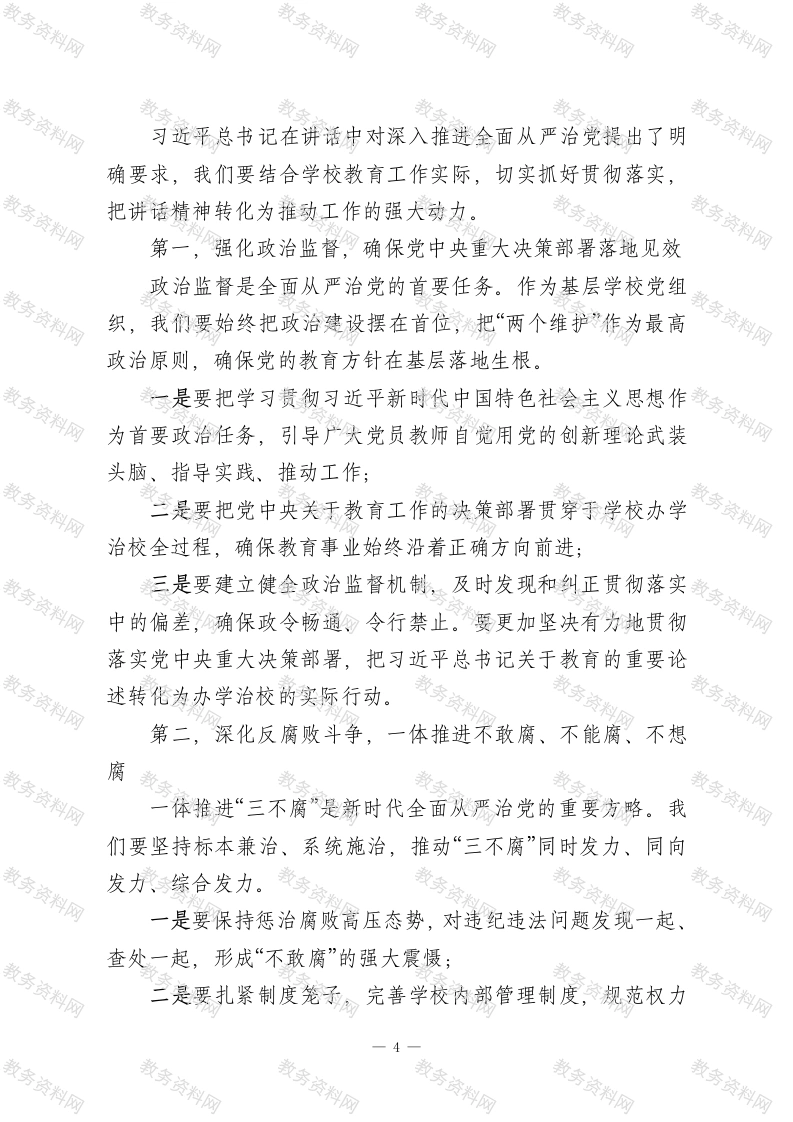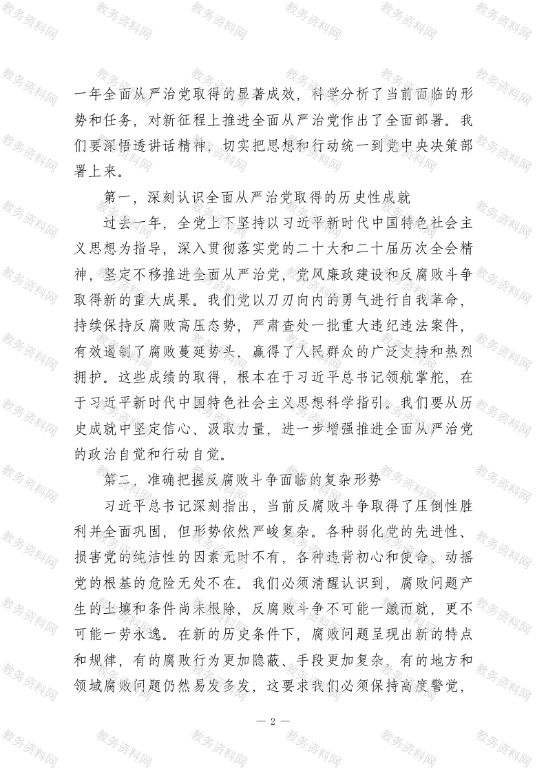 在XX市第十一小学党支部2026年第一季度党课上的讲稿各位党员同志:大家好!今天,我们召开2026年第一季度党课活动,主题是“以永远在路上的坚韧和执着推进全面从严治党”,主要内容是学习习近平总书记在二十届中央纪委五次全会上的重要讲话精神。此次党课面向全体党员同志开展,旨在深入学习领会总书记重要讲话的精神实质和实践要求,进一步统一思想认识、强化责任担当,推动全面从严治党在学校基层落地生根、开花结果。今年1月12日至14日,二十届中央纪委五次全会在北京胜利召开。习近平总书记在会上发表重要讲话,深刻分析了当前反腐败斗争面临的复杂形势,对新征程上深入推进全面从严治党、党风廉政建设和反腐败斗争作出了战略部署,为我们在新时代新征程上坚定不移推进党的自我革命提供了根本遵循。2026年是“十五五”规划开局之年,也是教育强国建设的关键之年。在这一重要历史节点,深入学习贯彻总书记重要讲话精神,对于我们深刻把握全面从严治党新形势新任务,以高质量党建引领教育事业高质量发展,具有重大而深远的意义。下面,我从三个方面和大家交流学习体会。一、深刻领会讲话精神的核心要义,筑牢思想根基习近平总书记在二十届中央纪委五次全会上的重要讲话,高屋建瓴、视野宏阔、思想深邃、内涵丰富,系统总结了过去1