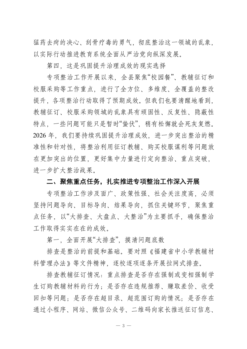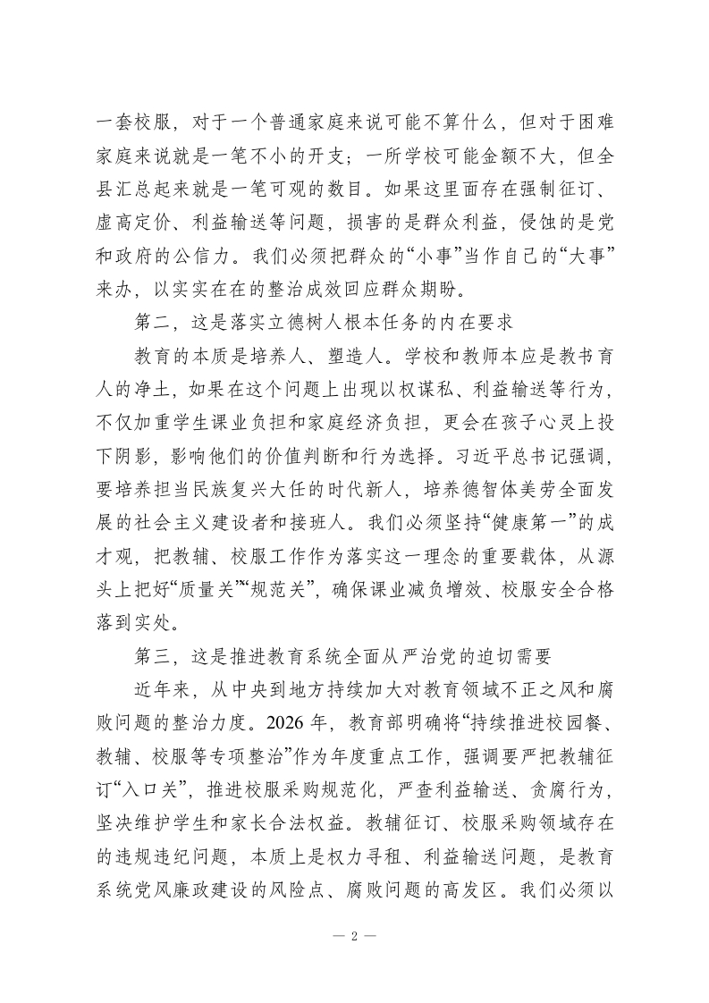 在XX县教育系统“纠治征订教辅、购买校服乱象”问题专项整治工作部署会上的讲话同志们:今天,我们在这里召开全县教育系统“纠治征订教辅、购买校服乱象”问题专项整治工作部署会,主要任务是深入学习贯彻习近平总书记关于教育的重要论述和重要指示批示精神,全面落实党中央、国务院及省市关于规范教育收费、治理教育乱收费工作的决策部署,对全县教育系统教辅材料征订和校服采购专项整治工作进行再动员、再部署、再推进,切实维护学生和家长的合法权益,营造风清气正的教育生态。刚才,县教育局汇报了前期专项整治工作开展情况、存在问题以及下一步工作计划,讲得很全面、很具体,我完全同意。下面,我就进一步抓好这项工作,讲三点意见。一、提高政治站位,深刻认识开展专项整治工作的重要意义教辅材料征订和校服采购,看似是教育领域的具体事务,实则事关群众切身利益、事关教育公平正义、事关党和政府形象。我们必须从政治高度来认识和把握这项工作。第一,这是践行以人民为中心发展思想的具体体现教育是最大的民生。教辅材料、校服问题与每个学生家庭息息相关,是群众关注的焦点、社会关切的热点。一本教辅、