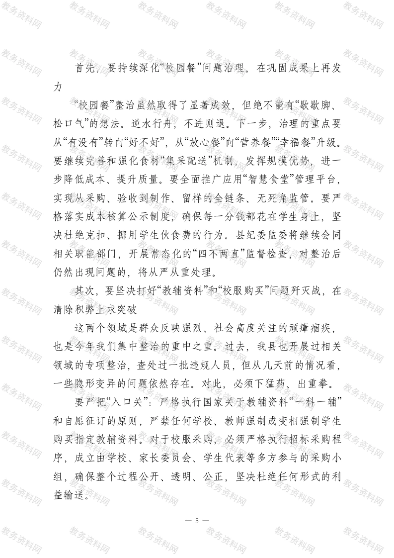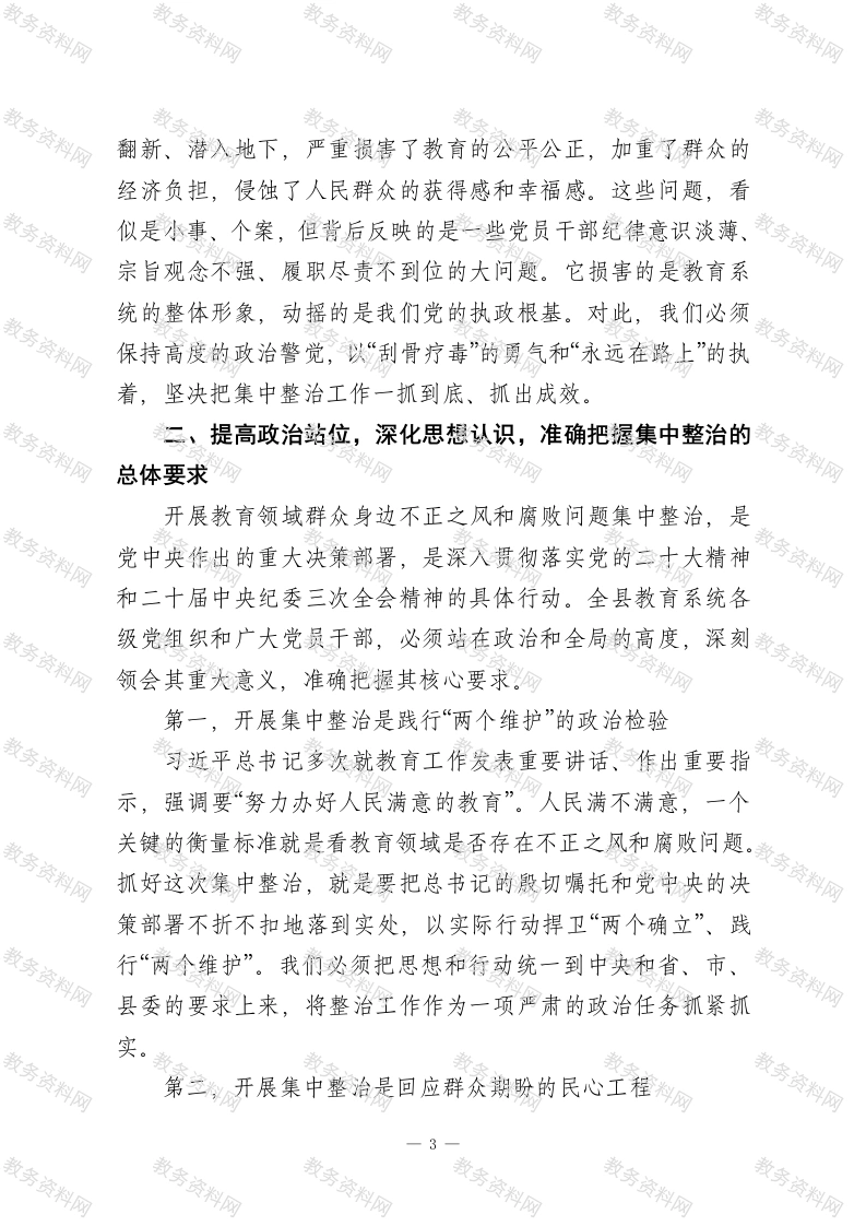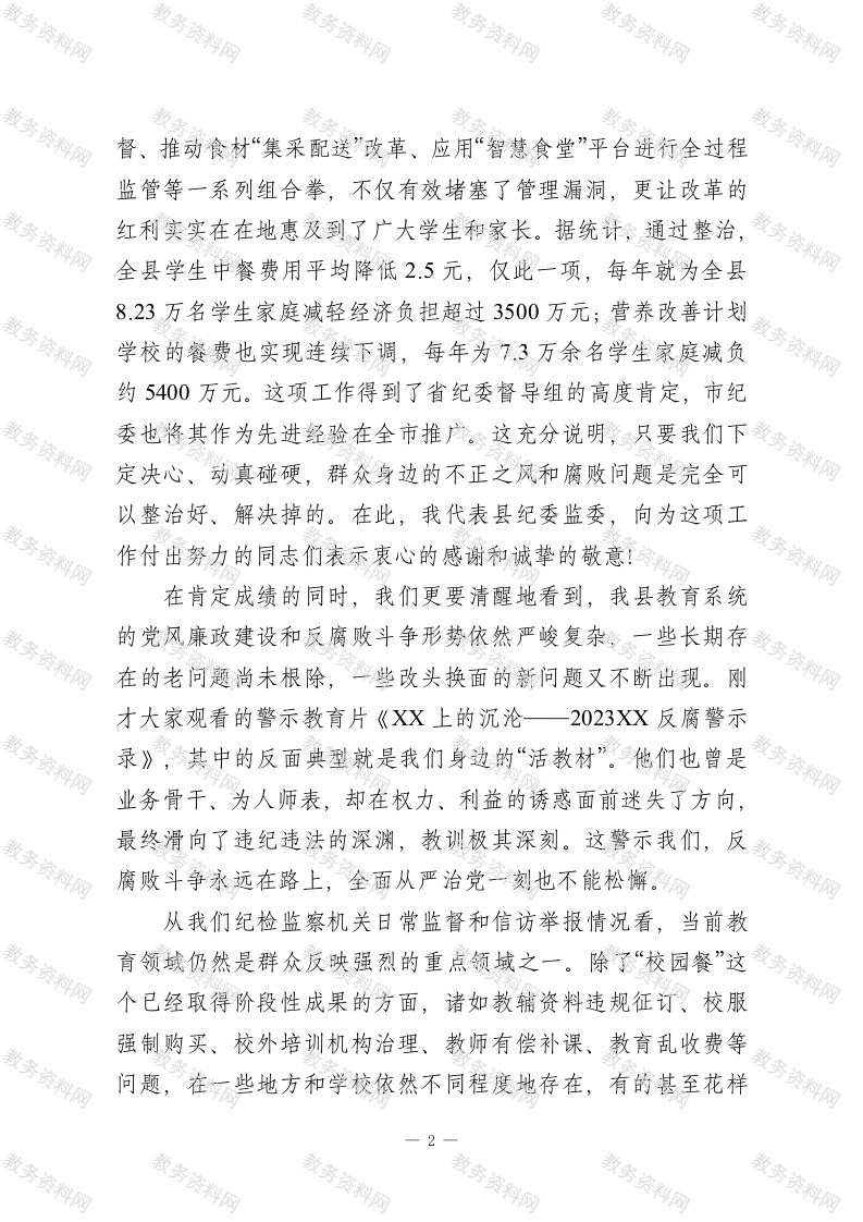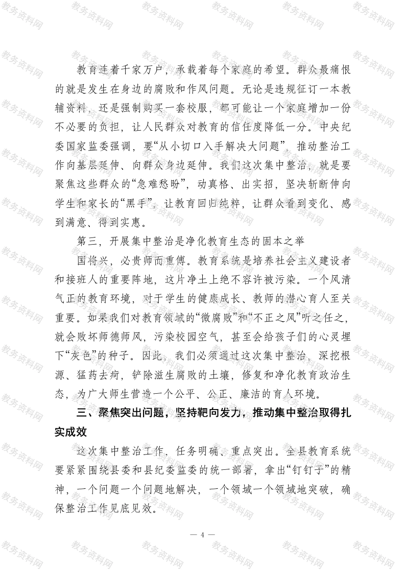 在XX县教育系统集中整治工作会议上的讲话同志们:今天,我们在这里召开全县教育系统群众身边不正之风和腐败问题集中整治工作会议,主要任务是深入学习贯彻中央和省、市、县委关于全面从严治党的决策部署,总结经验、分析形势,对2026年教育系统的集中整治工作进行再动员、再部署。刚才,我们共同观看了一部发人深省的警示教育片,片中一个个真实的案例,就是一声声振聋发聩的警钟,为我们全体与会人员上了一堂严肃而深刻的廉政教育课。希望大家能真正受到警醒、引以为戒。下面,根据会议安排,我讲三点意见。一、肯定成绩,正视问题,切实增强抓好集中整治的责任感和紧迫感教育是国之大计、党之大计,关系着千家万户的幸福和民族的未来。一直以来,县委、县政府高度重视教育事业发展,我们全县广大教育工作者也为此付出了辛勤的努力,取得了有目共睹的成绩。特别是近年来,在全面从严治党向纵深推进的大背景下,县教育局党组能够主动作为,自觉扛起管党治党主体责任,聚焦群众关切,开展了一系列专项治理,取得了良好成效。尤其值得肯定的是,自2023年以来,县教育局在全市范围内率先谋划和强力推进“校园餐”领域突出问题整治,这项工作抓得早、抓得实、抓得深。通过组建联合检查组进行全覆盖监1