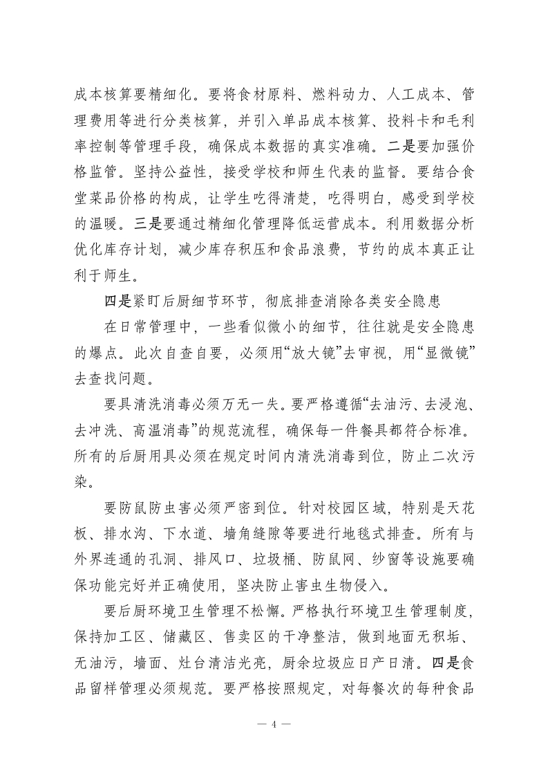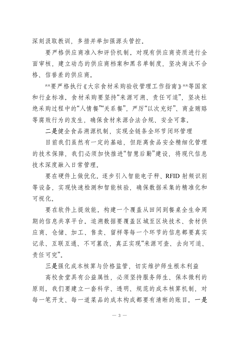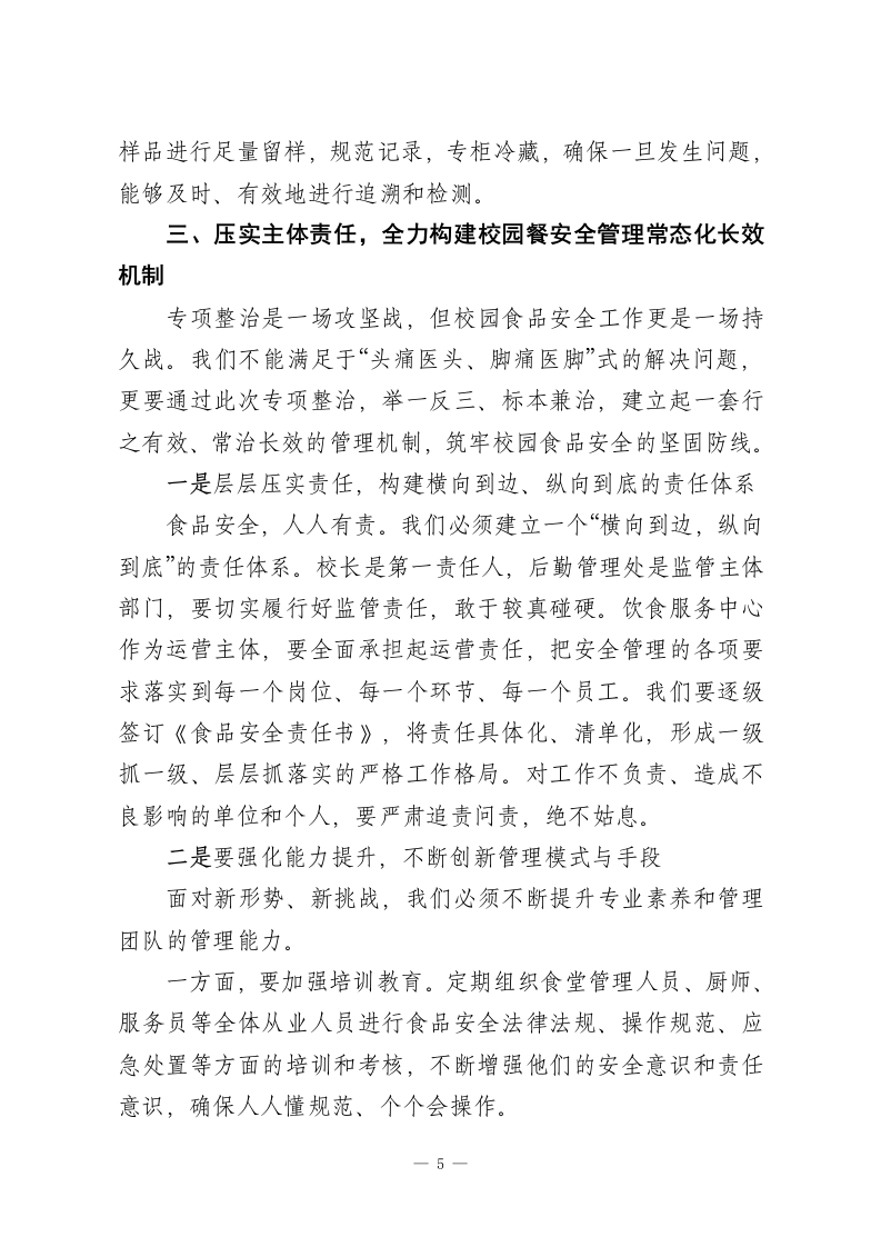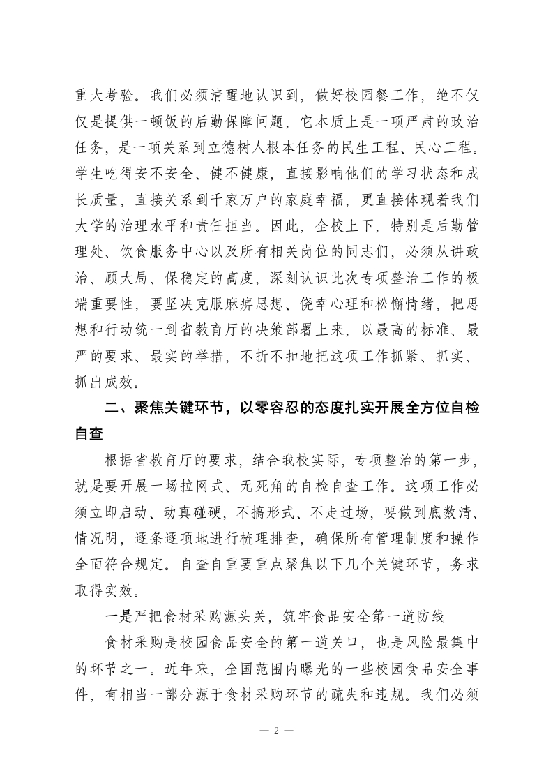 在落实省教育厅校园餐专项整治部署工作会议上的讲话同志们:今天,我们在这里召开XX大学落实省教育厅校园餐专项整治部署工作会议。这是一次关系到全校师生切身利益、关系到学校安全稳定大局的重要会议。会议的主要任务是:深入学习领会并坚决贯彻落实省教育厅关于校园餐专项整治工作的最新精神和部署要求,对我校即将开展的专项整治工作进行全面动员和周密安排。刚才,后勤管理处的XX同志传达了上级文件的相关内容,结合我校实际情况,再讲三点意见,供大家参考。一、提高政治站位,深刻认识校园餐专项整治的极端重要性和现实紧迫性校园食品安全,是事关广大师生身体健康和生命安全的头等大事,是“国之大者”。正如习近平总书记多次强调,要“用最严谨的标准、最严格的监管、最严厉的处罚、最严肃的问责,确保广大人民群众‘舌尖上的安全”。今年是“十四五”规划的关键之年,也是食品安全治本攻坚的收官之年。对于高校而言,食品安全更是校园安全的重中之重。当前,教育部等六部门联合发文,持续推进校园食品安全问题,强调要加强全链条监管,严查利益输送和贪腐行为,坚决维护师生和家长的合法权益。校党委、省教育厅此次部署的专项整治工作,正是贯彻落实国家决策部署的具体行动,也是对我们办学治校能力的一次1