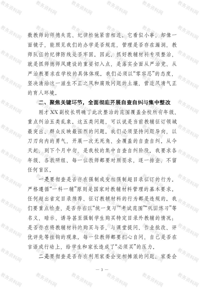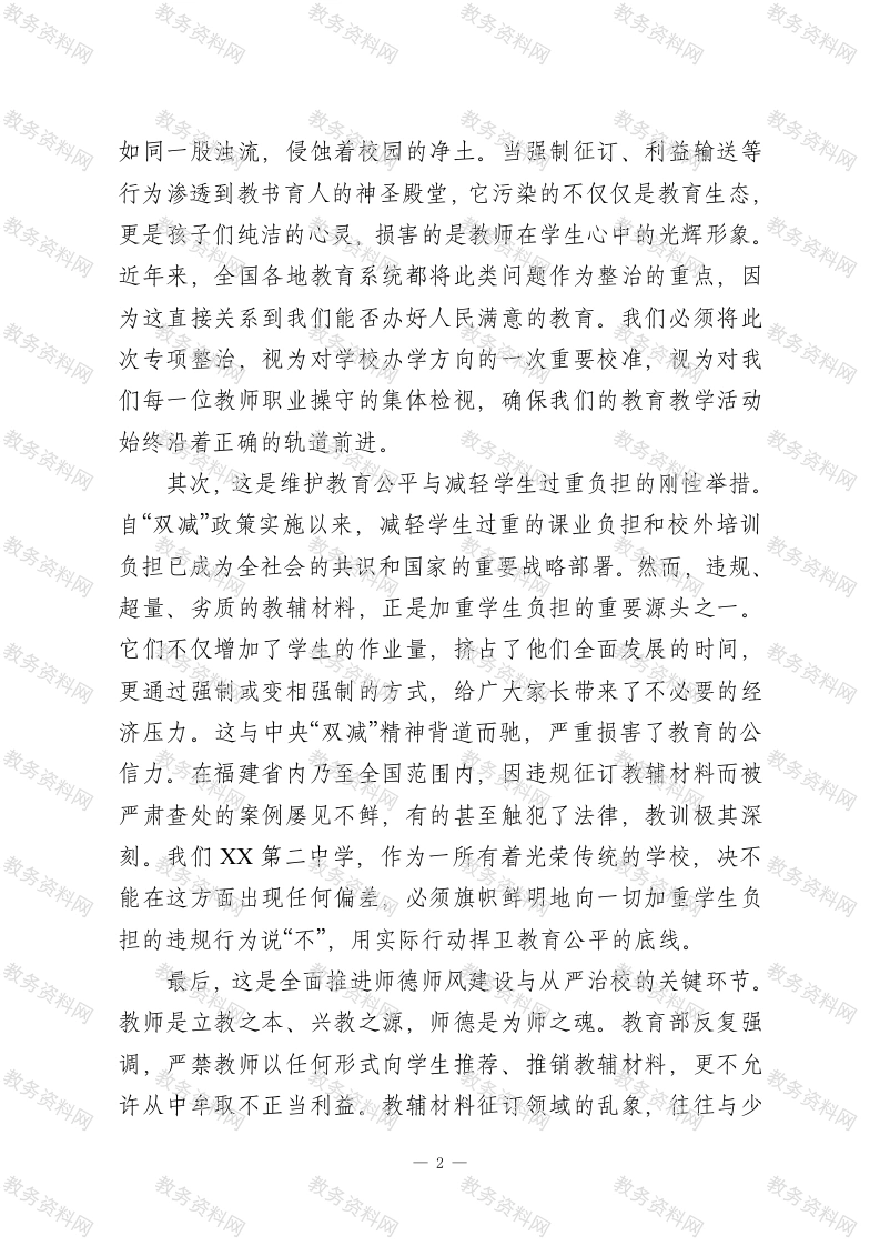 在全校纠治征订教辅乱象专项整治工作部署会议上的讲话同志们:今天,我们在这里召开一次意义重大、任务明确的全校性工作会议。会议的主题,就是全面贯彻落实XX市教育局关于纠治征订教辅乱象专项整治的工作部署,对我校的相关工作进行总动员和总安排。刚才,X副校长已经向大家传达了上级会议的核心精神,并详细解读了教育部关于教辅材料管理的“八坚持、八严禁”政策要求,为我们接下来的行动划定了清晰的政策红线和行为底线。在此,我代表学校领导班子,就如何深刻领会、坚决执行上级决策,扎实有效、不折不扣地推进我校专项整治工作,讲三点意见。一、提高政治站位,深刻认识专项整治的紧迫性与重要性同志们,我们必须清醒地认识到,规范教辅材料征订工作,绝不仅仅是一个业务问题、管理问题,它本质上是一个严肃的政治问题、纪律问题,是关系到教育公平、师德师风、群众利益的重大原则问题。我们每一位教职员工,尤其是党员干部和年级组长,都必须从更高的高度、更深的层次来理解和把握这项工作的极端重要性。首先,这是践行立德树人根本任务的必然要求。教育的根本宗旨是为党育人、为国育才。我们培养的是社会主义的建设者和接班人,这个过程必须是纯粹的、干净的。教辅材料乱象,1