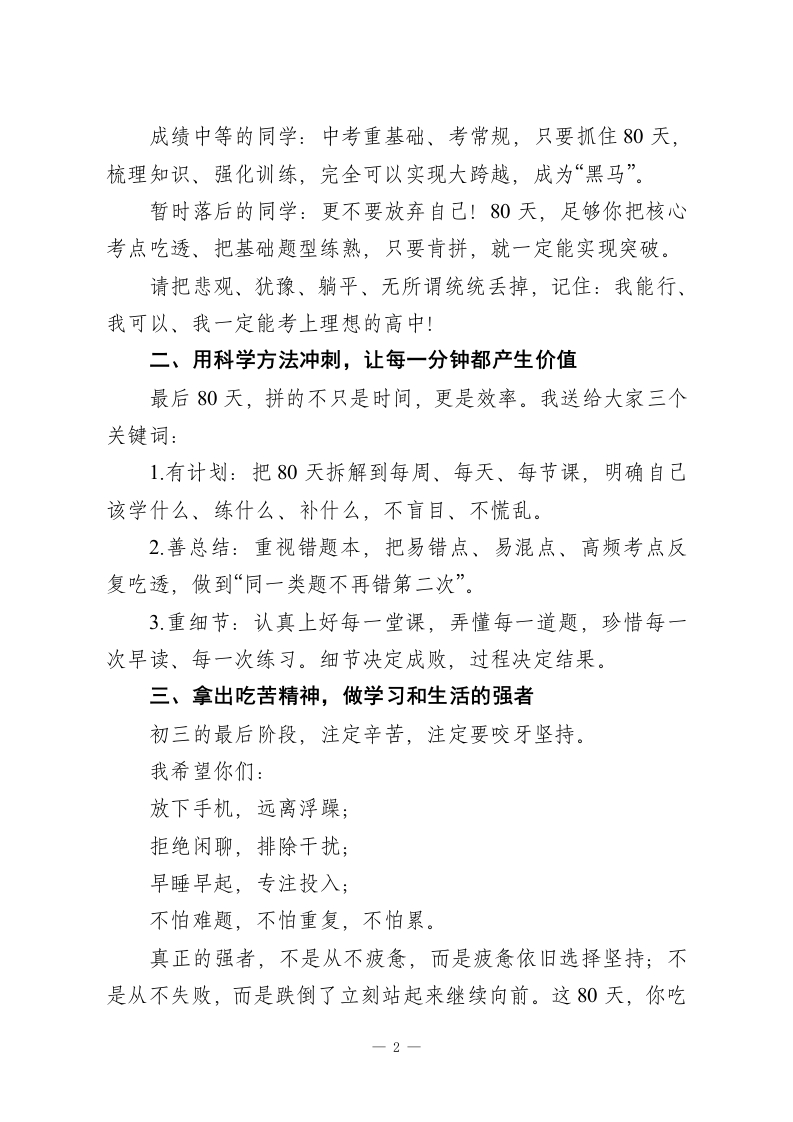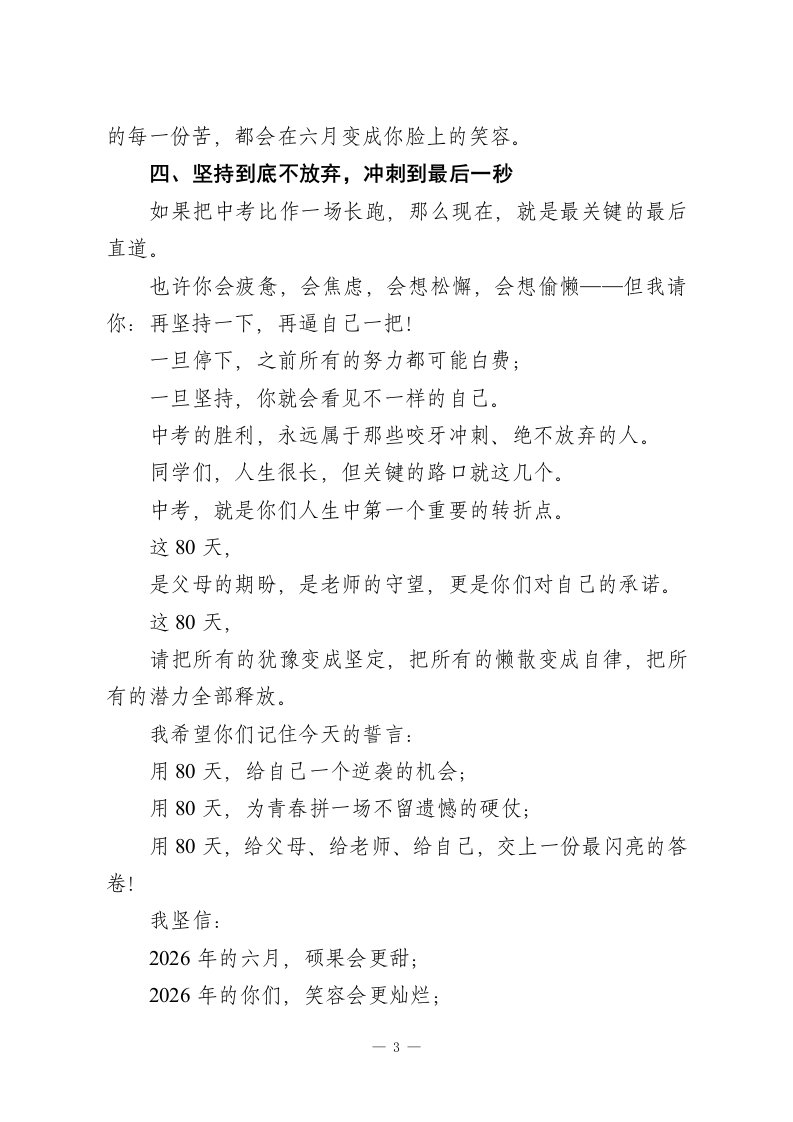 中考倒计时80天誓师大会校长讲话:以八十日拼搏,赴六月之约尊敬的老师们、亲爱的同学们:大家下午好!刚才听完老师们的嘱托、同学们的誓言,我内心满是感动与期待。今天,我们齐聚在这里,举行2026年中考倒计时80天誓师大会。这不是一次普通的集会,而是一场出征的号角,是一次冲刺的动员,更是我们向着梦想全力进发的庄严起点。三年前,你们带着青涩与憧憬走进校园;三年里,你们在课堂上深耕,在书海里跋涉,在错题中成长,在坚持中蜕变。转眼间,初中三年的时光,只剩下最后的80天。80天很短,短到转瞬即逝;80天很长,长到足以改写命运、创造奇迹。今天,我想和大家说:不要小看这80天,它可以让你查漏补缺、迎头赶上;可以让你夯实基础、突破瓶颈;更可以让你逆风翻盘、惊艳所有人!在此,我向全体初三同学,提四点最真切、最实用的希望:一、坚定必胜信念,把“我能行”刻进心里信心,是中考成功的第一秘诀。经过这么久的复习打磨,你们已经有了扎实的基础;你们身后,有一支经验丰富、全程陪伴、全力托举的教师队伍,他们和你们同甘共苦、日夜相伴。成绩优秀的同学:不骄傲、不自满,补齐短板、强化优势,追求更稳、更准、更高。-1