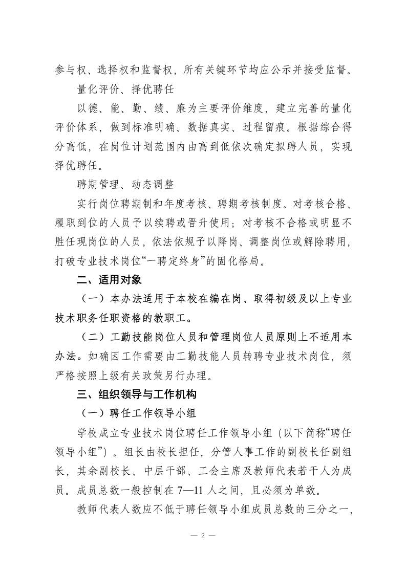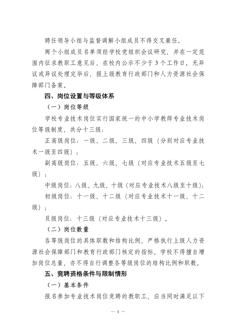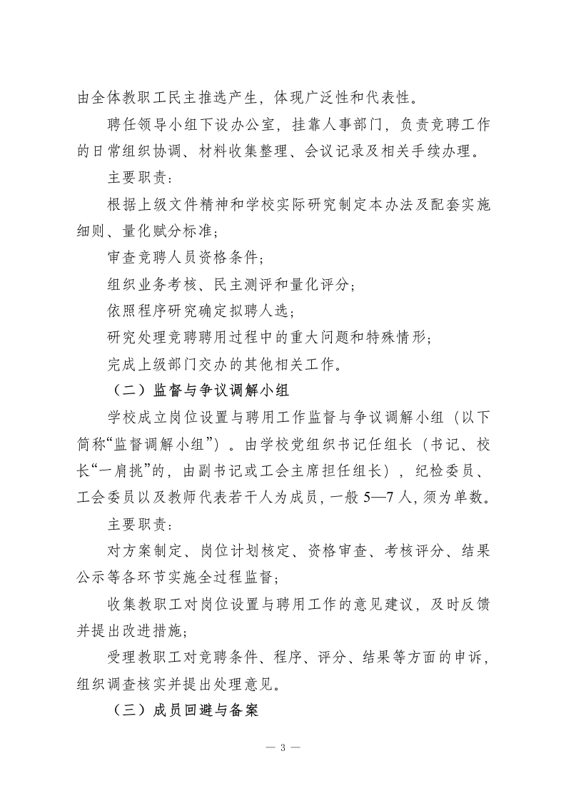 中小学教师职称评审推荐方案(2026年修订)2为深入推进学校人事制度改革,规范专业技术岗位设置与聘用管理,构建“以岗用人、公开竞聘、能上能下、合理流动”的用人机制,充分激发教职工工作积极性和创造性,根据上级教育行政部门和人力资源社会保障部门关于中小学岗位设置管理的有关规定,结合本校实际,制定本办法。一、总体要求与基本原则(一)总体要求坚持以国家和地方事业单位人事管理、中小学岗位设置管理政策为依据,以促进教师队伍建设和提升教育教学质量为核心目标。通过规范岗位设置、公开竞聘上岗和聘期考核,形成岗位管理的长效机制,实现岗位结构合理、人员配置优化、使用和流动有序。(二)基本原则以岗定人、总量控制严格按照上级核定的岗位总量、结构比例和具体职数设置和使用岗位。凡开展竞聘的岗位必须在核准的空岗范围内进行,不得出现无岗聘用、超岗聘用和突破结构比例的情形。公开公正、程序规范竞聘工作全过程坚持公开、公平、公正,严格按照事先公布的条件、程序和标准组织实施。充分保障教职工的知情权、一1
