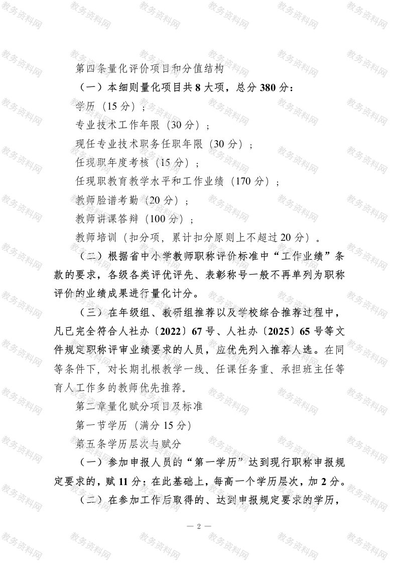 中小学教师中高级专业技术职务任职资格申报推荐量化赋分细则第一章总则第一条制定目的和依据为规范我校中小学教师中、高级专业技术职务任职资格申报与推荐工作,提升职称工作公开程度、公平性和公信力,切实维护申报教师的合法权益,依据省中小学教师职称制度改革有关文件精神和《省人力资源和社会保障厅关于印发(省中小学教师职称评价标准〉的通知》(人社办〔2022]67号、人社办〔2025]65号),结合我校教育教学实际,制定本实施细则。第二条适用范围本细则适用于我校在岗中小学教师申报中级、一级和高级专业技术职务任职资格过程中,校内的资格审查、量化赋分、推荐排序等环节。第三条基本原则(一)坚持公开、公平、公正原则,程序规范,结果可查询、可监督。(二)坚持德才兼备、以德为先,突出教育教学一线实际业绩。(三)坚持量化与综合评价相结合,既重视数据,又保留必要的综合研判。(四)坚持与省、市职称政策相衔接,与学校岗位设置和队伍建设需要相协调。一1