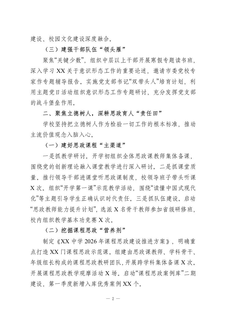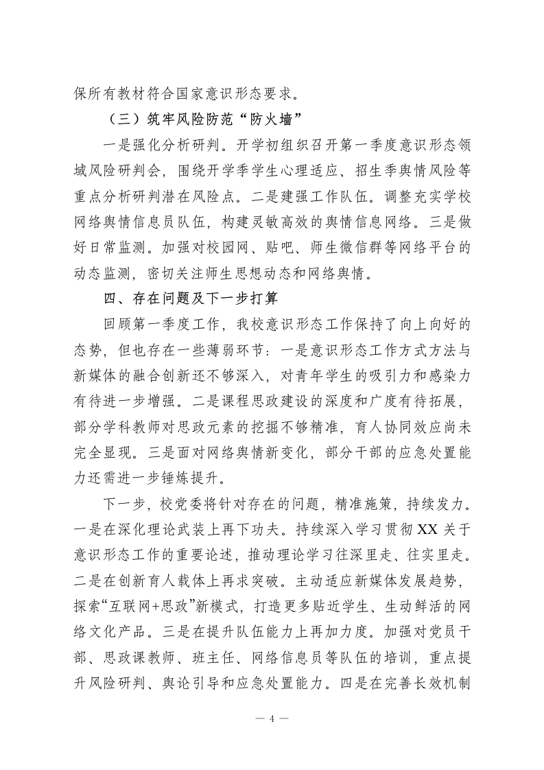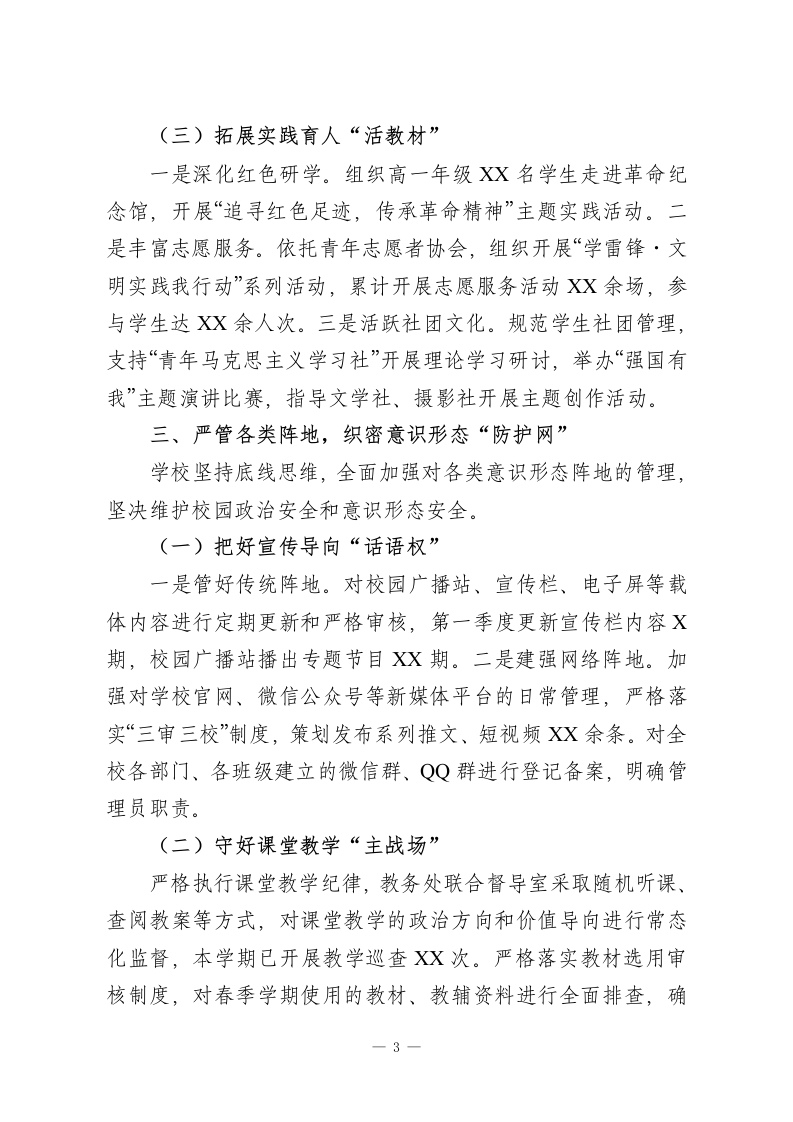 XX中学第一季度意识形态工作总结第一季度以来,我校党委坚持以XX思想为指导,深入学习贯彻党的二十大及二十届历次全会精神,紧紧围绕立德树人根本任务,从严从实抓好意识形态各项工作,切实筑牢校园意识形态安全屏障,为学校各项事业发展奠定了坚实思想基础。现将第一季度意识形态工作情况总结如下。一、强化政治引领,把稳办学治校“方向盘”学校党委始终坚持把意识形态工作摆在突出位置,牢牢掌握工作的领导权、管理权和话语权。(一)牵住责任落实“牛鼻子”校党委坚决扛起主体责任,将意识形态工作纳入年度重点工作计划。党委书记认真履行第一责任人职责,主持召开意识形态工作专题部署会X次,研究制定《XX中学2026年意识形态工作要点》,明确年度工作任务。领导班子成员严格落实“一岗双责”,在部署分管领域工作时同步强调意识形态工作要求。校党委与各党支部、各处室、各年级组层层签订《2026年度意识形态工作目标责任书》XX份,确保责任传导到位。(二)筑牢制度机制“压舱石”校党委根据上级最新精神和学校实际,修订完善了《XX中学意识形态工作责任制实施细则》,进一步细化责任清单、任务清单和负面清单。健全意识形态工作分析研判机制,明确每季度召开一次风险研判会。开学初,校党委制定并启动“思政育人提质增效年”活动,将意识形态工作与思政课建设、师德师风1-